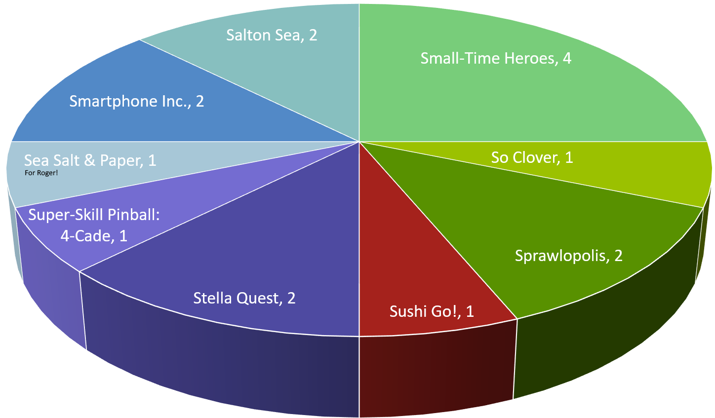 Other than that, managed to get Tyrants of the Underdark on the table, and a bunch of games of Battle for Hoth, which was nice and fast. But overall, not a lot of games in the month… I wonder if November is going to be better, now that I don’t work at a game store and am exhausted and stressed for Nov-Dec? We shall see!