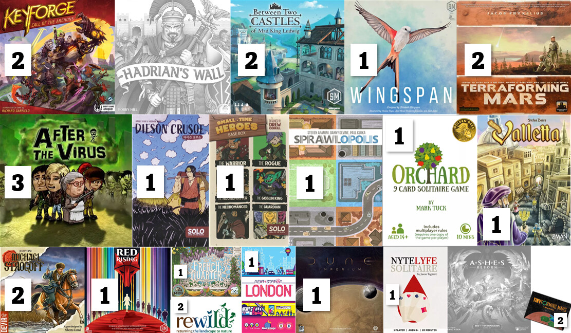 I picked up the newest expansion for Lost Ruins of Arnak, and I have two small card games on pre-order… but yeah, not a huge amount… oh, other than Twilight Imperium 4 Thunder’s Edge. Very excited about that one!