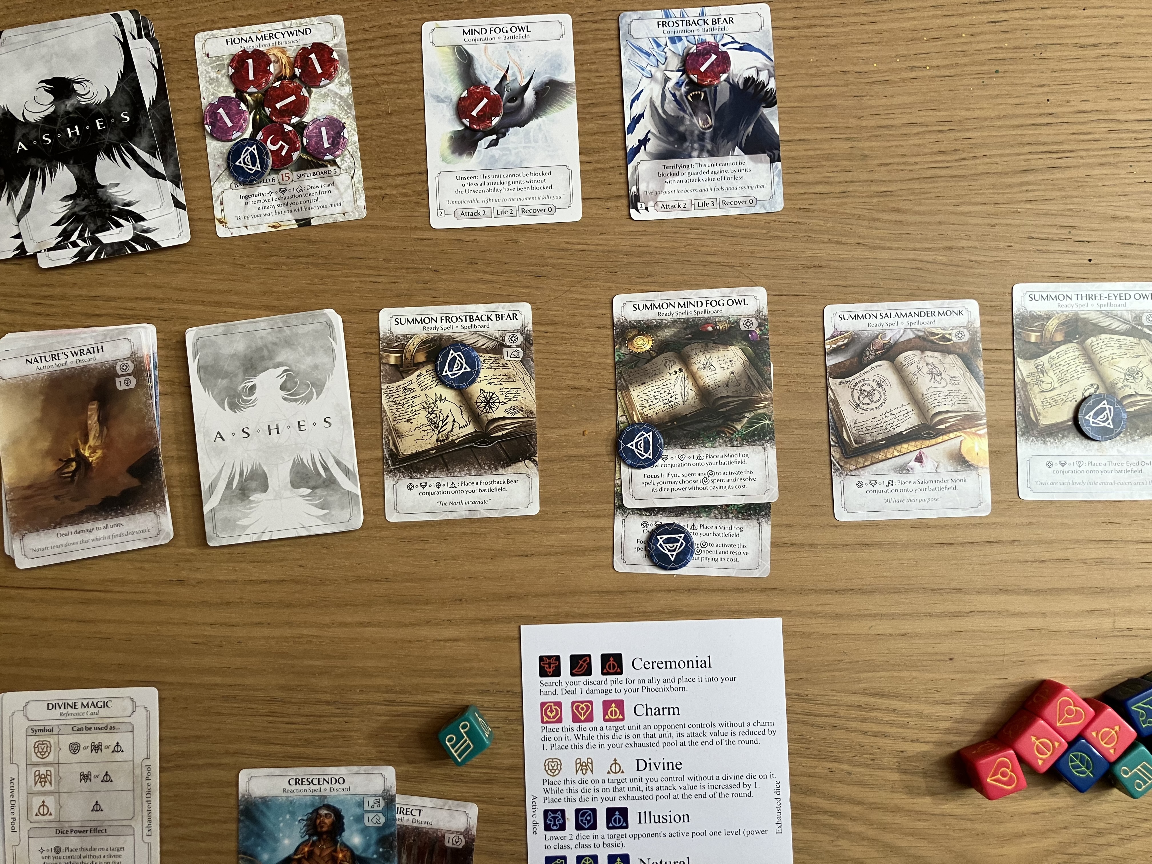 Main: exhaust ‘summon mind fog owl to do so’. Use a heart and a fox - because of the ‘focus’ on the summon spell i can now put a fox on a unit of yours - I will drop it on the celestial knight, dropping her attack to 2 (from 3).