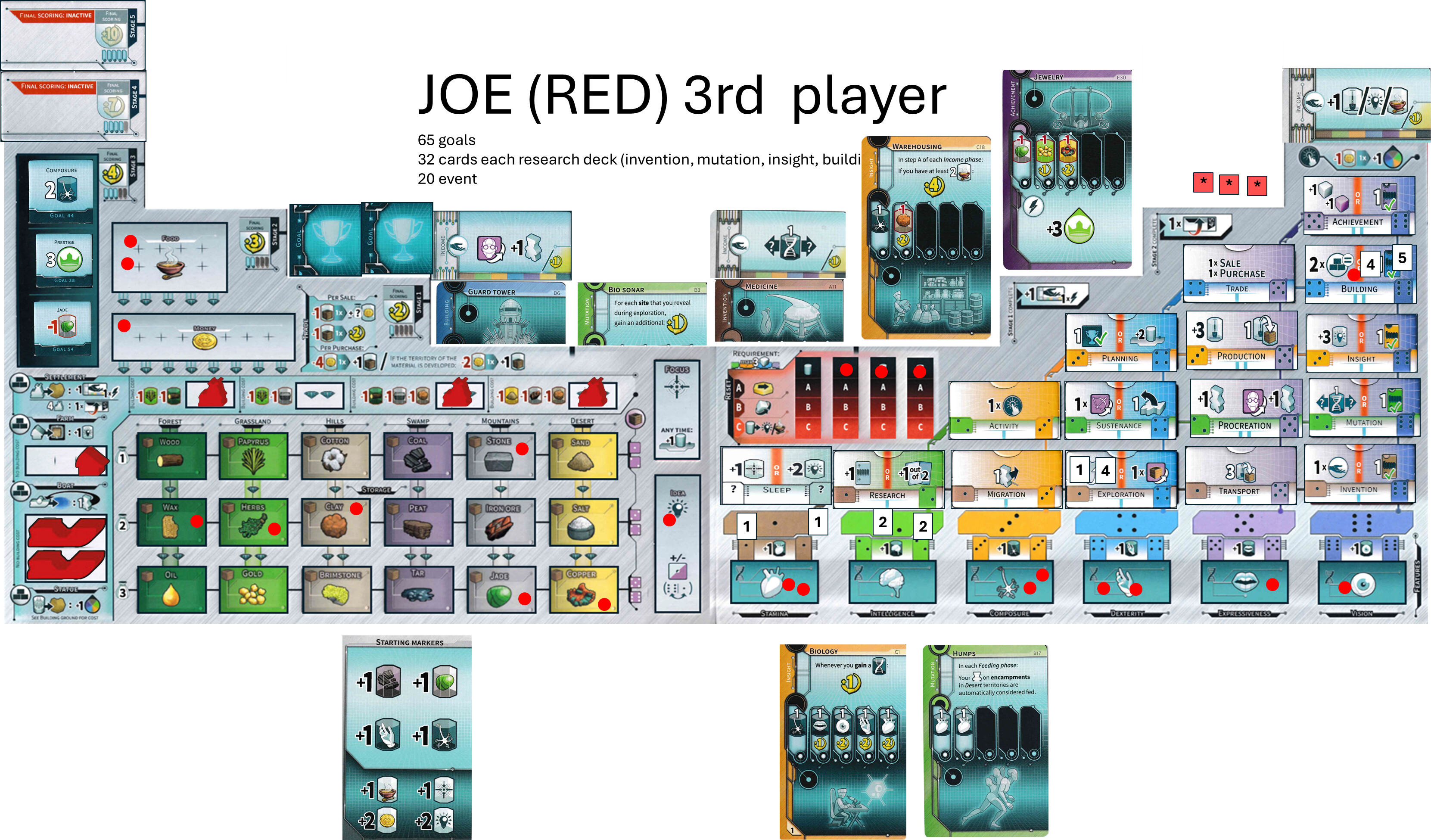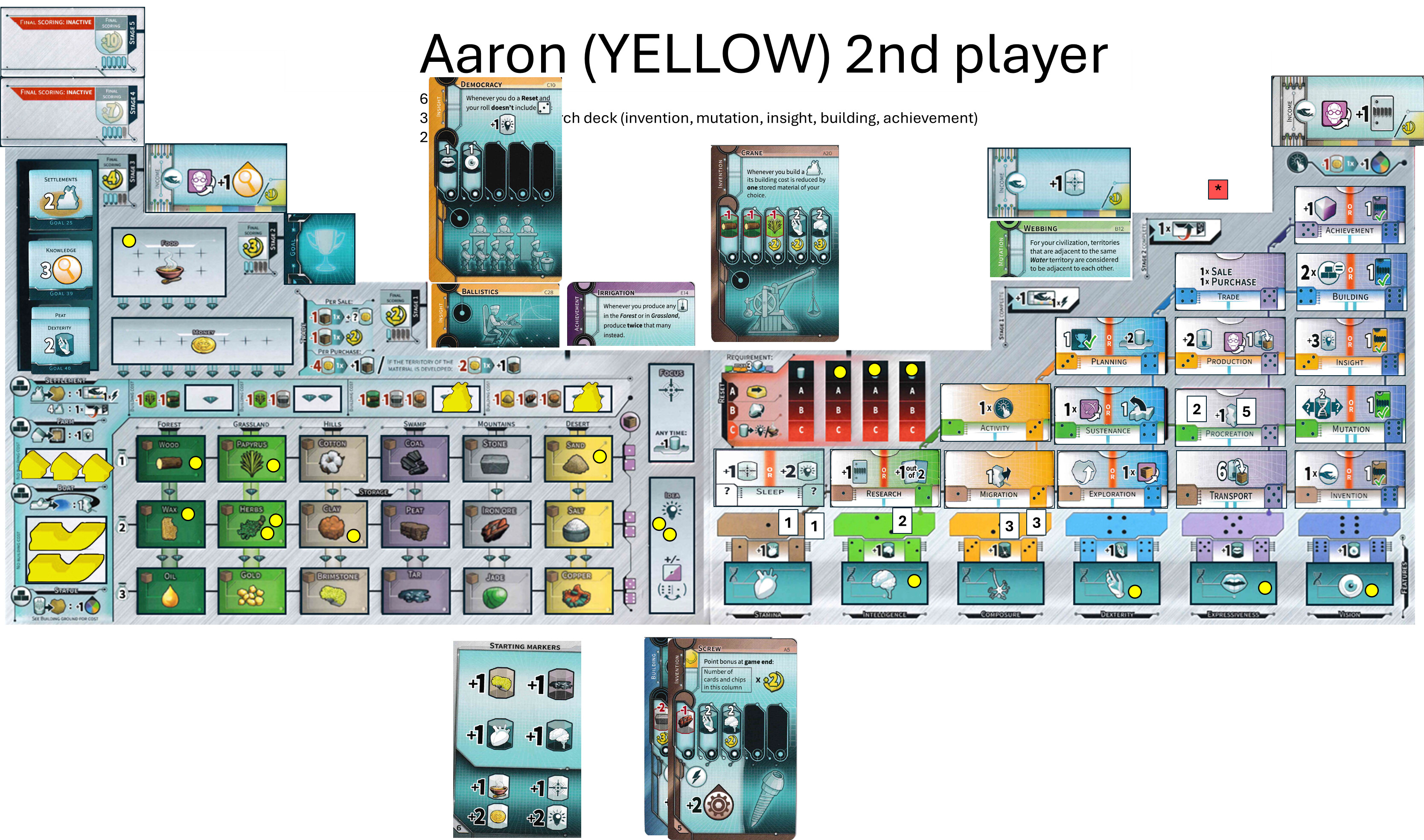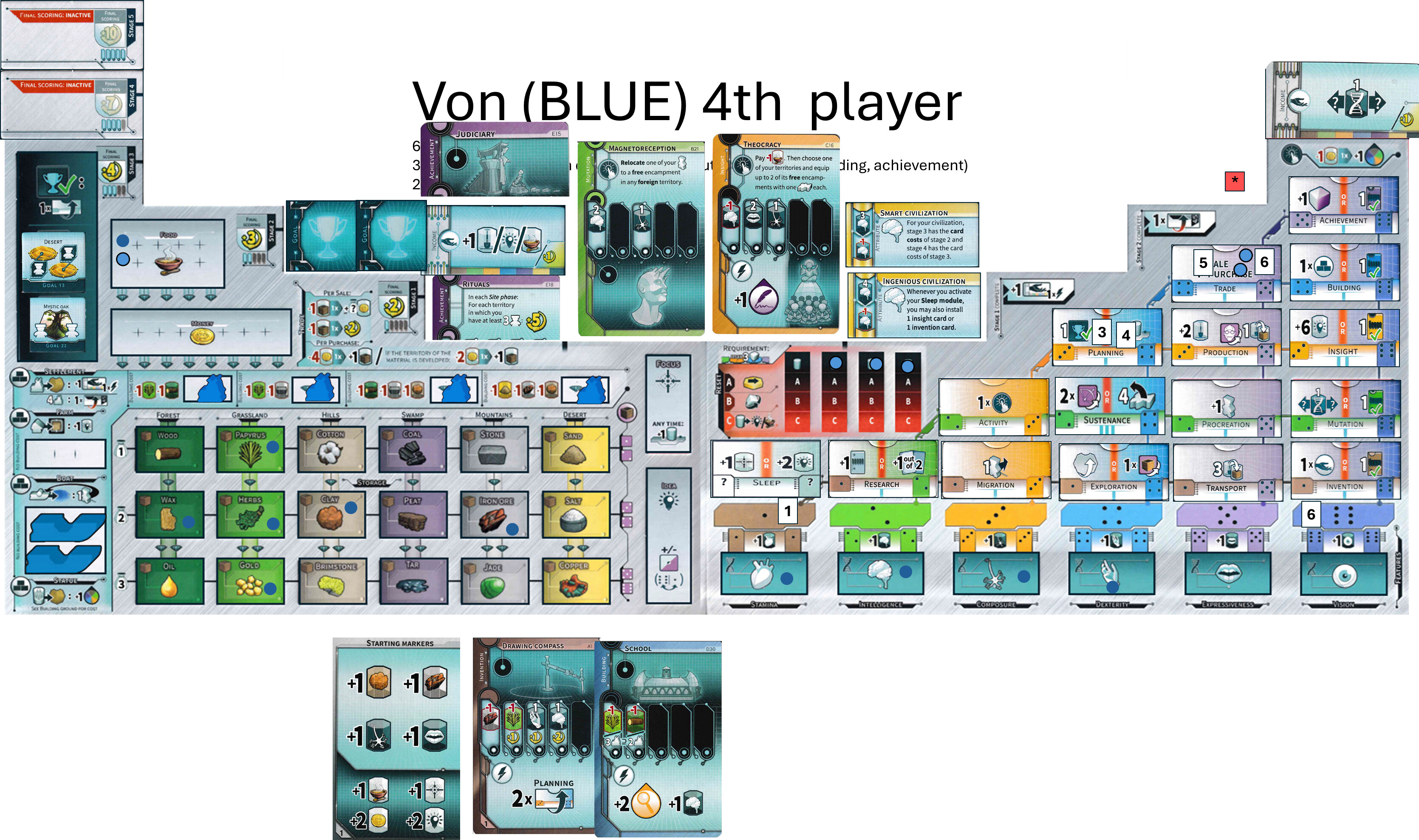Use a 6 & a 1 to sleep and gain 2 ideas, using ingenious to install my drawing compass to complete row 2… spending an Iron Ore & Papyrus, gaining 1 point… flipping planning to stage 3 and flipping my stage 4 final scoring tile.