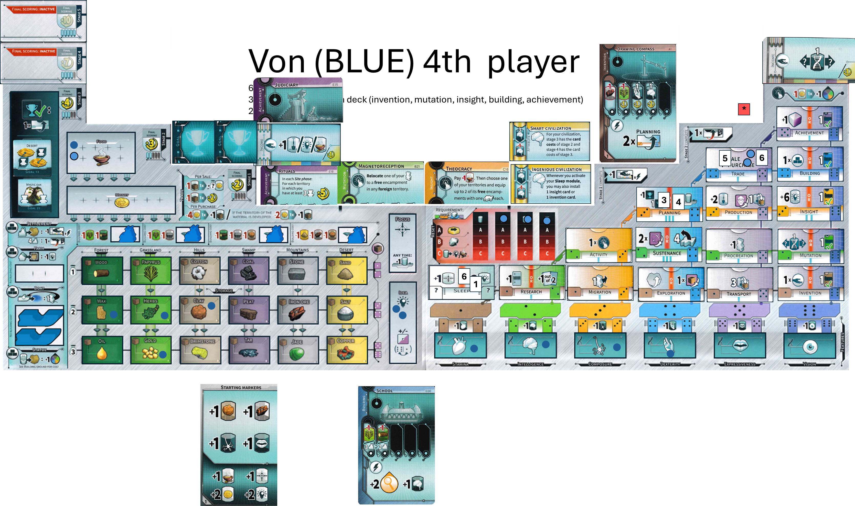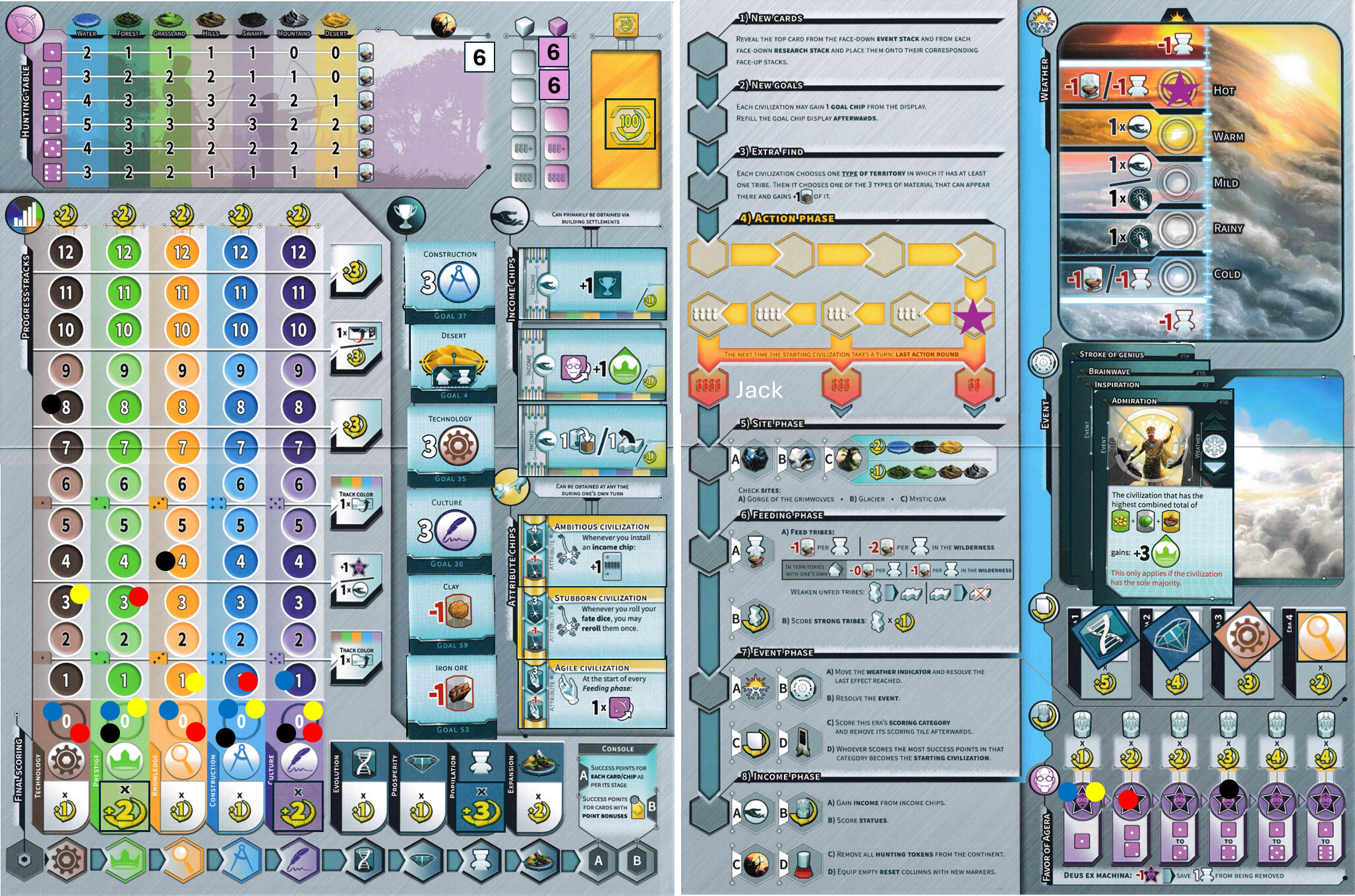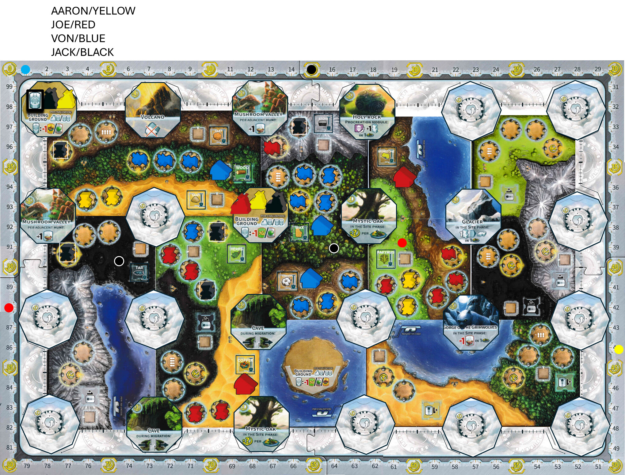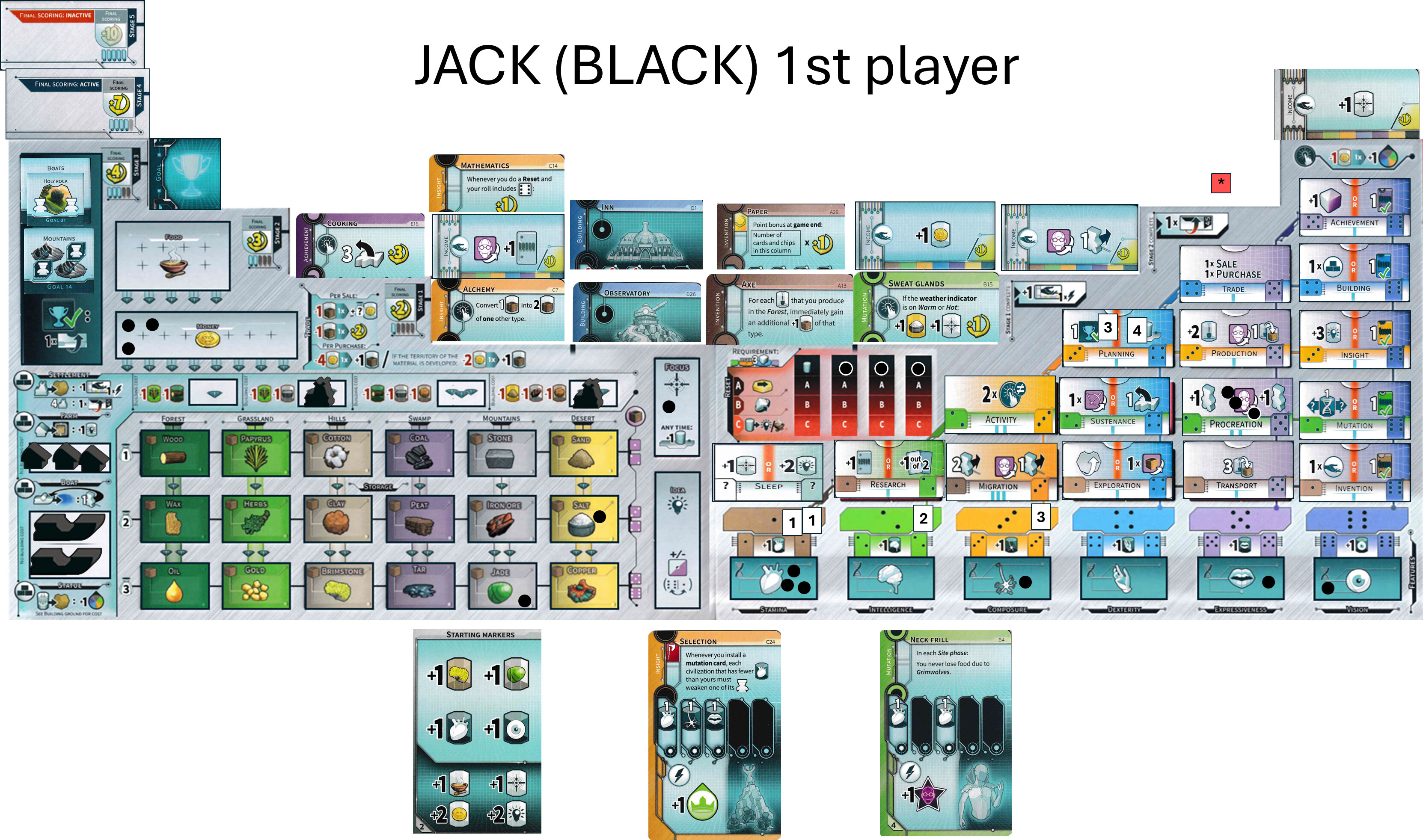 Use a 6 & a 1 to sleep and gain 2 ideas, using ingenious to install my drawing compass to complete row 2… spending an Iron Ore & Papyrus, gaining 1 point… flipping planning to stage 3 and flipping my stage 4 final scoring tile.