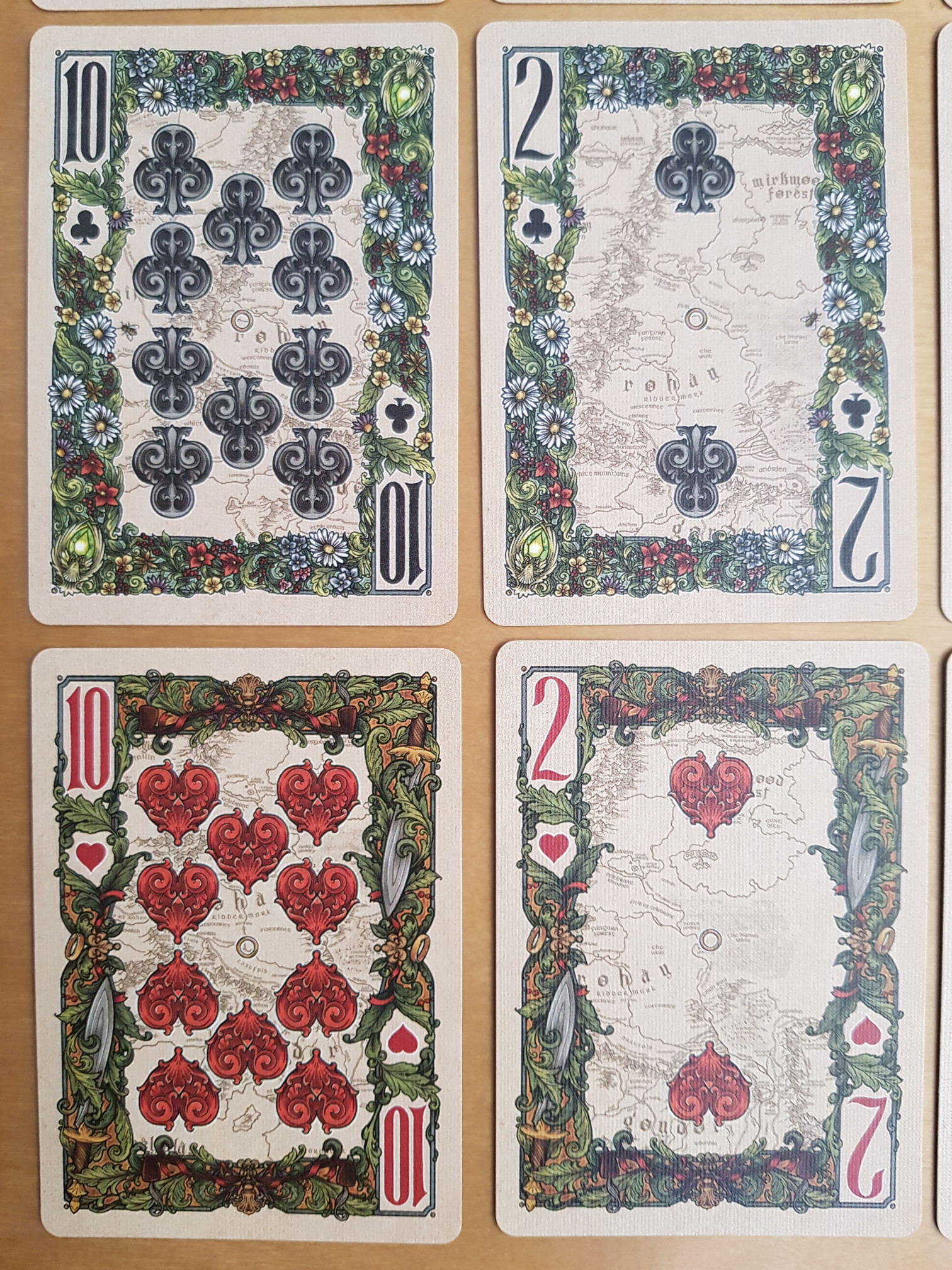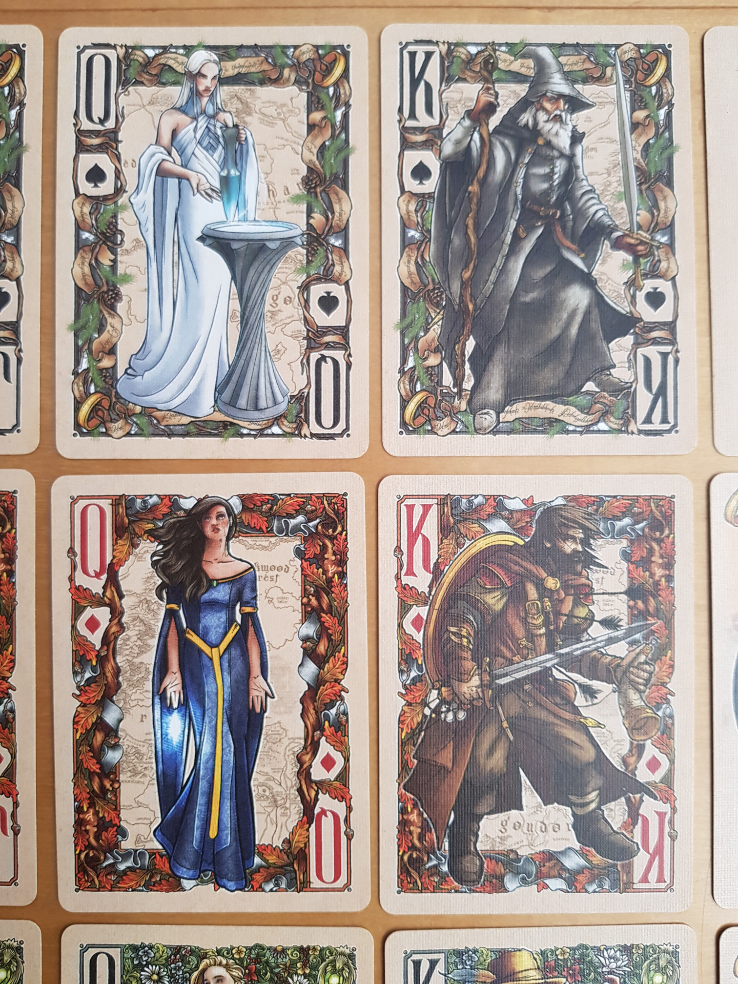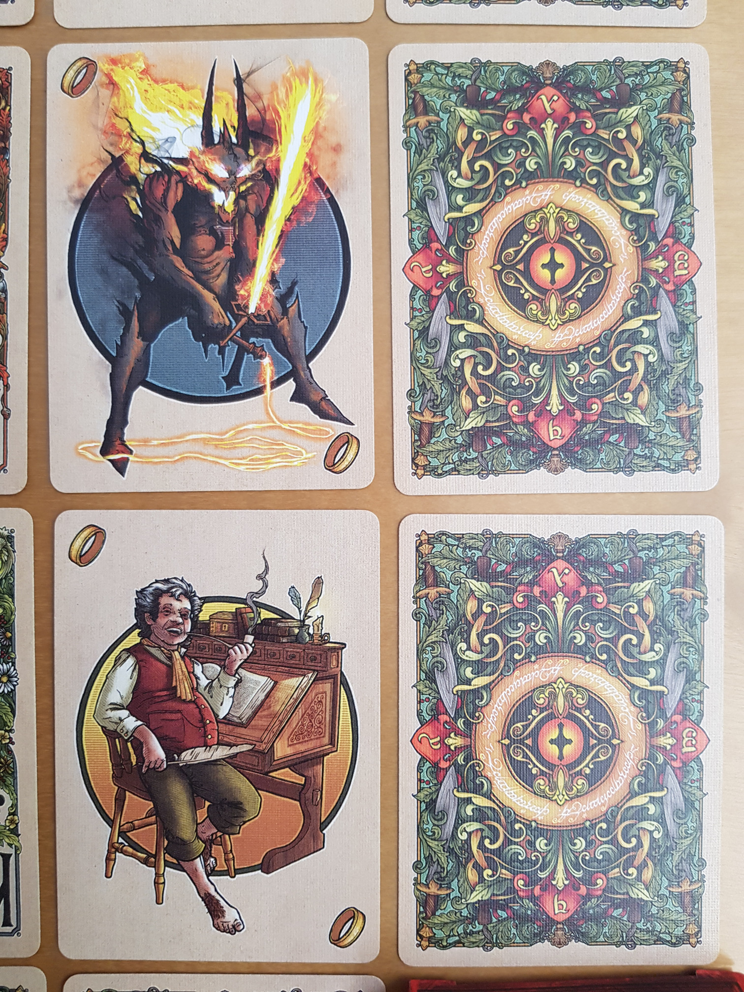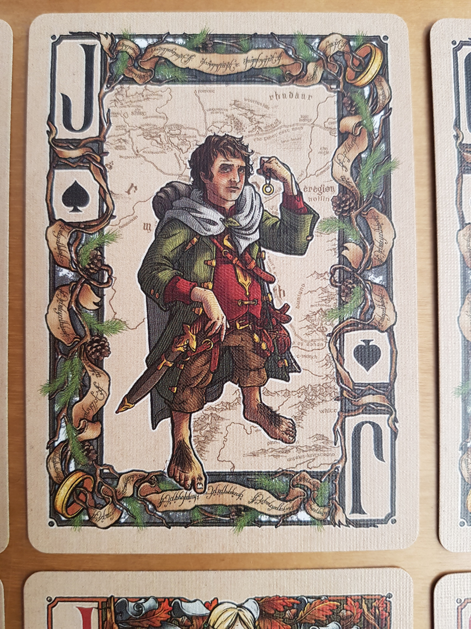I think this deck is extremely pretty, and the art is too detailed for the overview, so I’ve added a bunch of closer looks. (Although the official site has excellent quality images at The Fellowship of the Ring™ Playing Cards – just open the embedded images in a separate tab, or download them, to see them full-sized. Most of mine are comparatively fuzzy.)