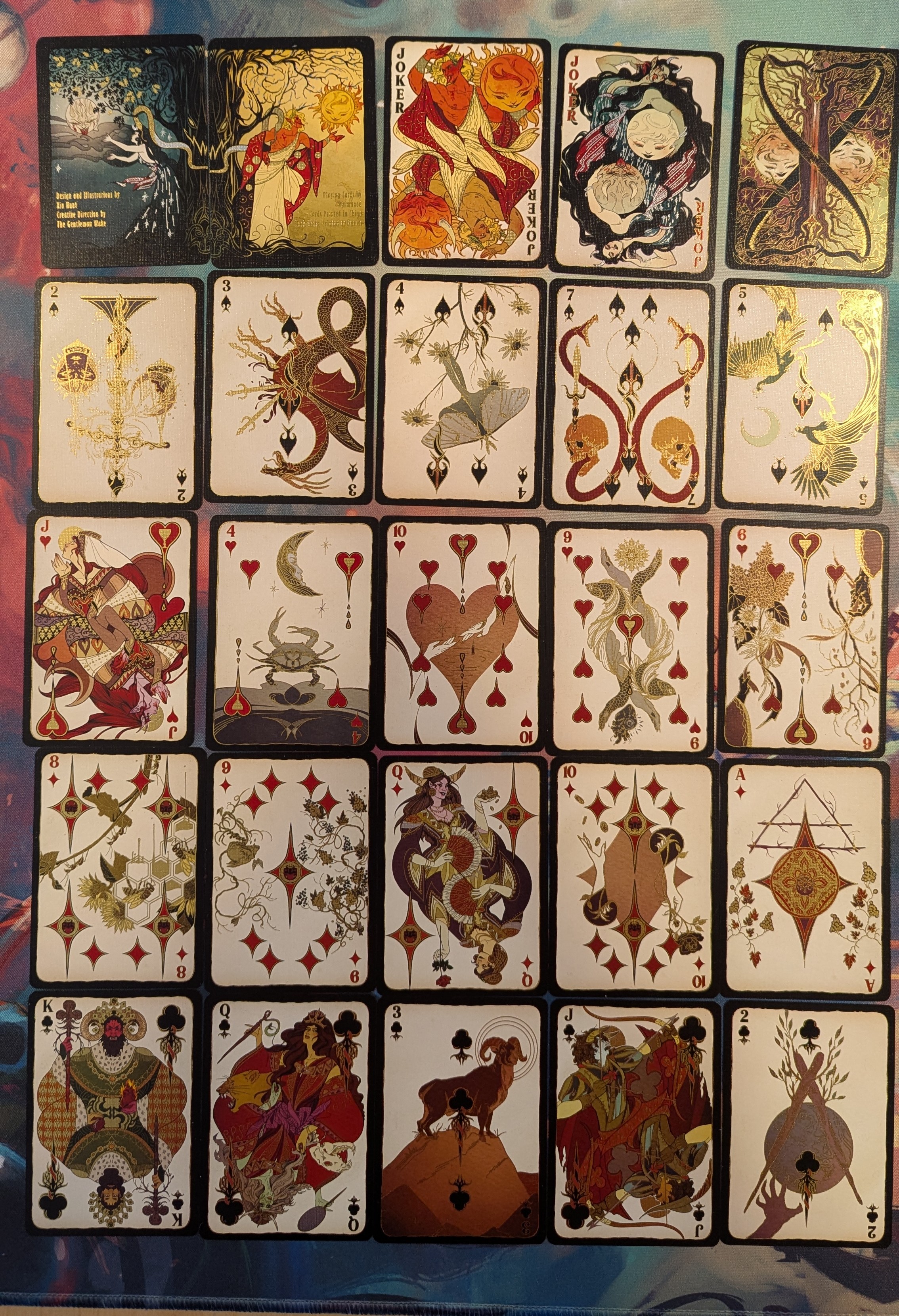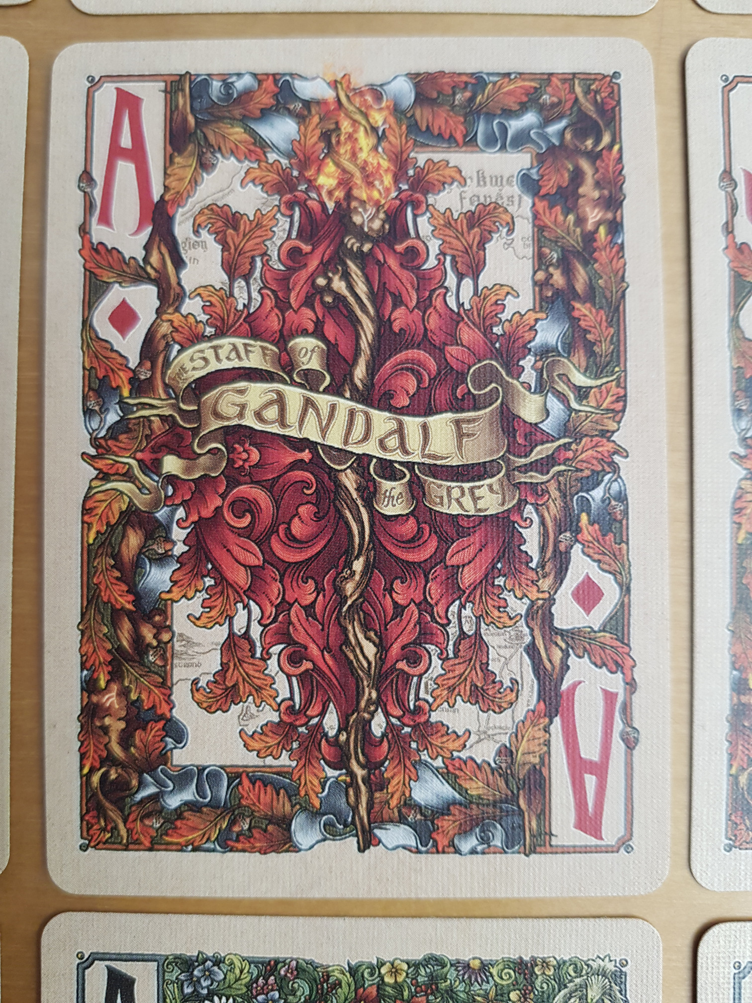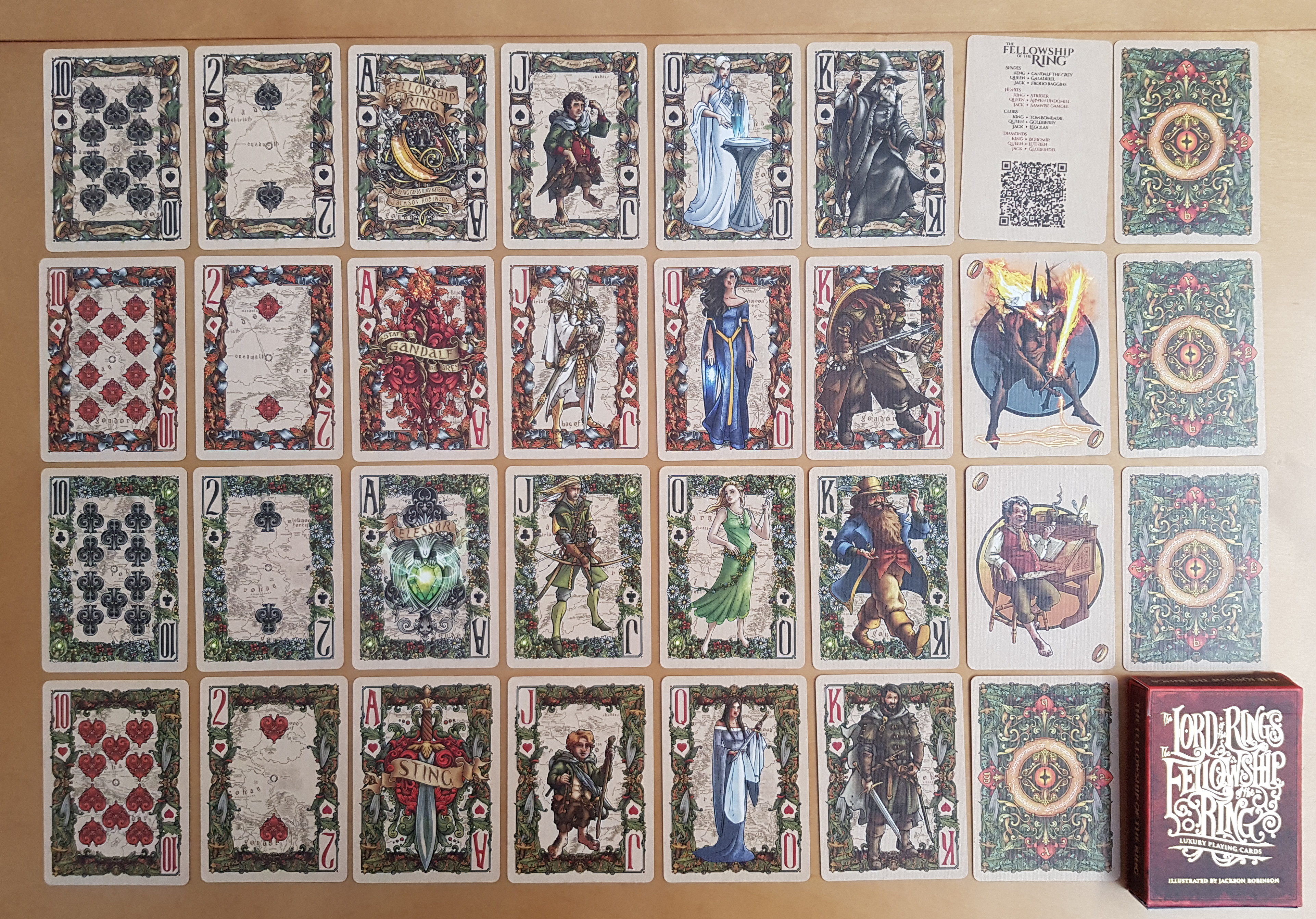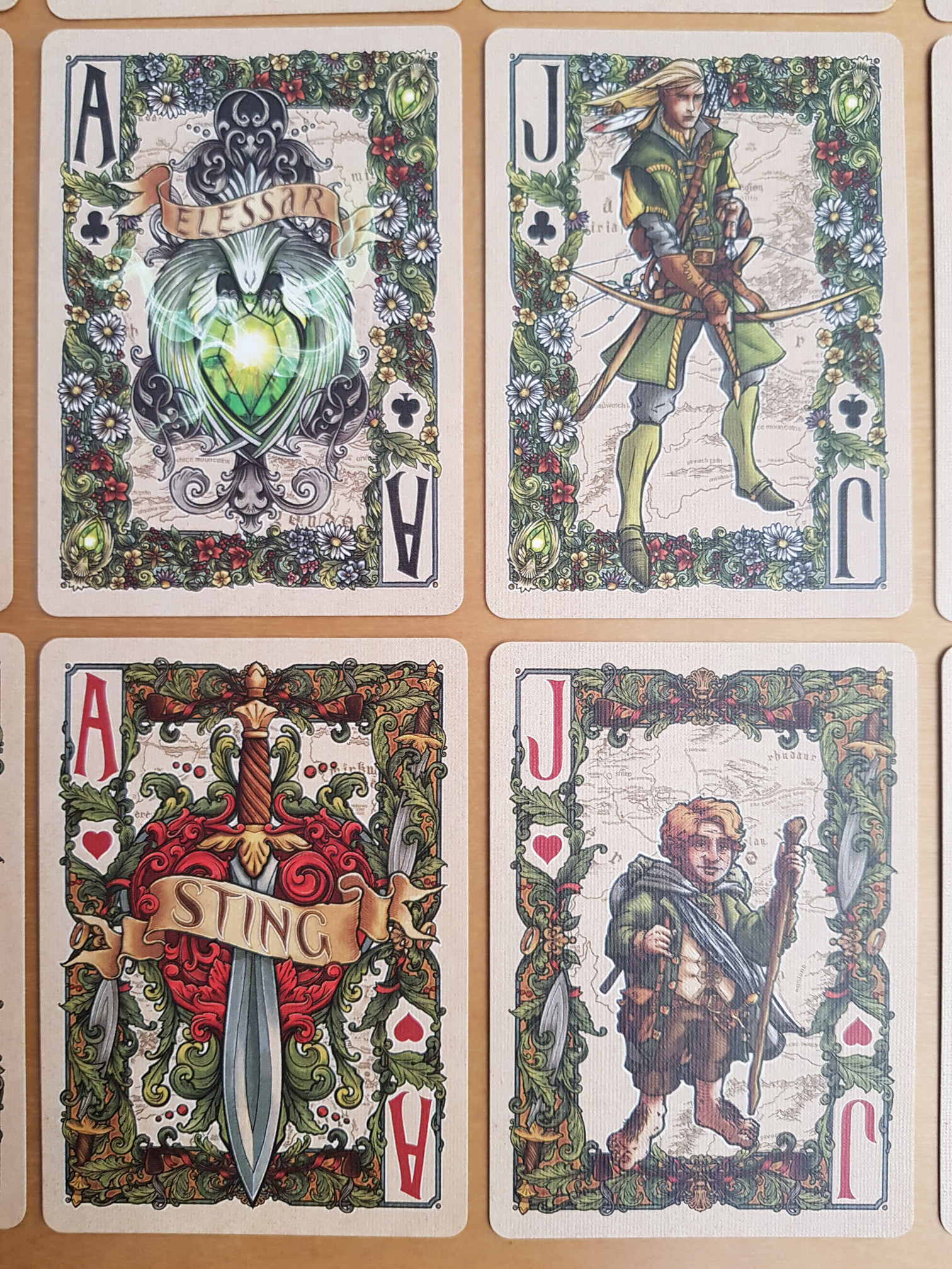 I think this deck is extremely pretty, and the art is too detailed for the overview, so I’ve added a bunch of closer looks. (Although the official site has excellent quality images at The Fellowship of the Ring™ Playing Cards – just open the embedded images in a separate tab, or download them, to see them full-sized. Most of mine are comparatively fuzzy.)