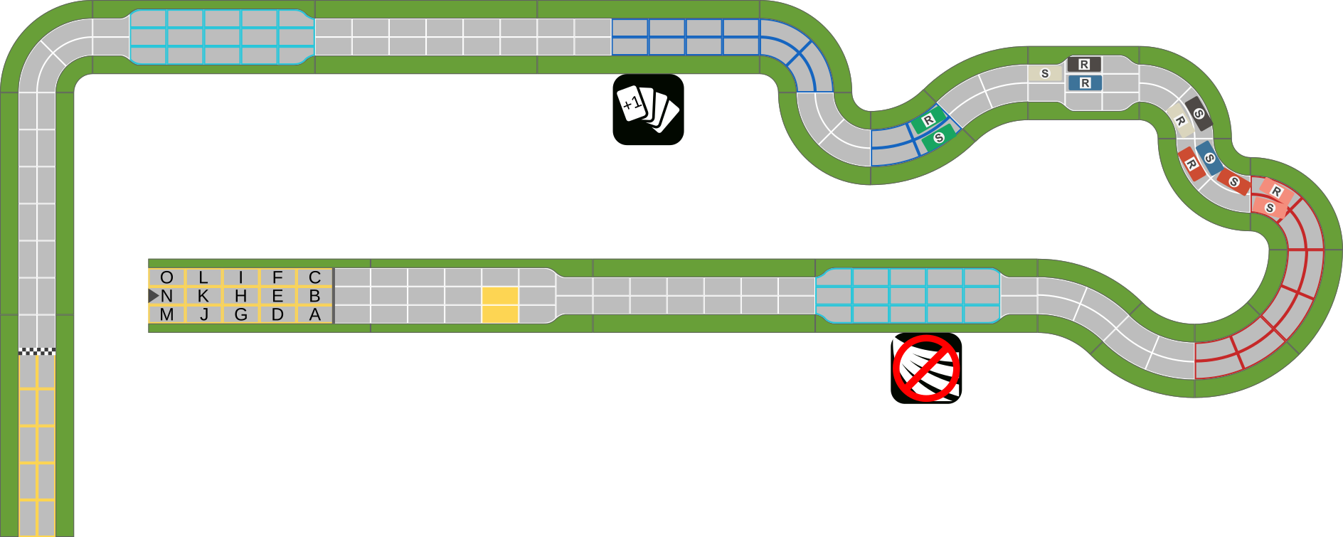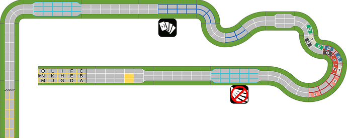 For anybody wondering, this one is now 2 spaces longer than our cobbles-stage, which some/most of us thought was a bit too long. It would mean that any sprinteur must get a minimum net worth of 8 in free movement to reach the finish (a sprinteur starting deck w/o exhaustion has a total value of 69). That seems too harsh to the sprinteur-chances to me. But please say it if you don’t agree of course