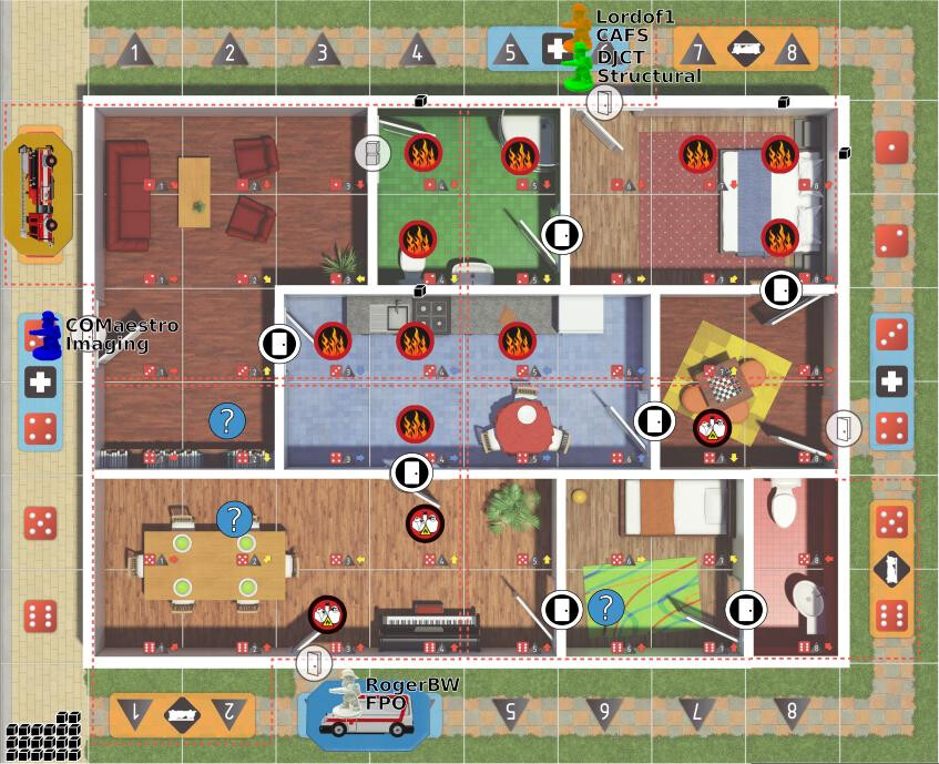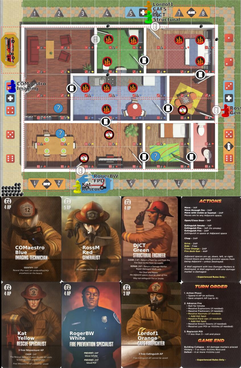 Where do we want to start? I generally like to split up and give each firefighter an area to defend, though Structural and Rescue are bad at extinguishing. There is no stacking limit, but we do have to start in the spaces round the edge.