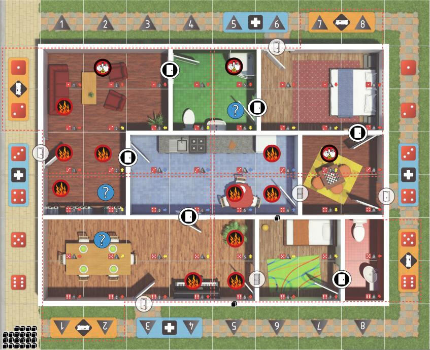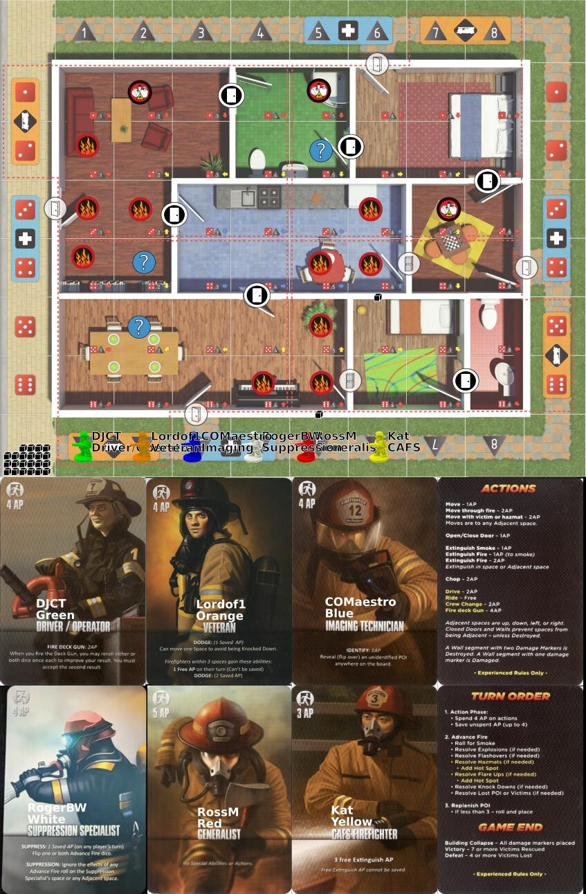 Next step is to place ourselves, and fire engine and ambulance. Note that the deck gun on the engine can spray only into the nearest quadrant of the board (shown by the dashed red lines), and only if there are no firefighters in there at the time. I think that’s DJCT’s call, and Kat anchors team 2, then the rest of us fill in around them.