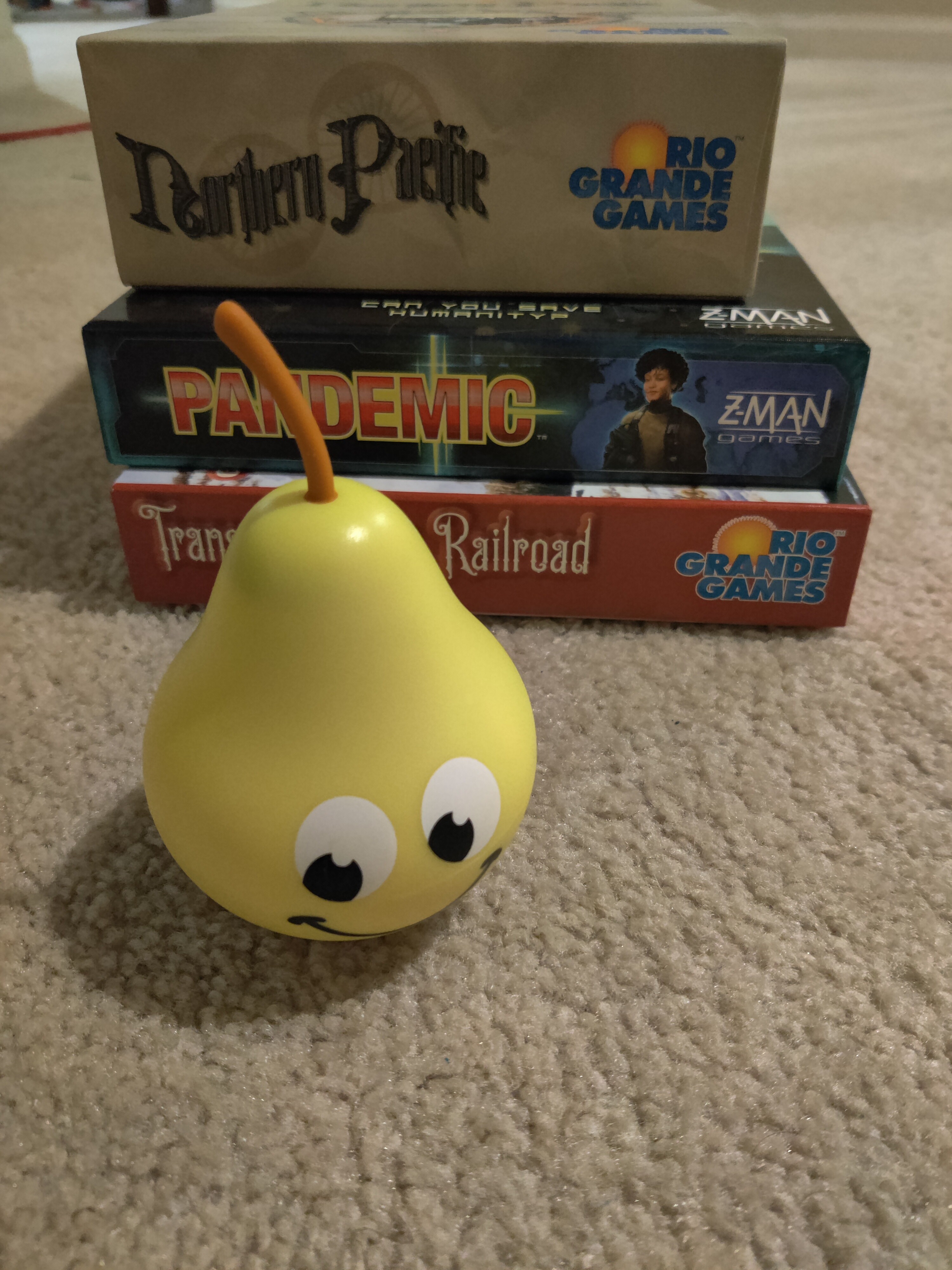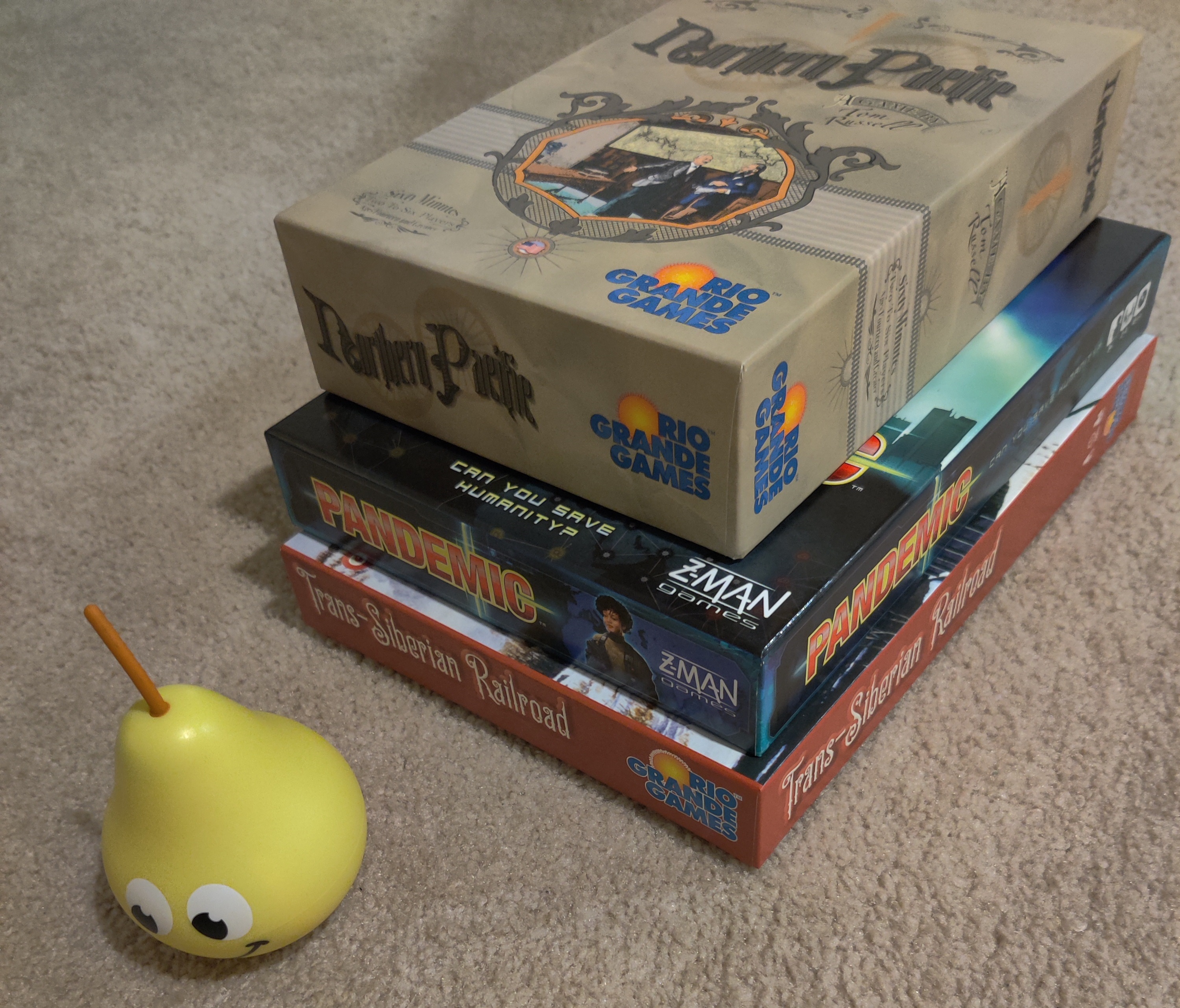 Seen here with an ordinary anthropomorphic reference pear, you can see the form-factor for TSR is almost that of Pandemic. And, in my opinion, is a better usage of shelf space than the Northern Pacific box (which, don’t get me wrong, is lovely!)