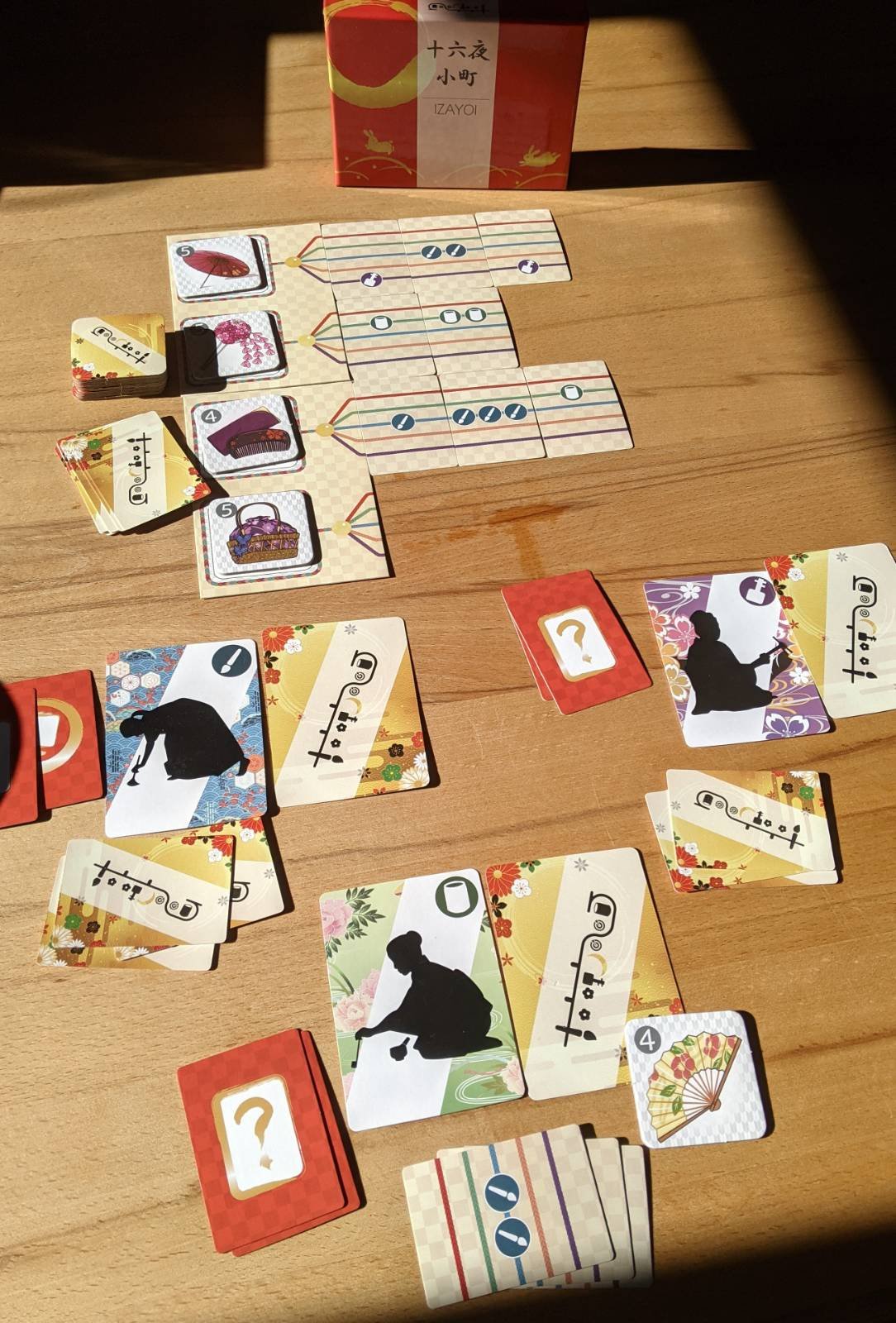 I got a package from Japan yesterday. One of my more experimental Kickstarters arrived: Izayoi. A game in which you try to collect accesories (Wakemono) but definitely not more than the person who is your master: