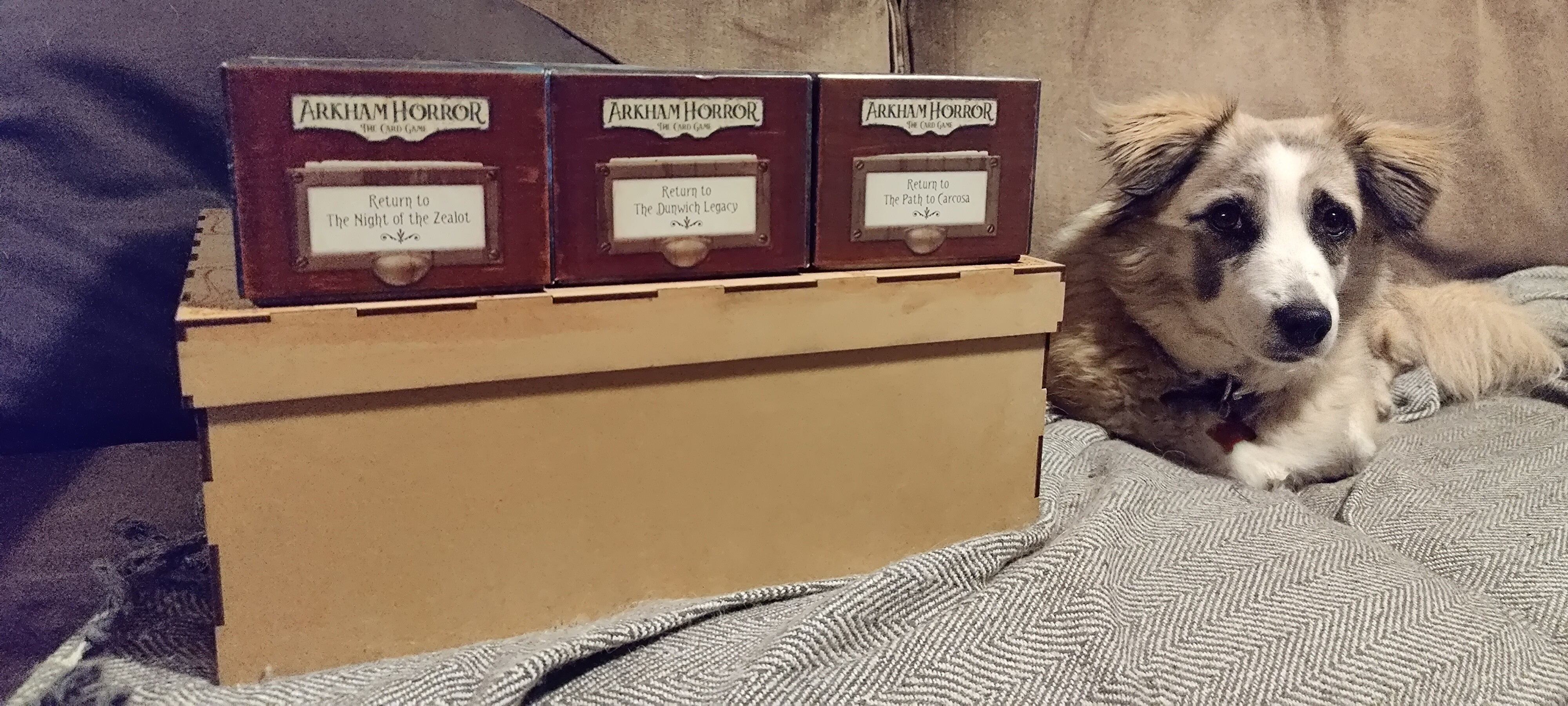 I have had to buy 3 Return to packs because I’ve run out of storage space in my HUGE box. It is getting to the stage where the Return to boxes will hold the campaigns, and the big box will hold the investigators cards. (Dog for reference)