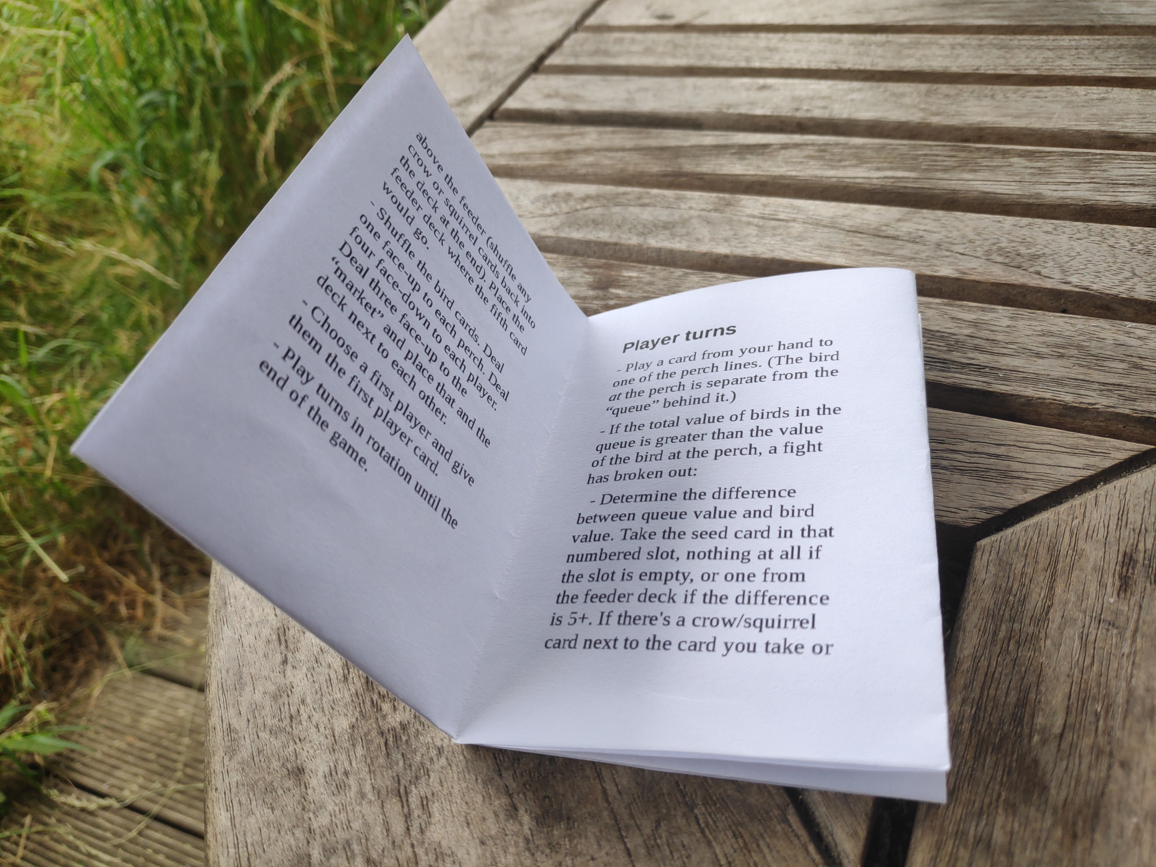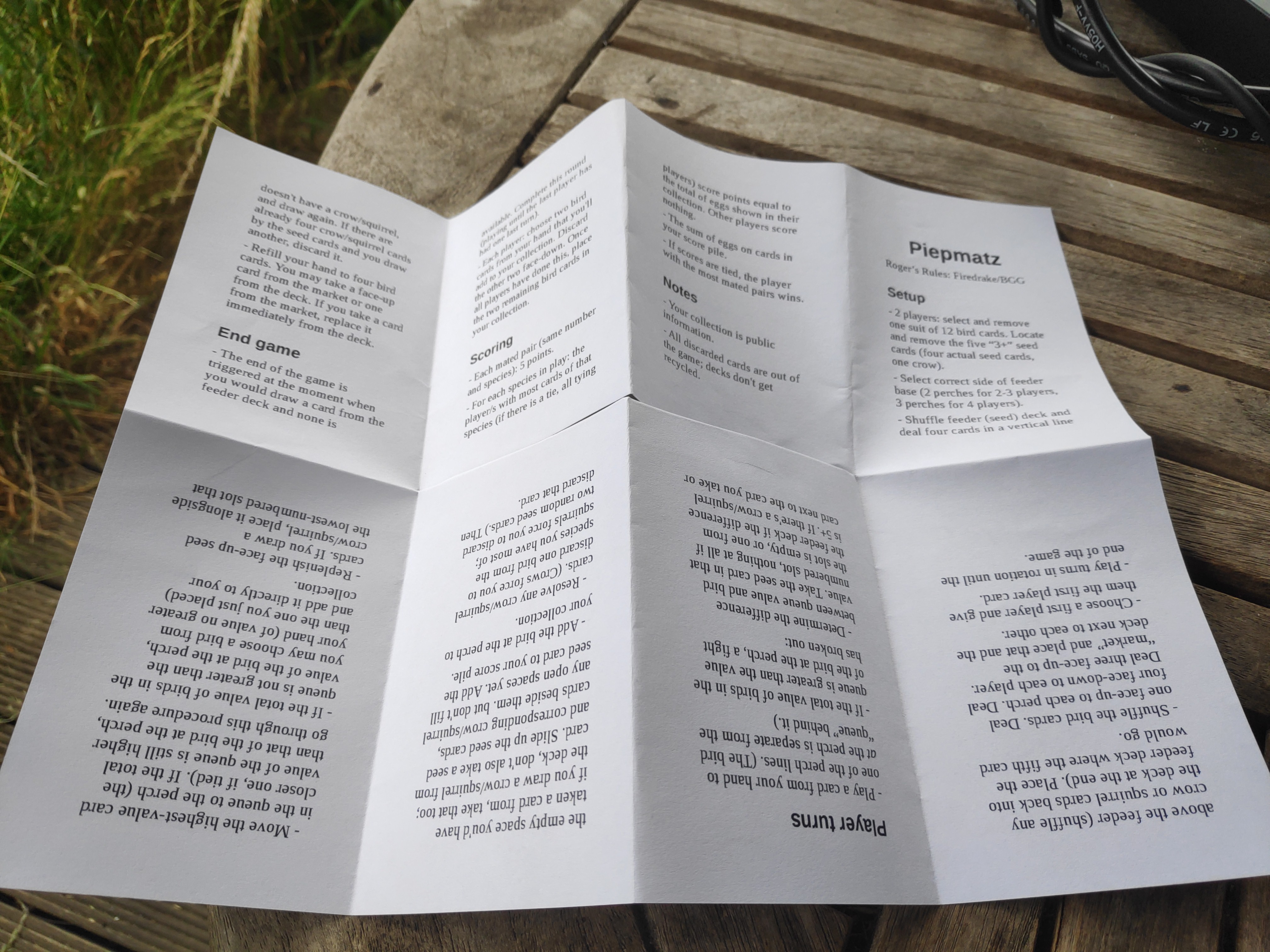 This is a combination of my mini rulebook for Piepmatz with the Pocketmod format - they want you to spend lots of money on their stuff, but this is the page you actually need. Along with the incantation of the correct order and orientation in which to place the pages. (1 on the top left, 2-5 down the right side, 6-8 back up the left side, bottom of page to the centreline.)
