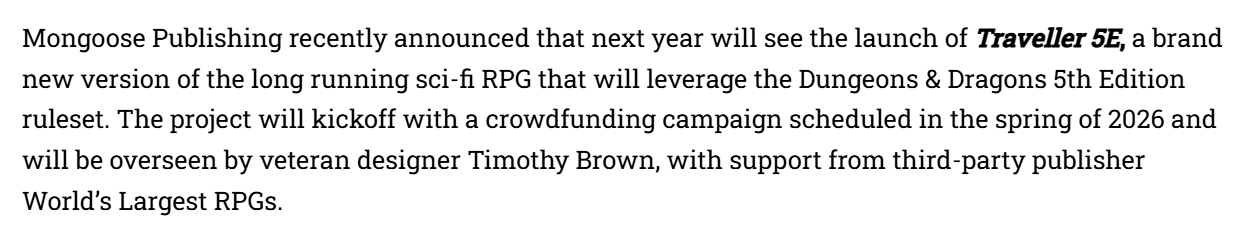 On the other hand, I don’t get it. The things that make D&D 5e good for D&D* seem irrelevant to Traveller. Fortunately, there will still be non-5e Traveller for those who do want something different than 5e.