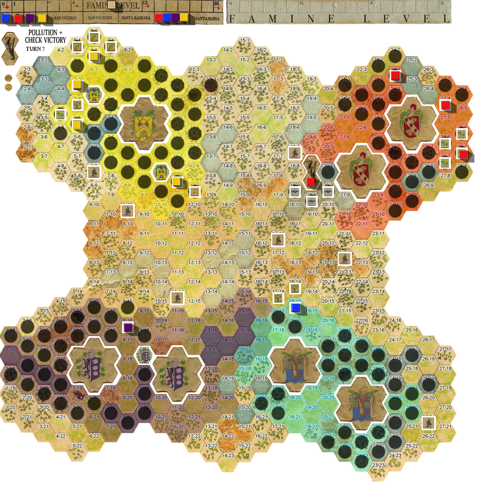 Meanwhile, 5 graves for blue and 2 graves for red, as well as pollution for blue (5), purple (2), red (3), and yellow (3), noting that blue cannot pollute 16-16, 16-17, 15-17 (I’ll post a ZoC map later).