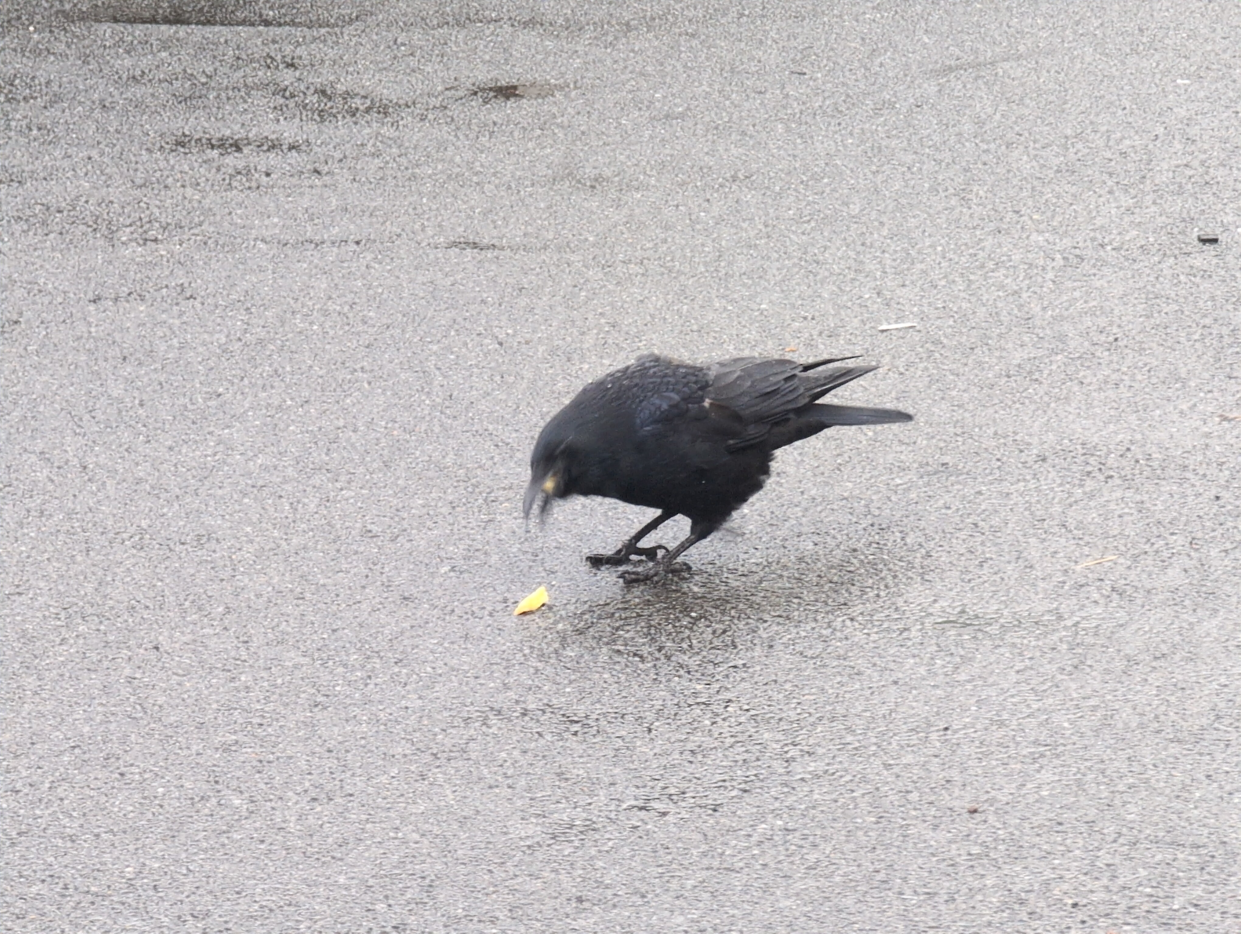 Using the door is mannerly. Mortimer drops to the ground and gingerly pokes in his beak.