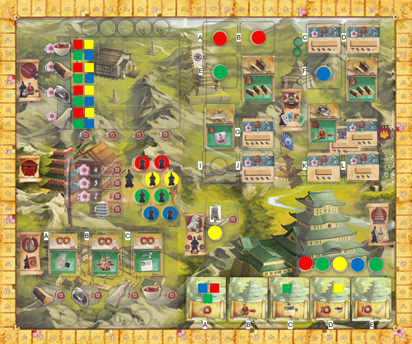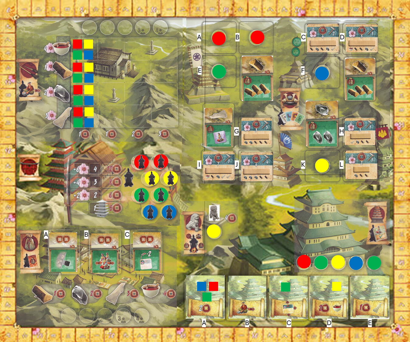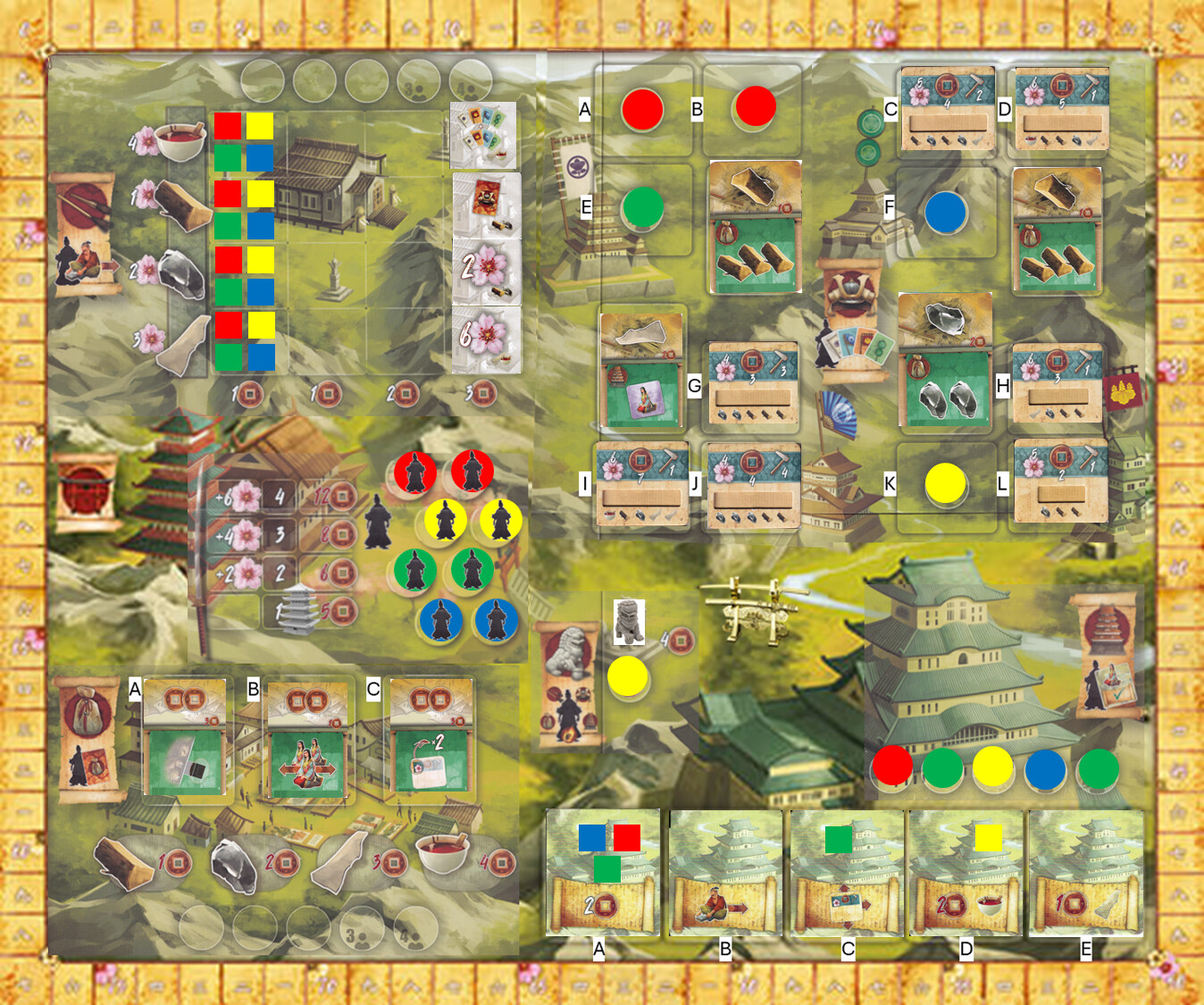 Okay. I have 20 coins. I will spend 5 coins for the monk. Who will visit the market. He will purchase two Lacquer (8 coins) and one stone (2 coins). We will also turn in the card that gives me 3 free wood. I will not use the permanent effect. I will take card A. And lets see what the next card shows.