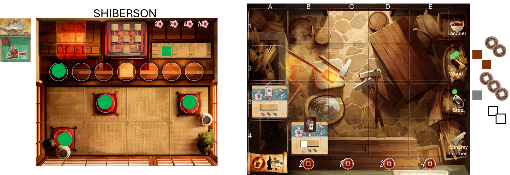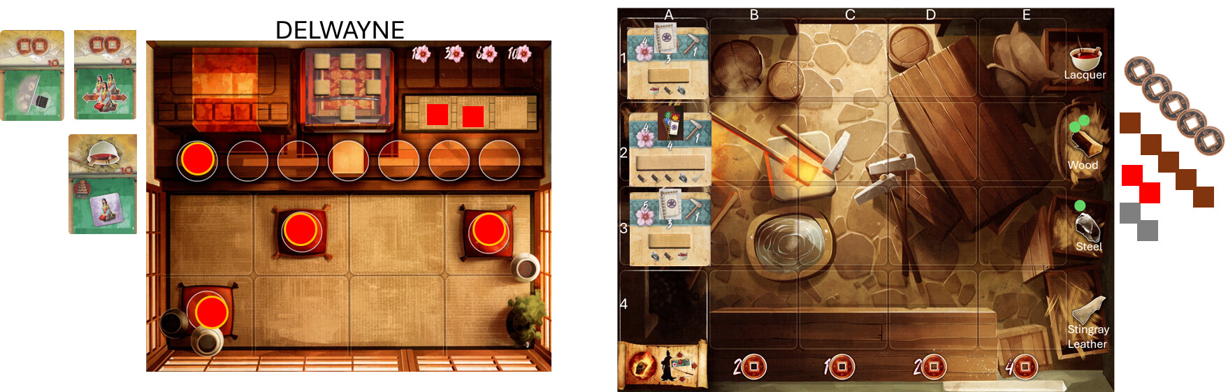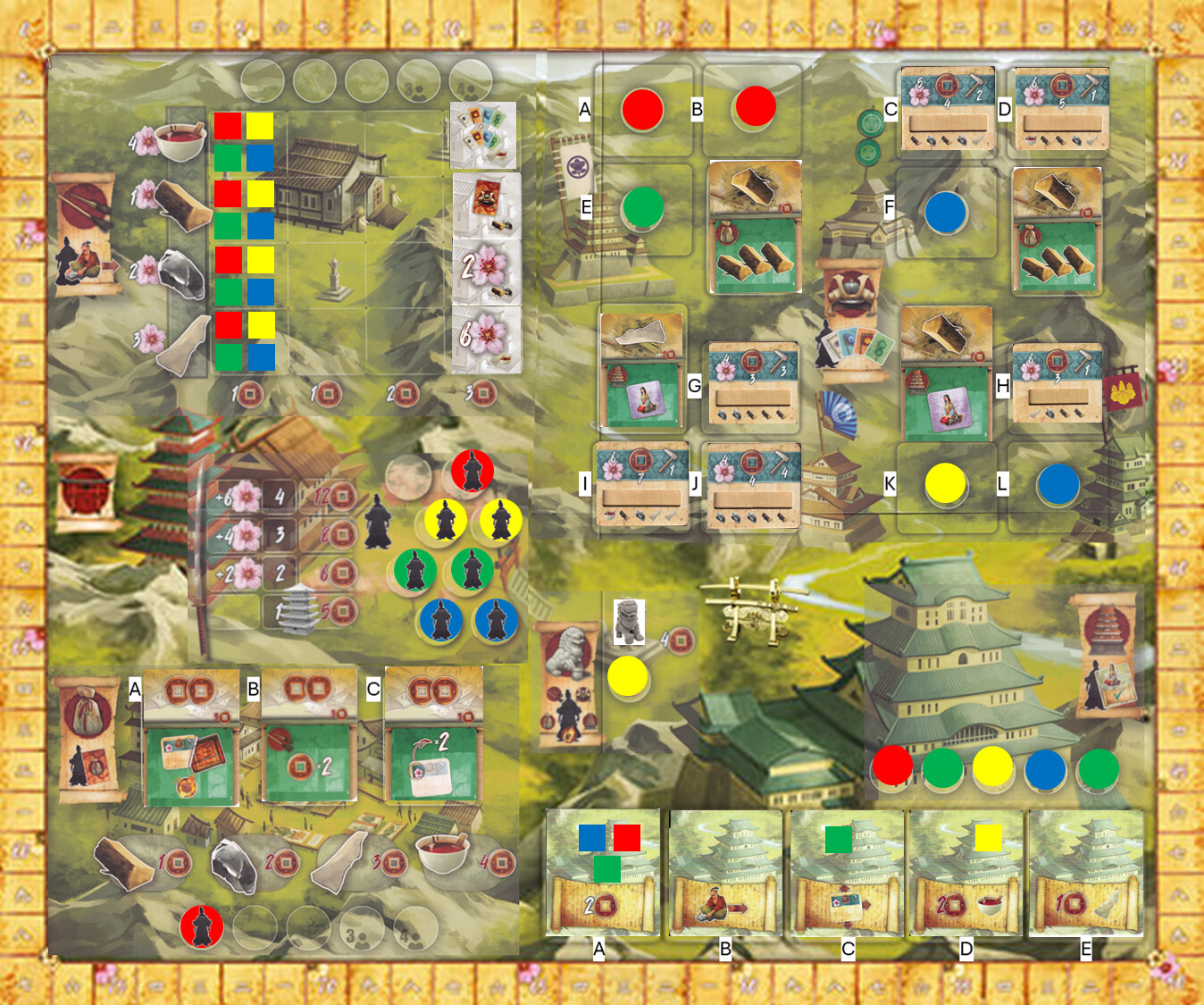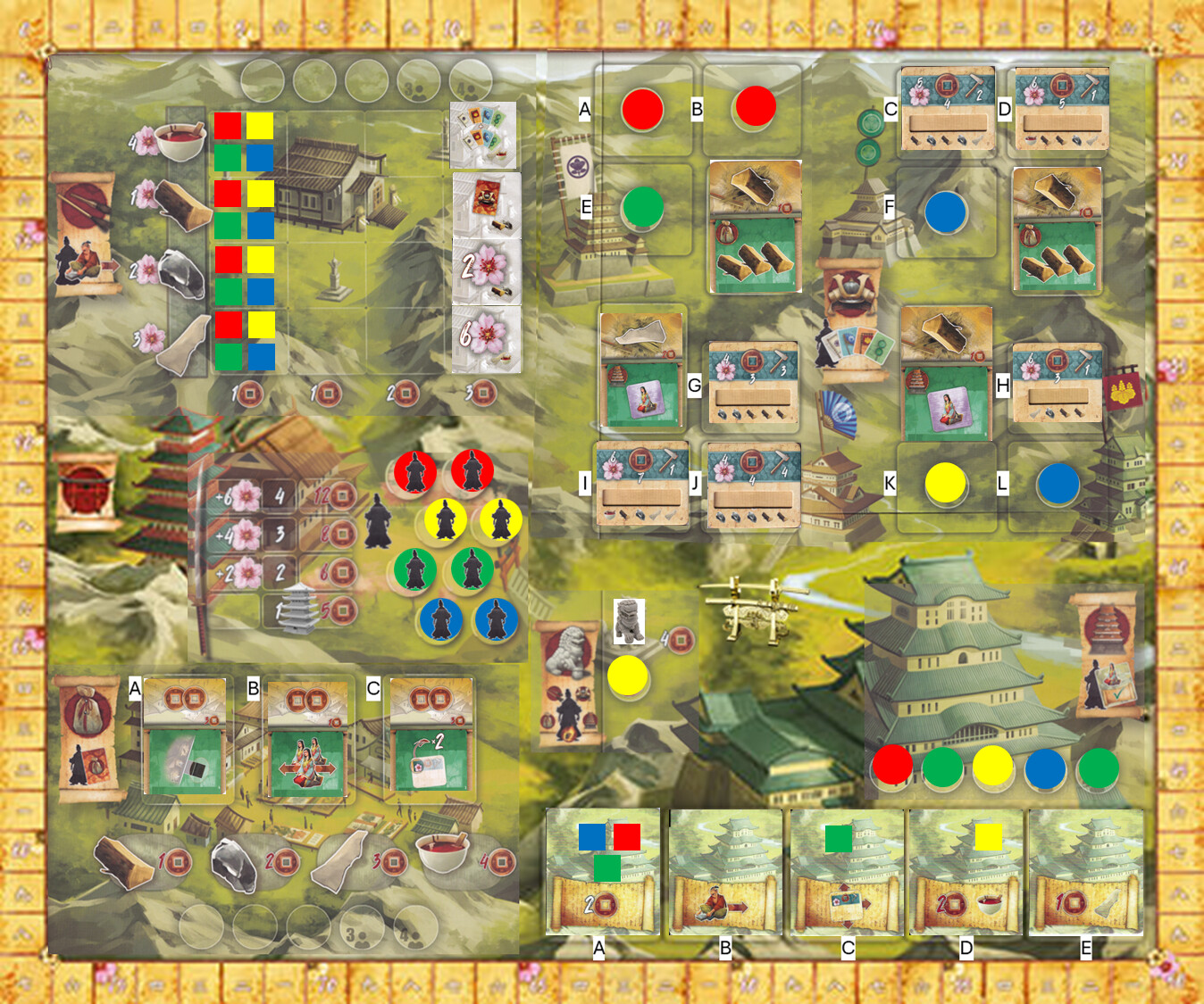 Okay. I have 20 coins. I will spend 5 coins for the monk. Who will visit the market. He will purchase two Lacquer (8 coins) and one stone (2 coins). We will also turn in the card that gives me 3 free wood. I will not use the permanent effect. I will take card A. And lets see what the next card shows.