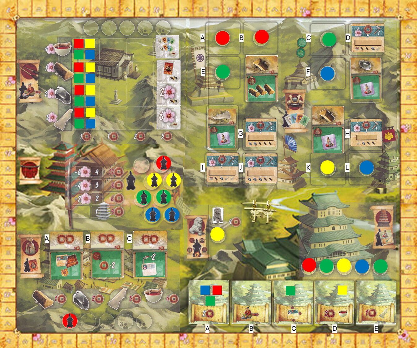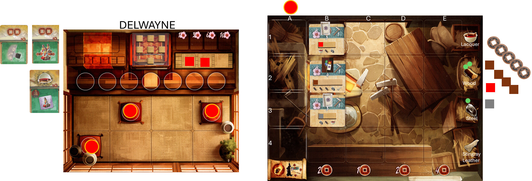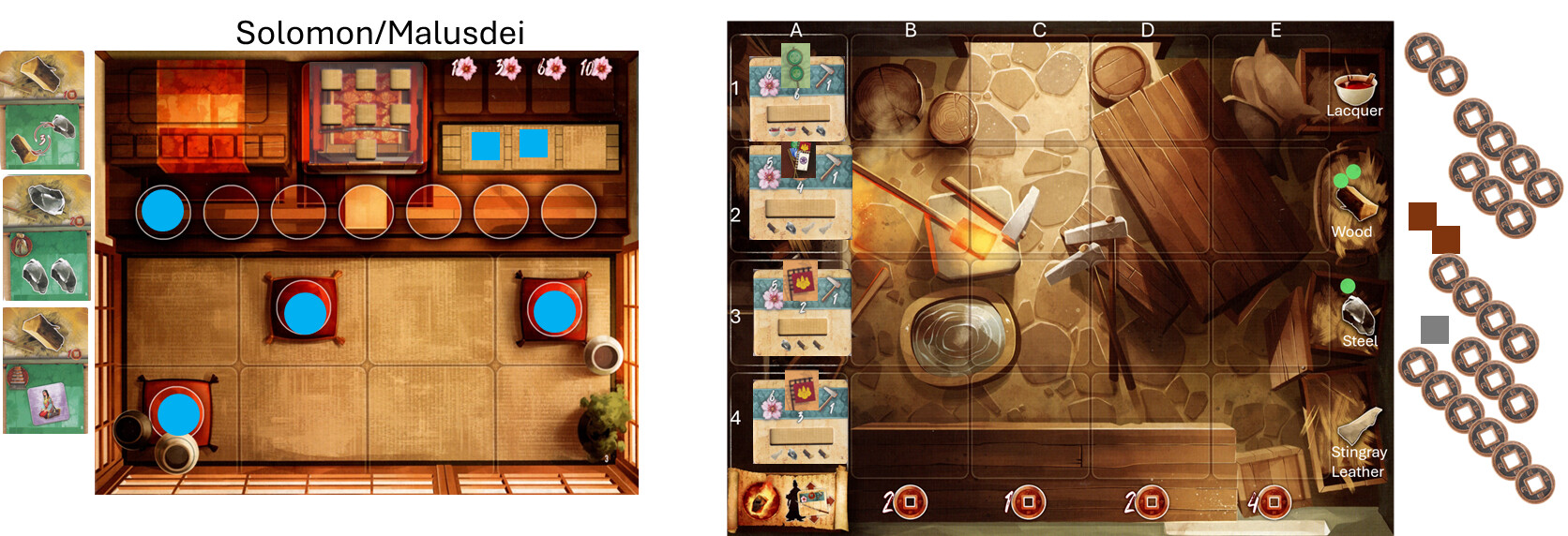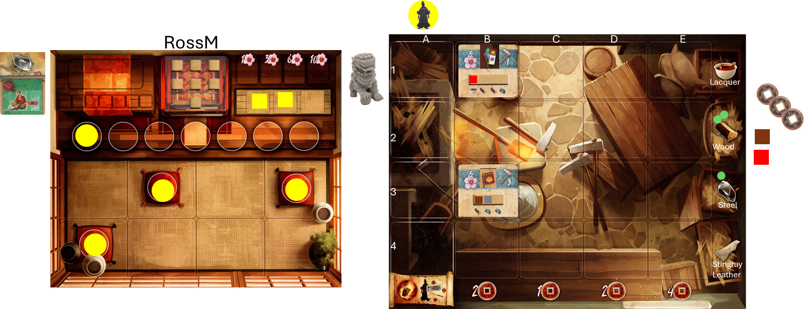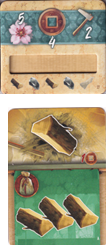 Also, this is a learning game, so all players, if you have any questions, feel free to ask. One of the main reasons for me in taking that one card over the other is only for the 1 coin cost vs. the other for double victory points (which is a good one, but for only one sword). And I’ve got two swords that will be coming off the same column when completed. So I’m hoping to make use of the coins (also, winning for me is not everything)