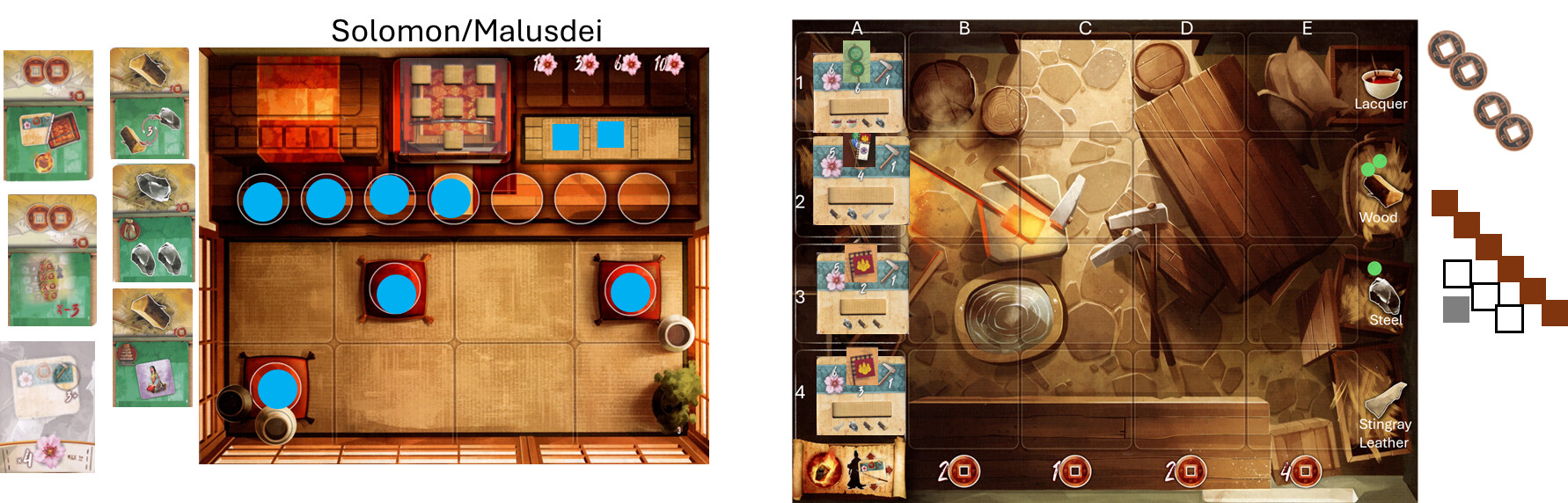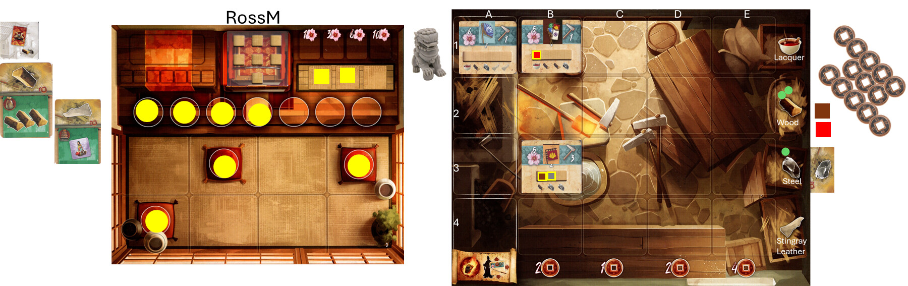 sorry for the incomplete graphics but I’m at the office at work. But do you see where my completed sword is located? you do a cross reference between columns and rows of that sword BEFORE lifting it. It came from the lacquer row, and the bottom of the B column show 2 coins along with my card that I added there (prior) for the other two coins. You always want to get those things prior to removing the sword tile from your forge area. I’ll post updated graphics soon as I’m able to.