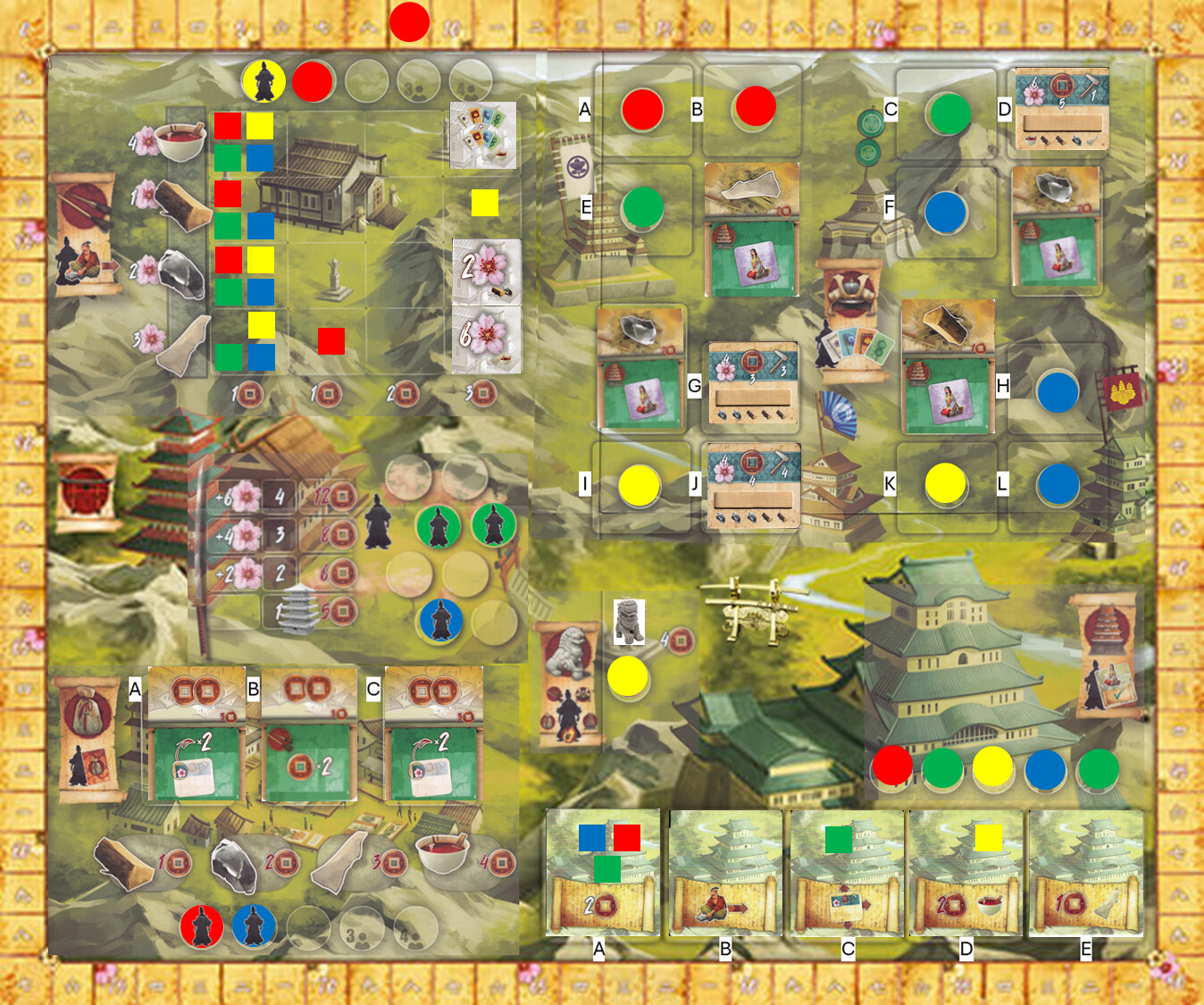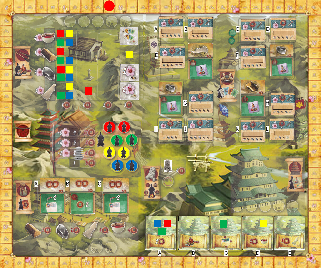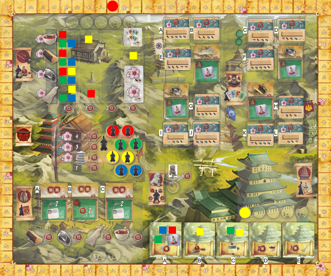 Also, at the end of the round. The person who has the “metal katana” has to choose to score 4 points or add 1 resource to the shoguns project. I chose the one sharkskin resource.