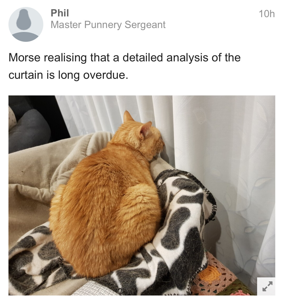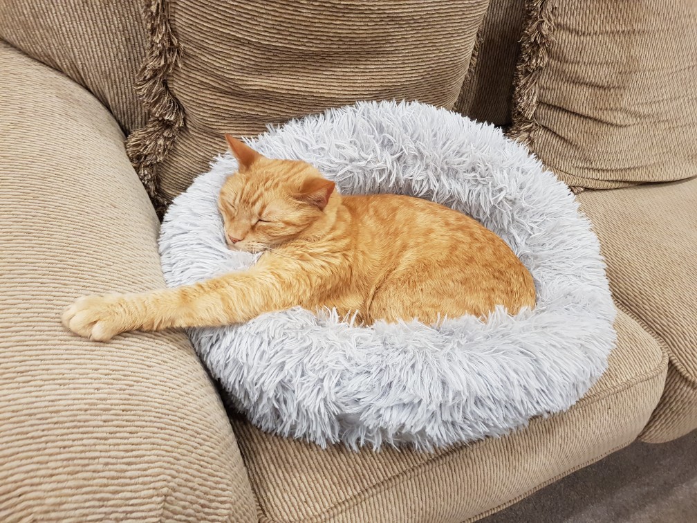 He loves sitting/sleeping there. Itâs actually a cat igloo, but he always climbs on top of it and squashes it down, so we long ago gave up on âresettingâ it so he could go inside it. In all the time itâs been there, though, this was the first time Iâd ever seen him just stuff his face in the curtain like that. Such a big cuddly weirdo :).