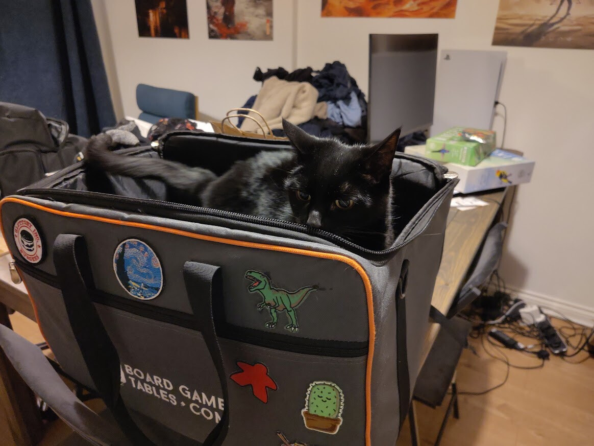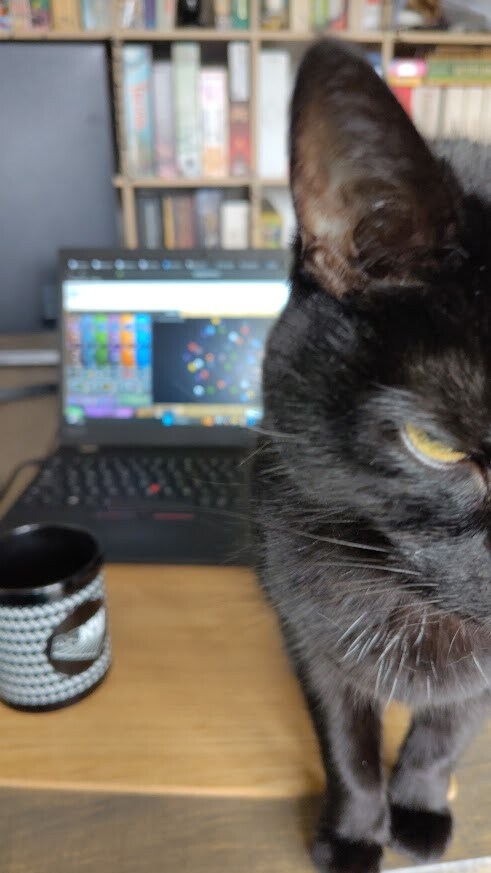 (Playing a digital implementation of a board game, opposite a kallax full of board games, with the laptop on a board game table, drinking tea from a mug I got at a board game convention