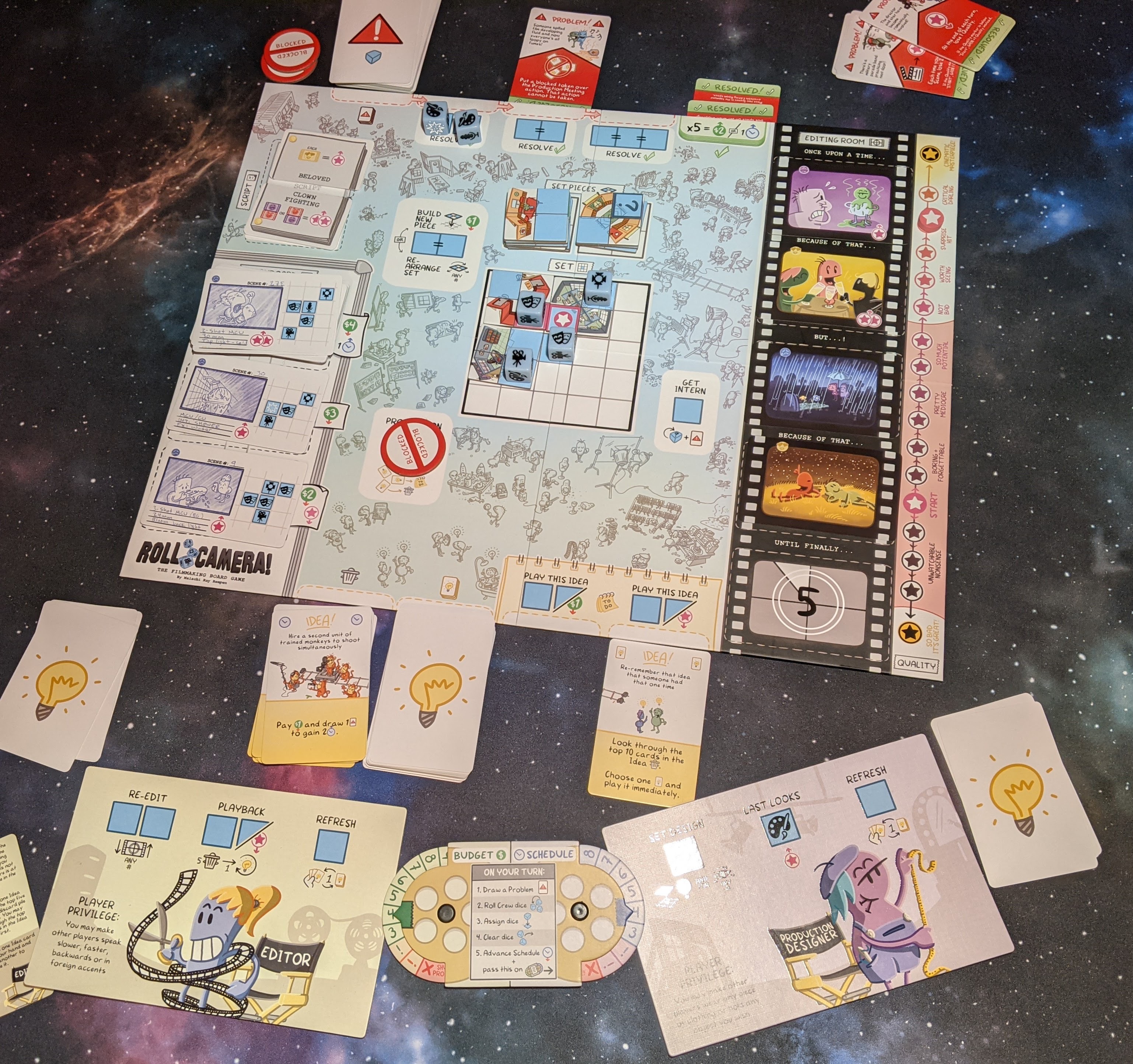 In this game the players take on typical roles on the set of a movie Director, Star, Production Designer or Editor (there are six roles). Each has 2 special abilities. The goal to shoot 5 scenes within schedule and budget. To shoot a scene from the story board on the left you have to create the depicted pattern with the dice on the blue spaces of the set pieces in the center.