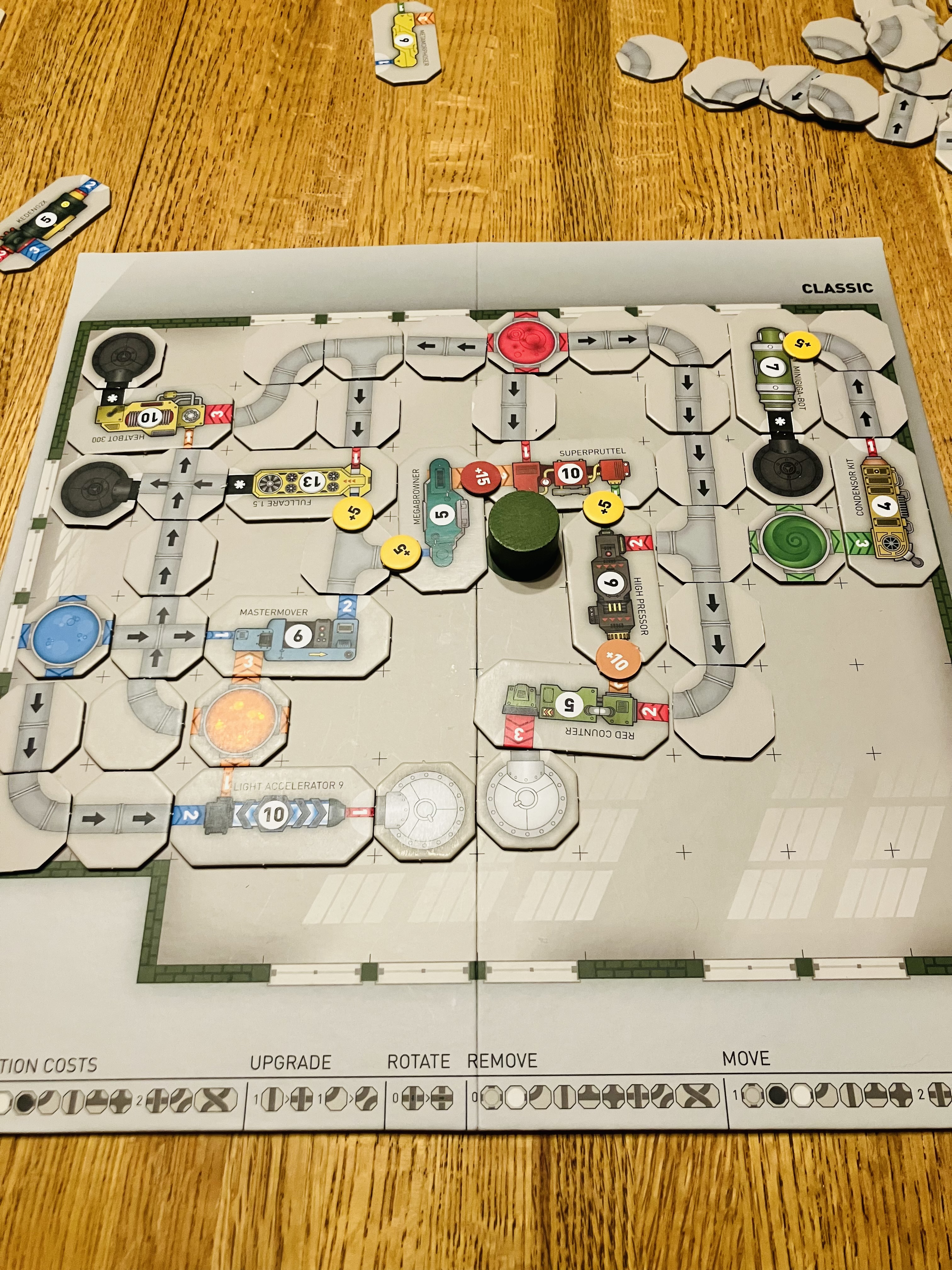 My wife suggested some Factory Fun after dinner. At two players we like to flip four machines for more choices. Things went better for me than for her - at one point she dropped to 0 money. Meanwhile that little closed circuit at the top-right of my board used to be rotated 90 degrees, but I spent the moolah to reorient it so that I could free my pink vat, which was fully blocked by machines. It worked out because the machine under the column was the very next one I acquired. In general the machines were kind to me and it was not a stressful game.