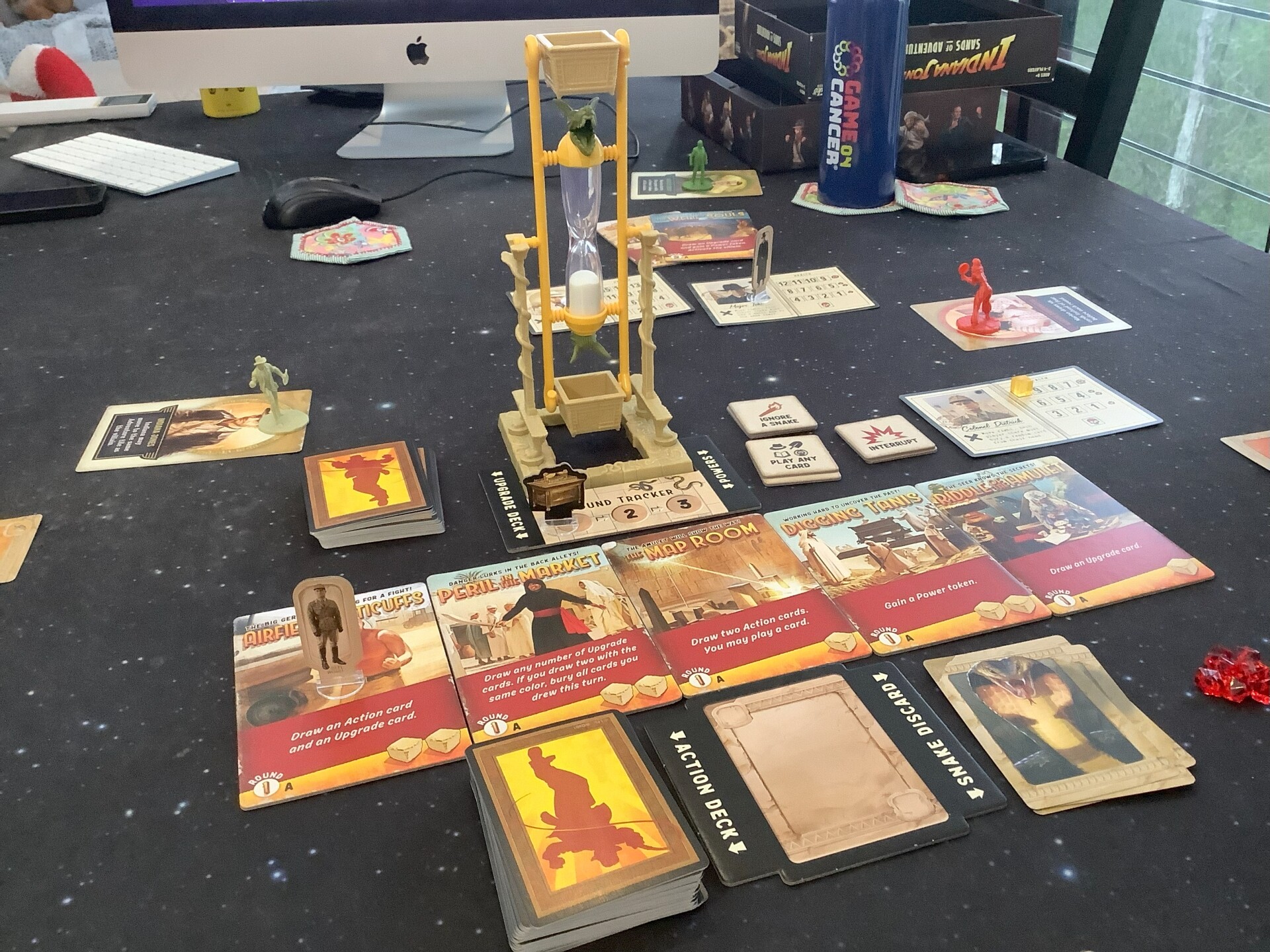 Indiana Jones: Sands of Adventure, first play, hadn’t even heard of this game. It’s fully cooperative, and a fairly light card matching game. Each round has two phases, one where you can take your time, and a second phase that is played in real time. It has one of the coolest timers I’ve seen. The timer has a bucket at each end, and you fill up the top bucket with gems as you go. once there’s enough weight, the timer swings around and then it’s on. The objective of the game is to beat all the bad guys (three) by playing attack cards. Cards have a colour and a symbol, and you have to match either the colour or the symbol. it’s fully cooperative, so you can play open handed. In the real time phase, you’re desperately pulling cards, trying to find the attack cards. You don’t have to defeat a boss (apart from the last one), but failing to beat them means you start the next round with gems already in the timer. Good, light fun, any fan of the movie would enjoy this.