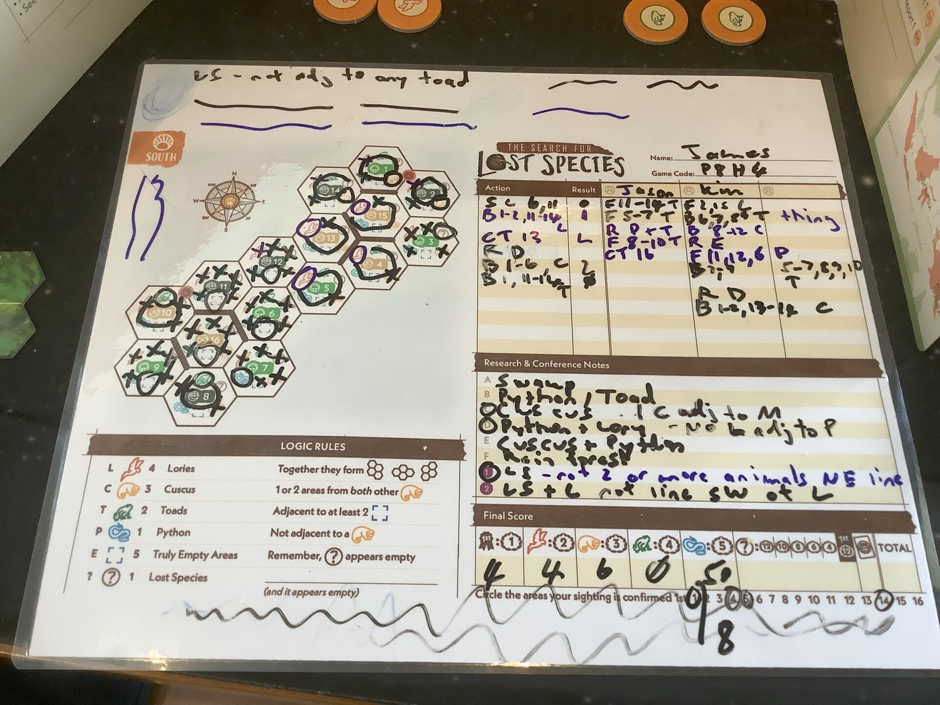 Game seven was actually back to Beginner mode because I needed to entertain a 6 year old that didnāt have school last Friday because of snow, so on my lunch break, we played through the game together and I explained some of the logic I was using (and also, because sheās a curious 6 year old, what the computer was doing on its part because āit knew the answerā so why was the bot not just winning?). Due to the distraction of playing with a 6 year old, I flipped some logic in my head from a fact that we knew and ended up attributing Planet X to a location that it could not be⦠But since we had a Beginnerās start (8 free negative facts), we were able to publish way more than the bot and won the game on points with an incorrect Planet X Locate! ā I didnāt actually check if you could āwinā if you attempted and failed to locate X⦠it was a moral victory regardless.