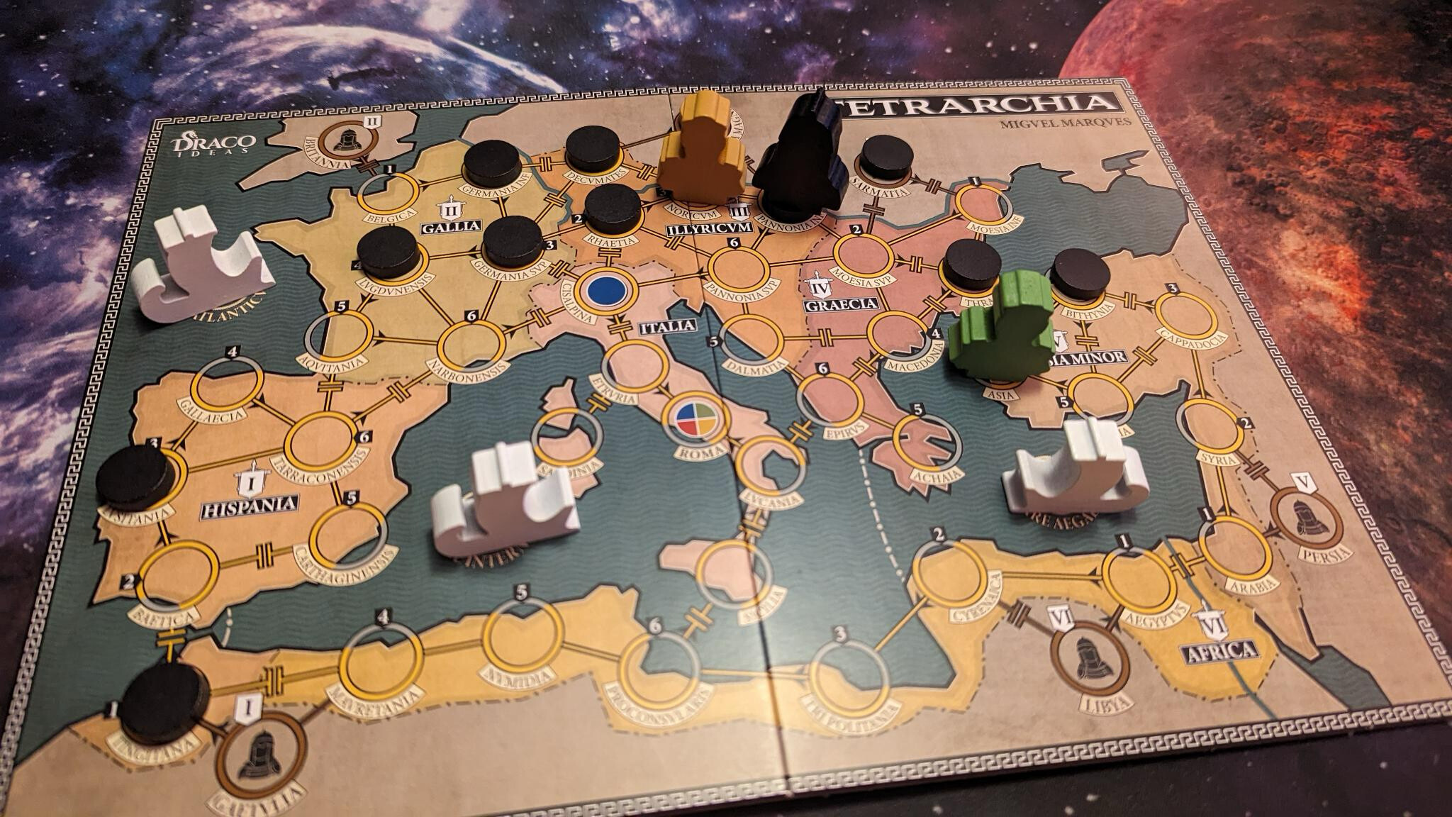 Behold the start (turn 2!) of my 2nd attempt at playing Tetrarchia—I quit the first due to an egregious rules mistake. I ended up winning because well I played with all the ships and all the garrisons. I probably made more mistakes along the way and I had to consult BGG for rules clarifications because as short as they are, they aren‘t all that clear or well explained in the rule booklet. Never mind that though. This is awesome. And such a small box