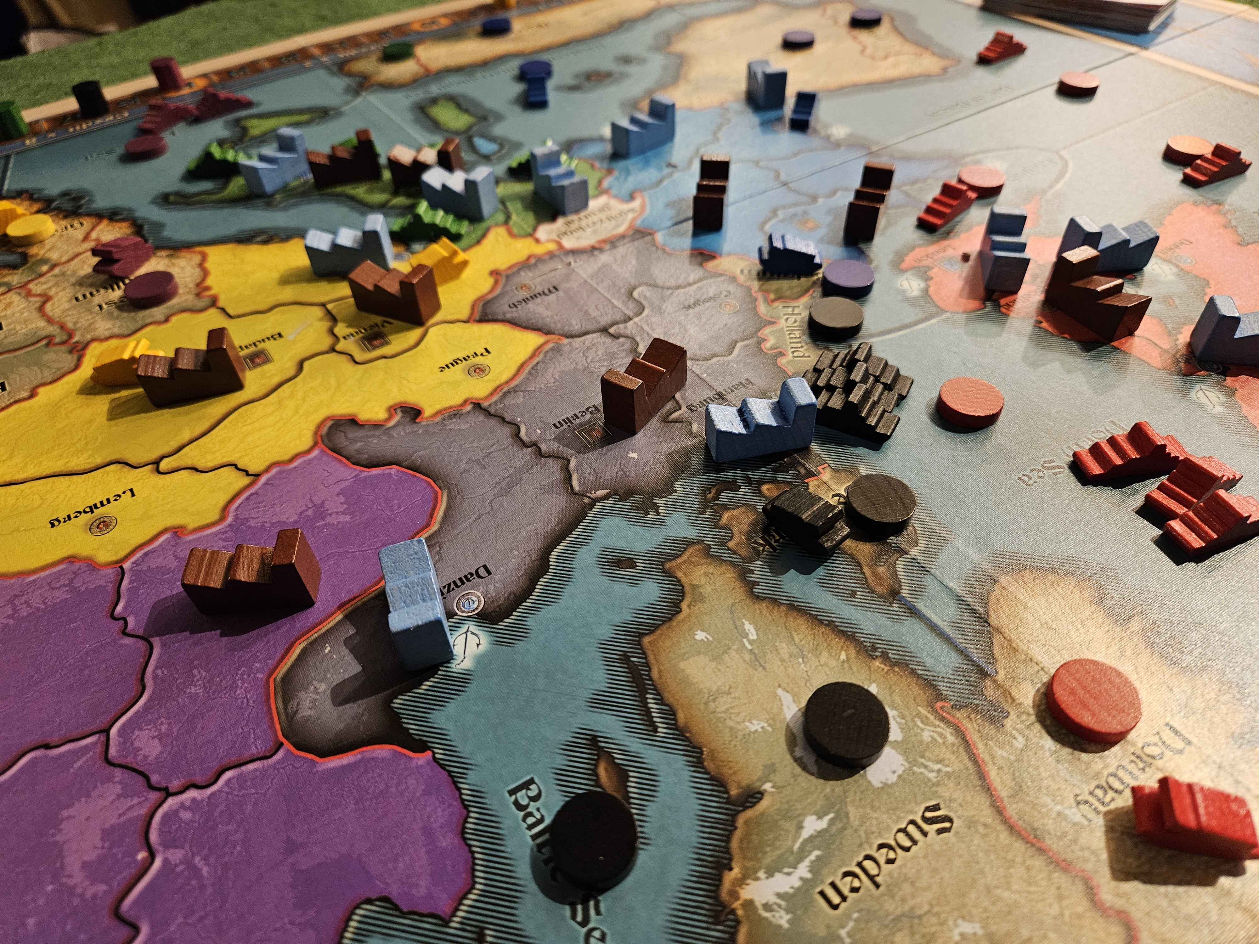 The Loop, some cooperative fun. We’ve never won at this game, even at the basic difficulty. We started out pretty well, had three (of four) missions completed, but then more and more bad guys start appearing, and we lost our fourth mission. The game has a tower in the middle, which you throw red cubes into. If any region gets more than three red cubes, it’s lost (and you lose any progress you might have had on the mission). The tower has three exits, so you never quite know how the cubes will come out, there’s a bit of luck involved. A close game, but we just couldn’t get it done.