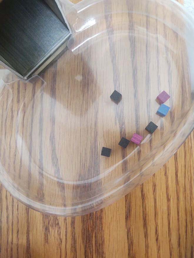 Yellow, Purple, & Blue 2 cube in tray. Black will take 4 chests.