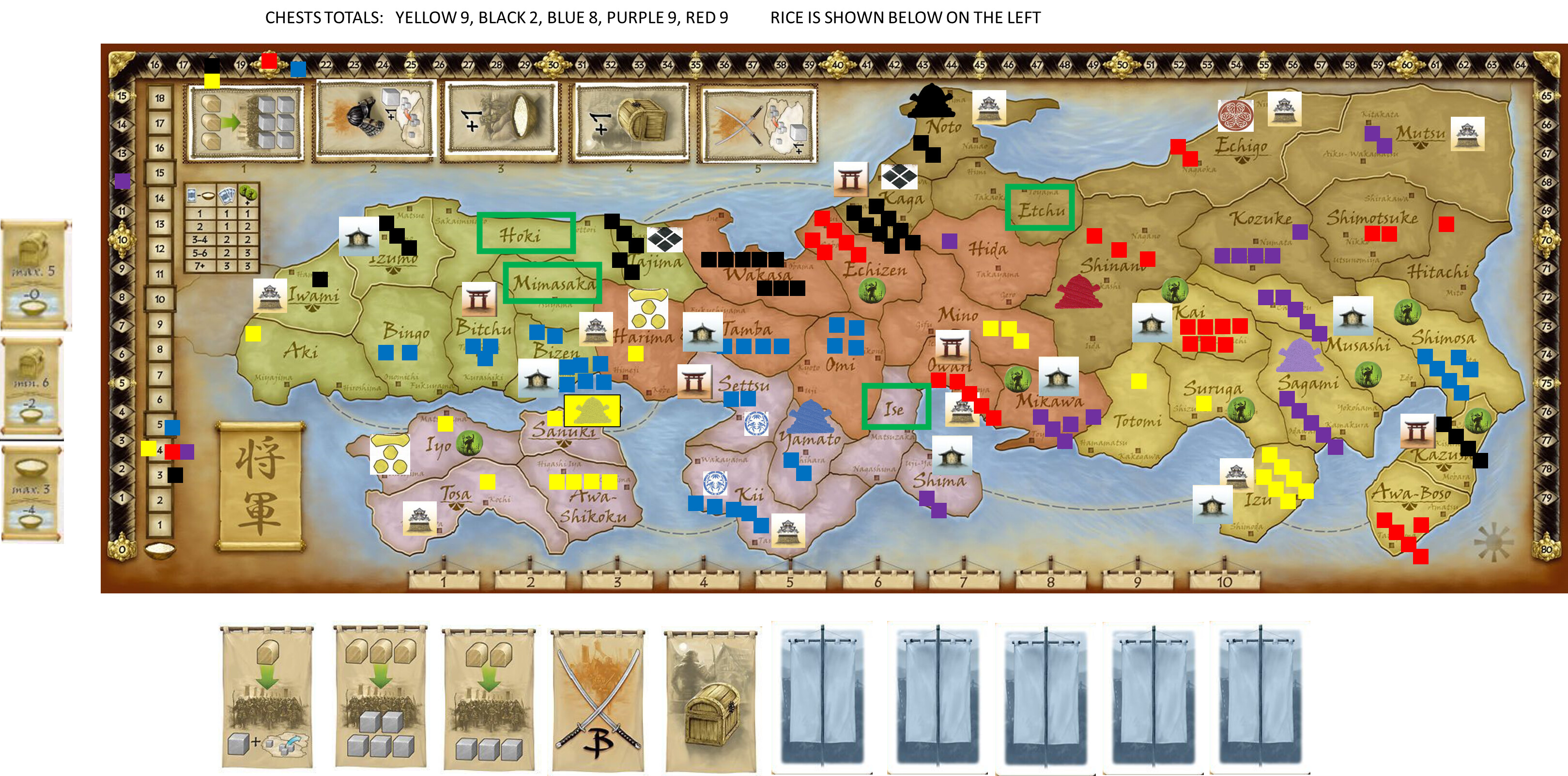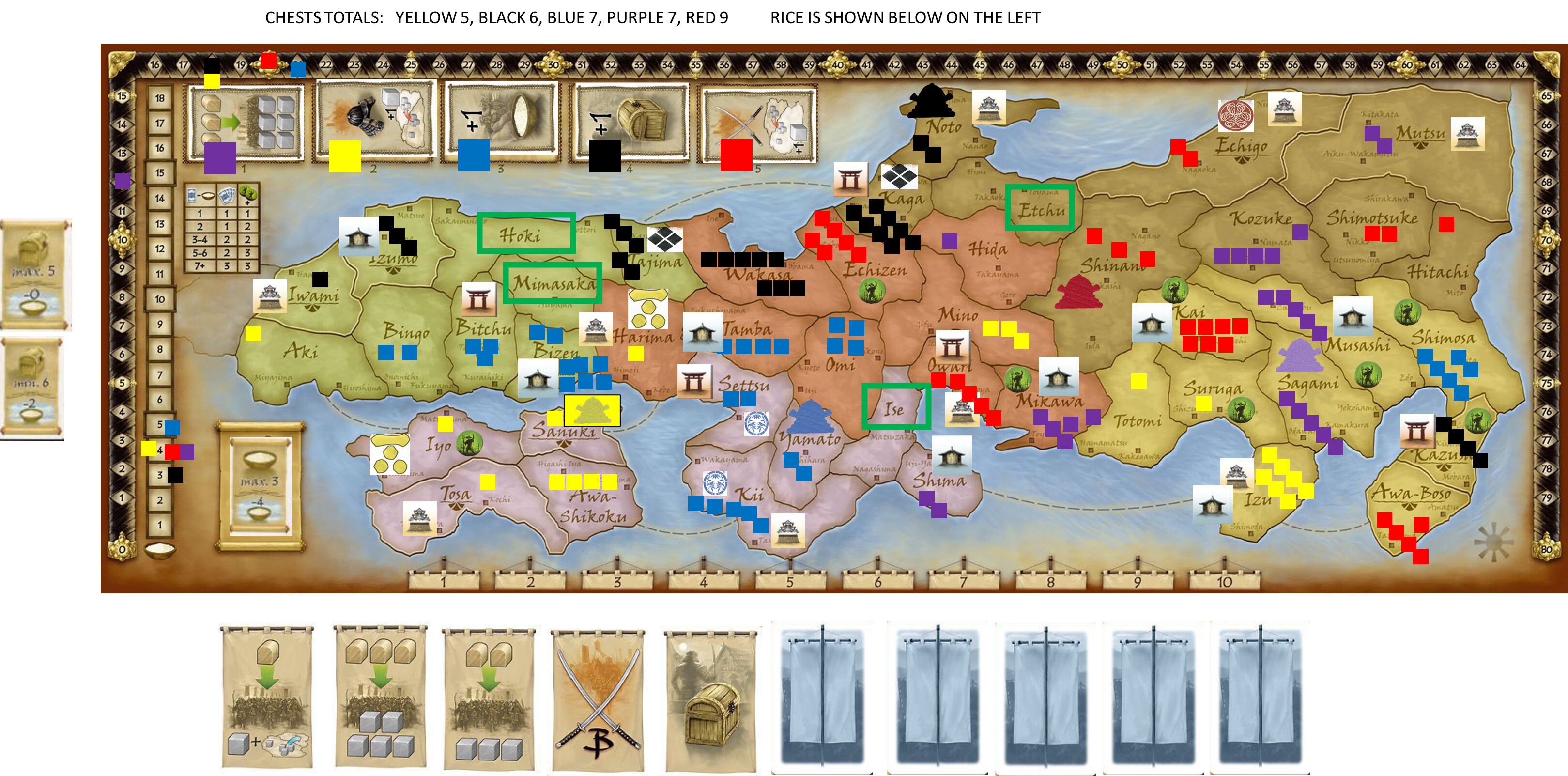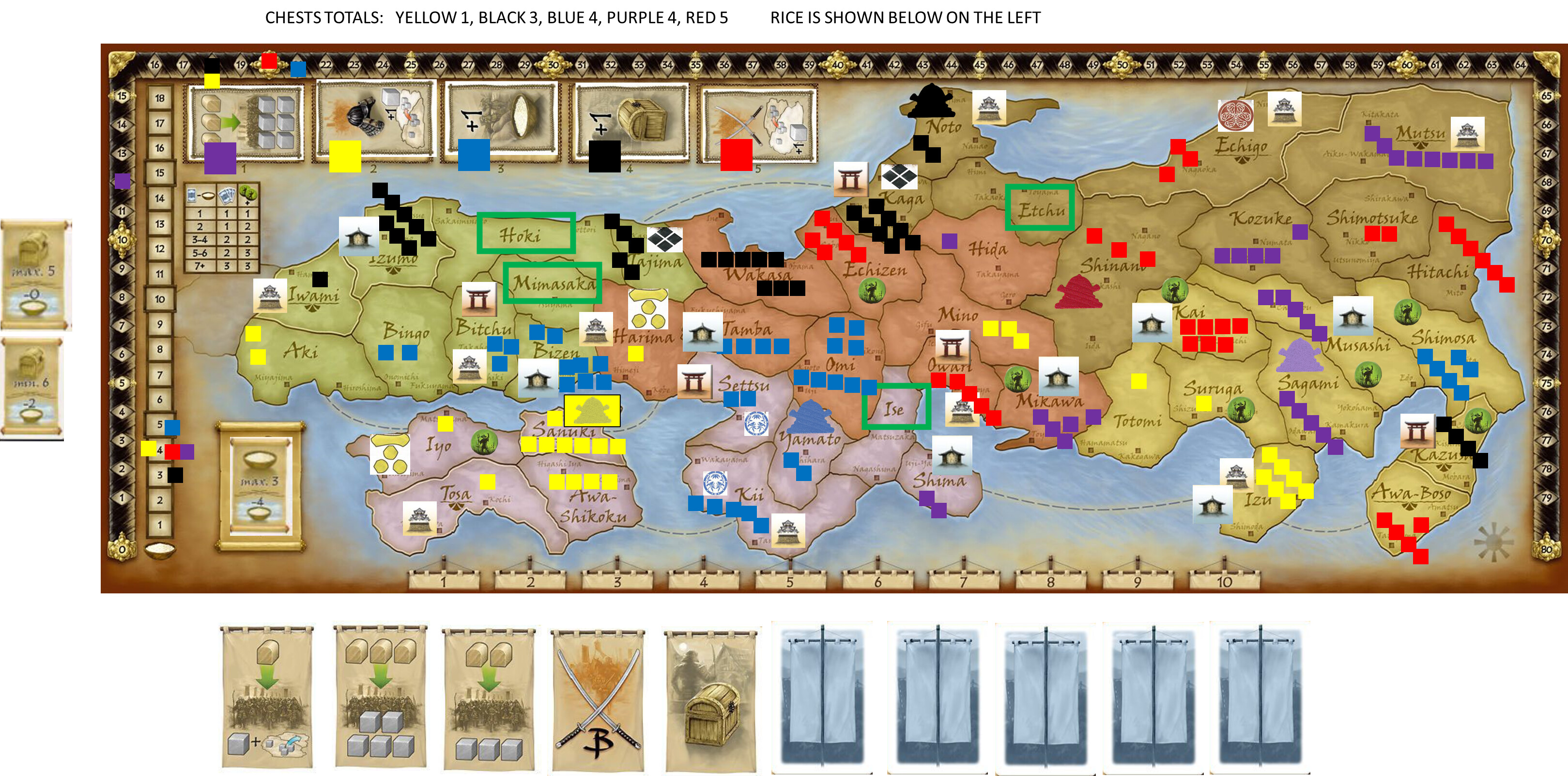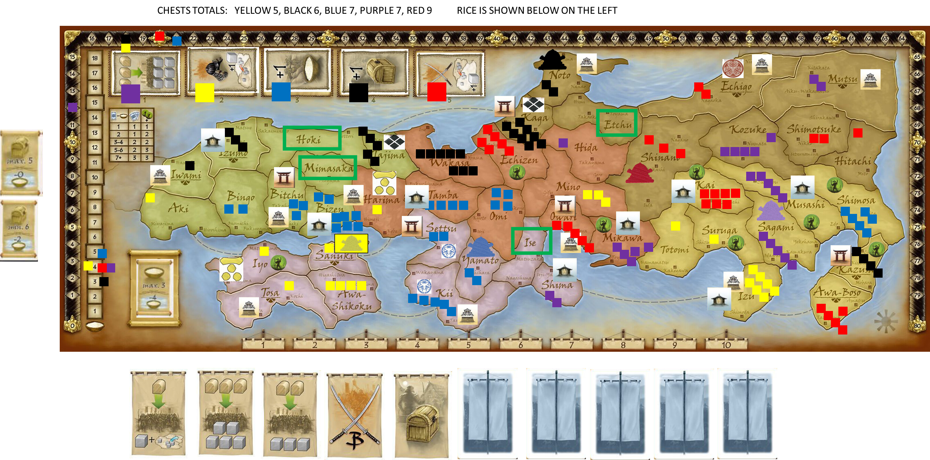 Purple Mutsu +1, Yellow Sanuki+1, Blue Omi, Black Izumo, Red Hitachi.
