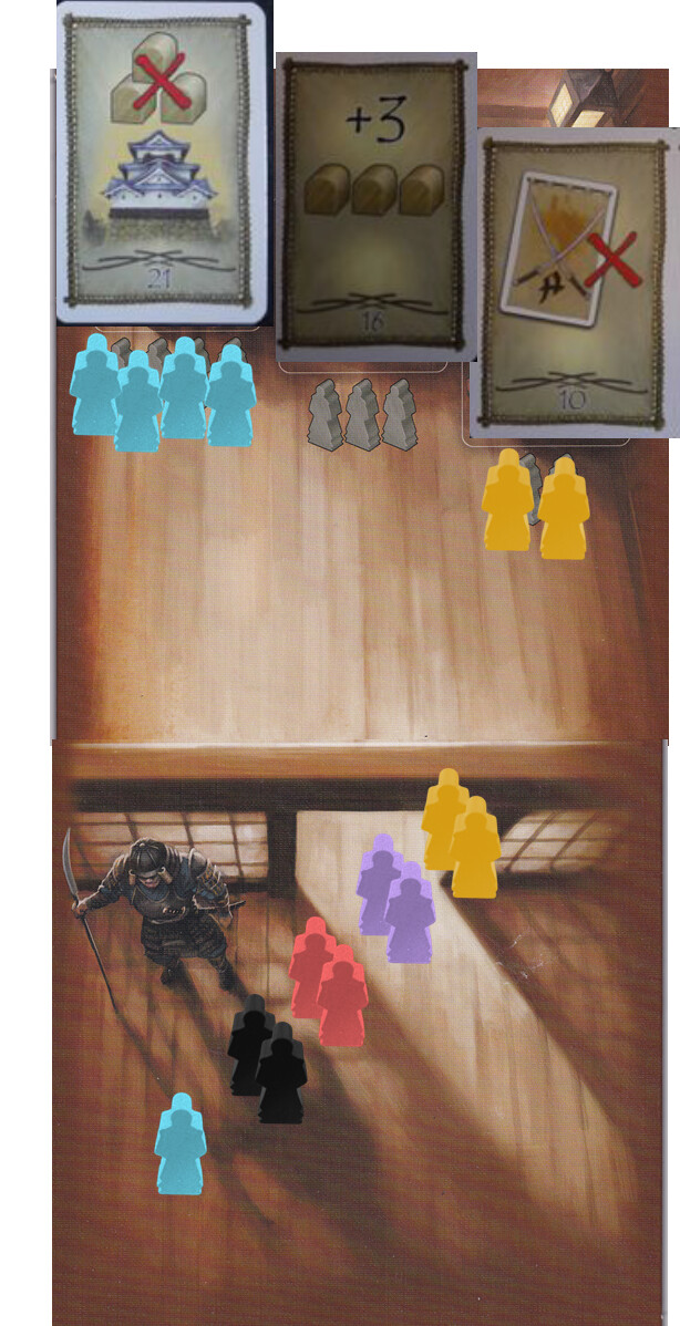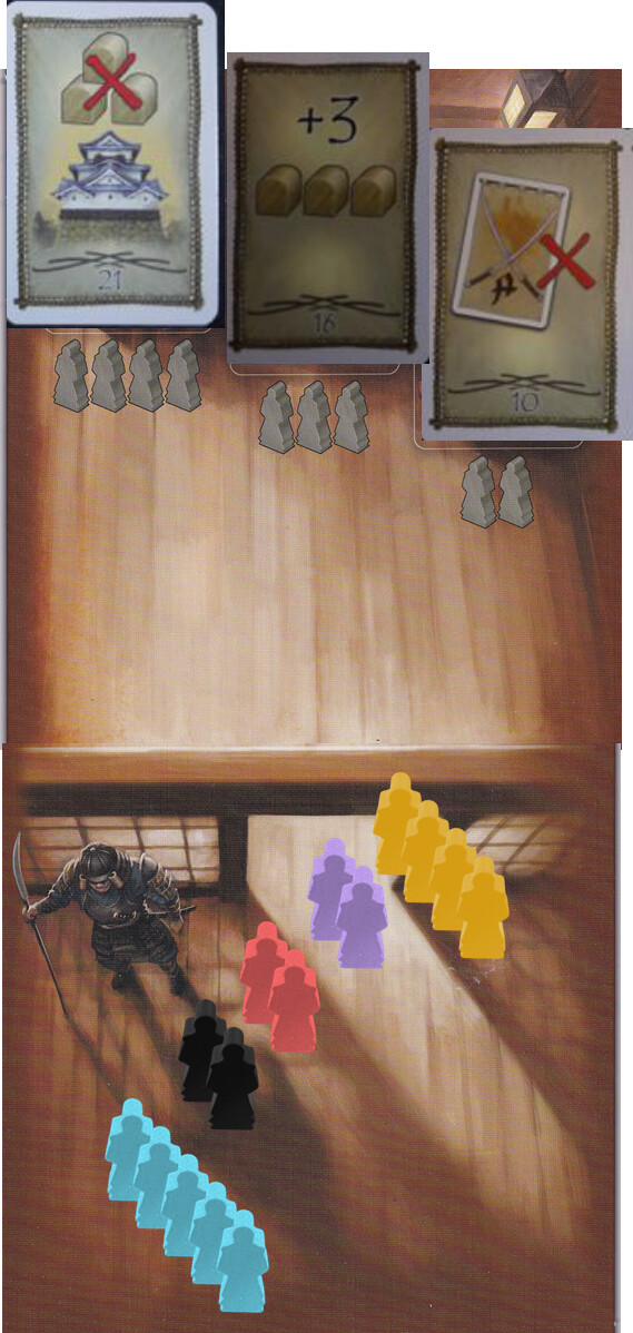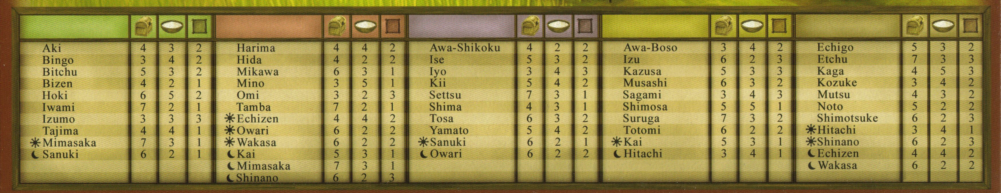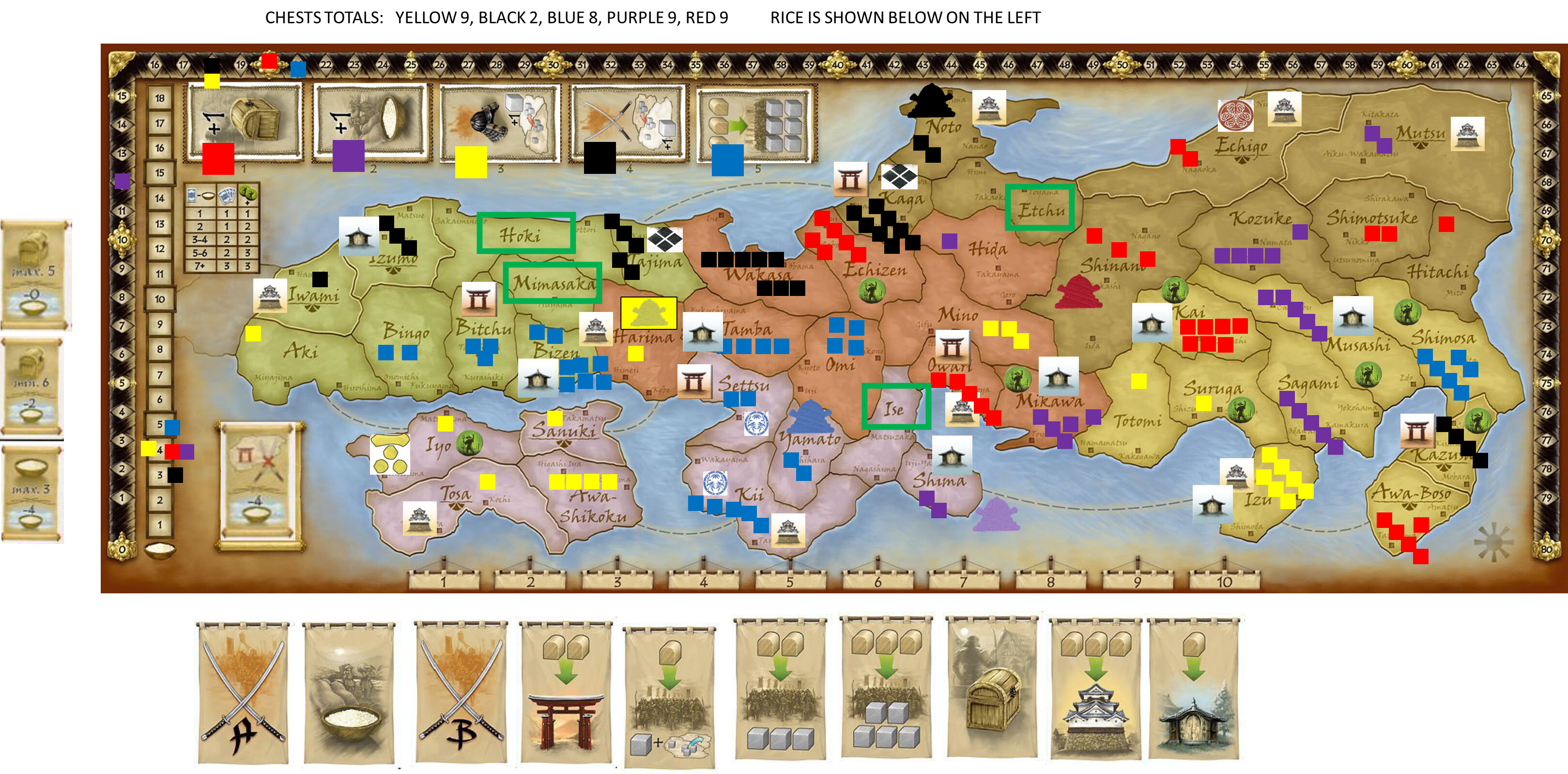 Purple Mutsu +1, Yellow Sanuki+1, Blue Omi, Black Izumo, Red Hitachi.