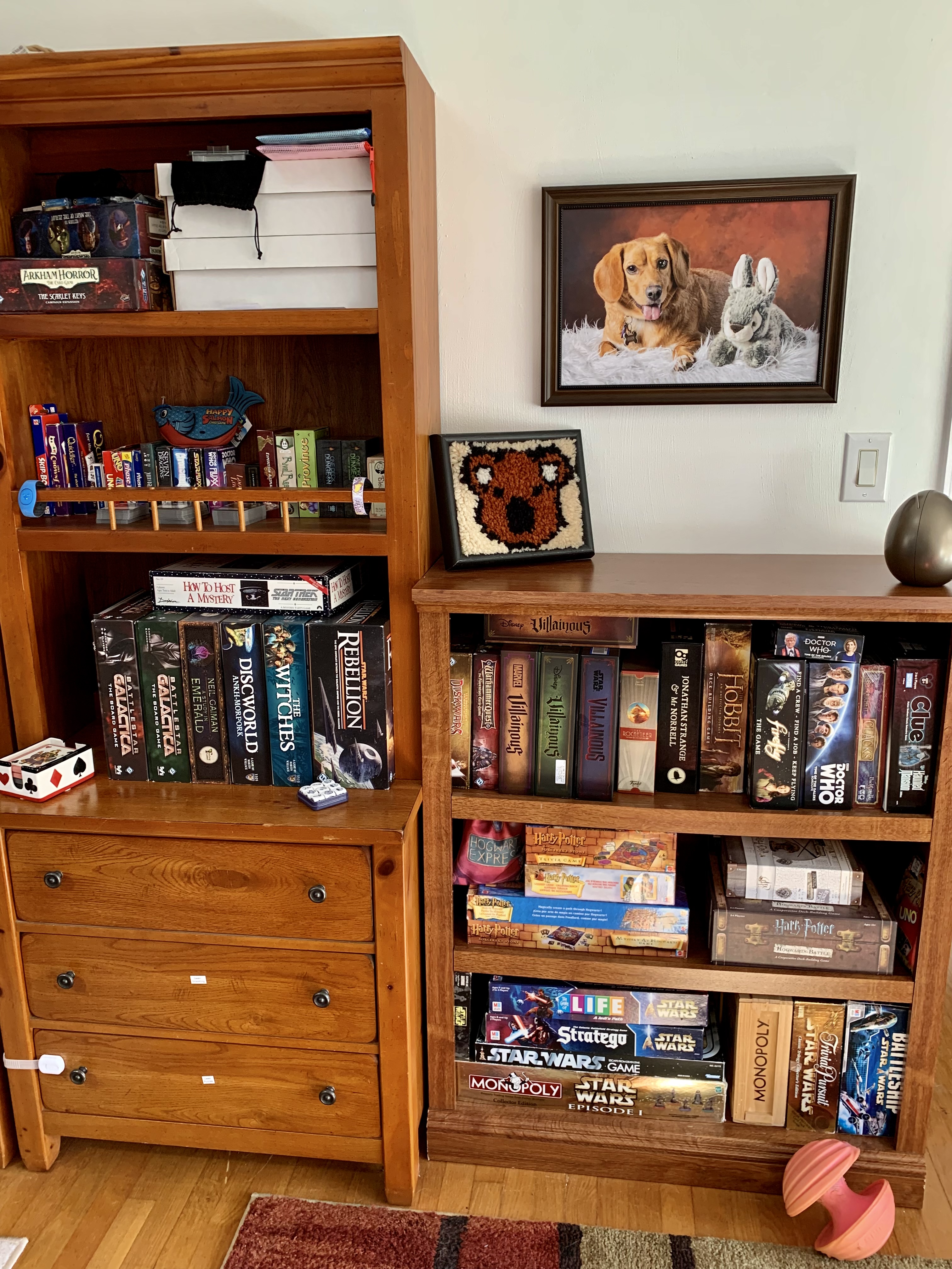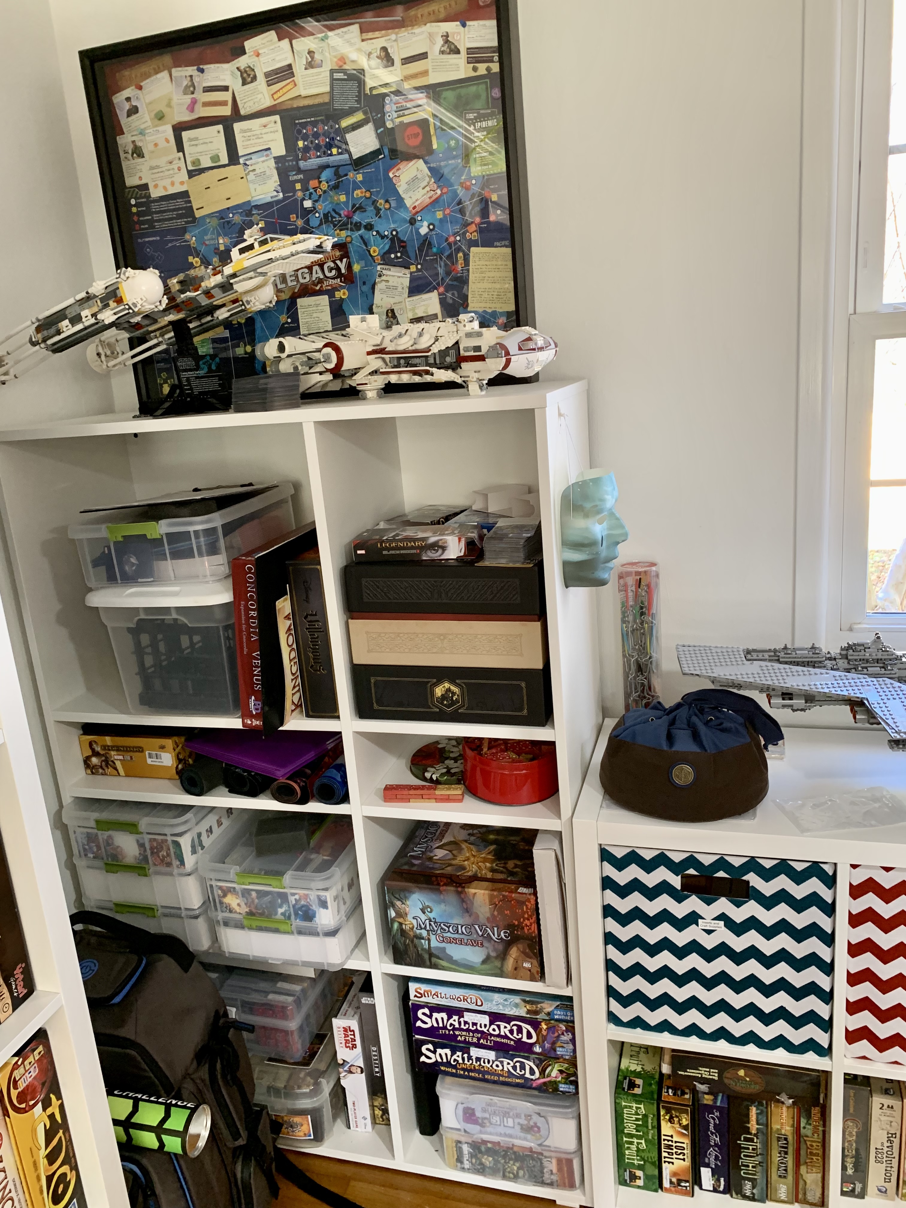 My husband’s and my board game room at our new house isn’t completely done (e.g. the SHUX posters are currently resting on a shelf and leaning against the wall waiting to be hung up), but it is close enough to done that it seems worth sharing pictures. It is a big room and a shared space, mostly board game room with a partial sitting area / dog zone. It’s impossible to get photos of everything in one go, so you get lots of pictures.