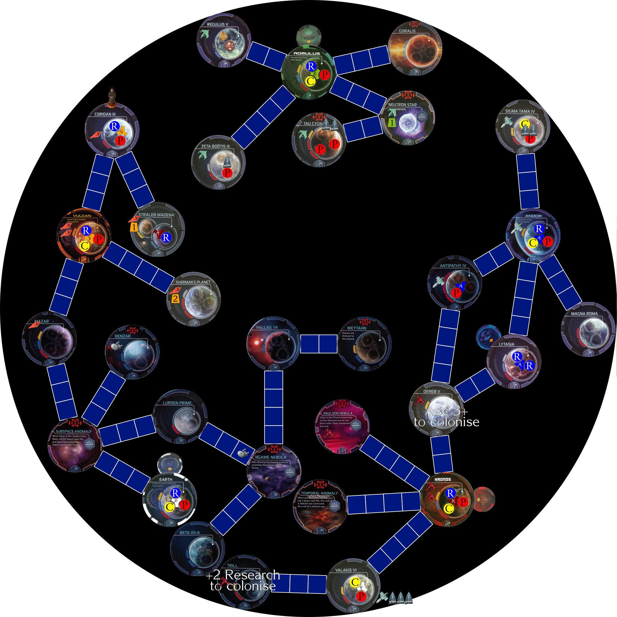 Colonise Regulus V (-1 ship, -1C then +1P and +1C from colonising the pre-warp civilisation).