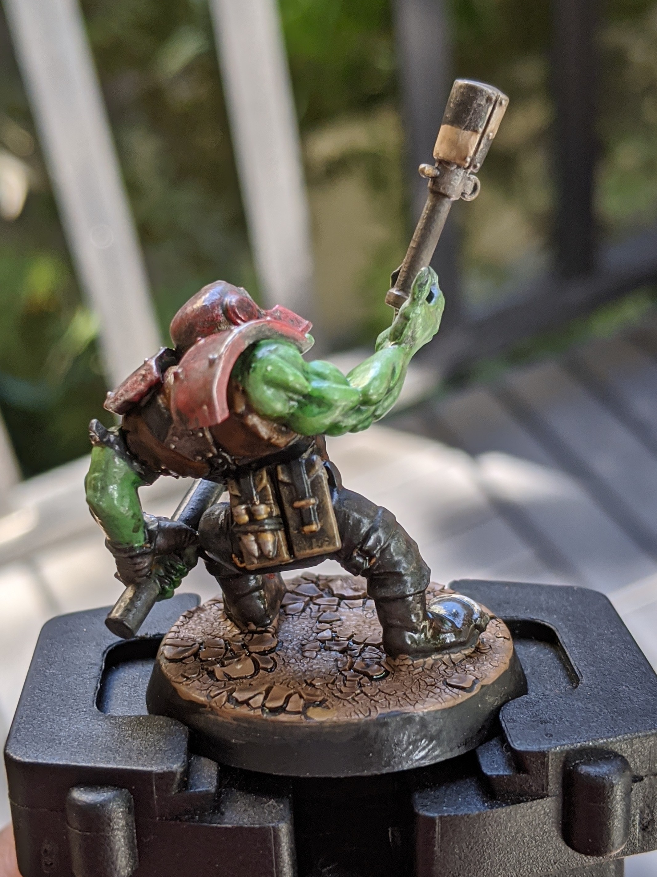 I “learned” a hard lesson last night. Got the finishing touches done on my Ork, sealed him up and left him to dry over night.