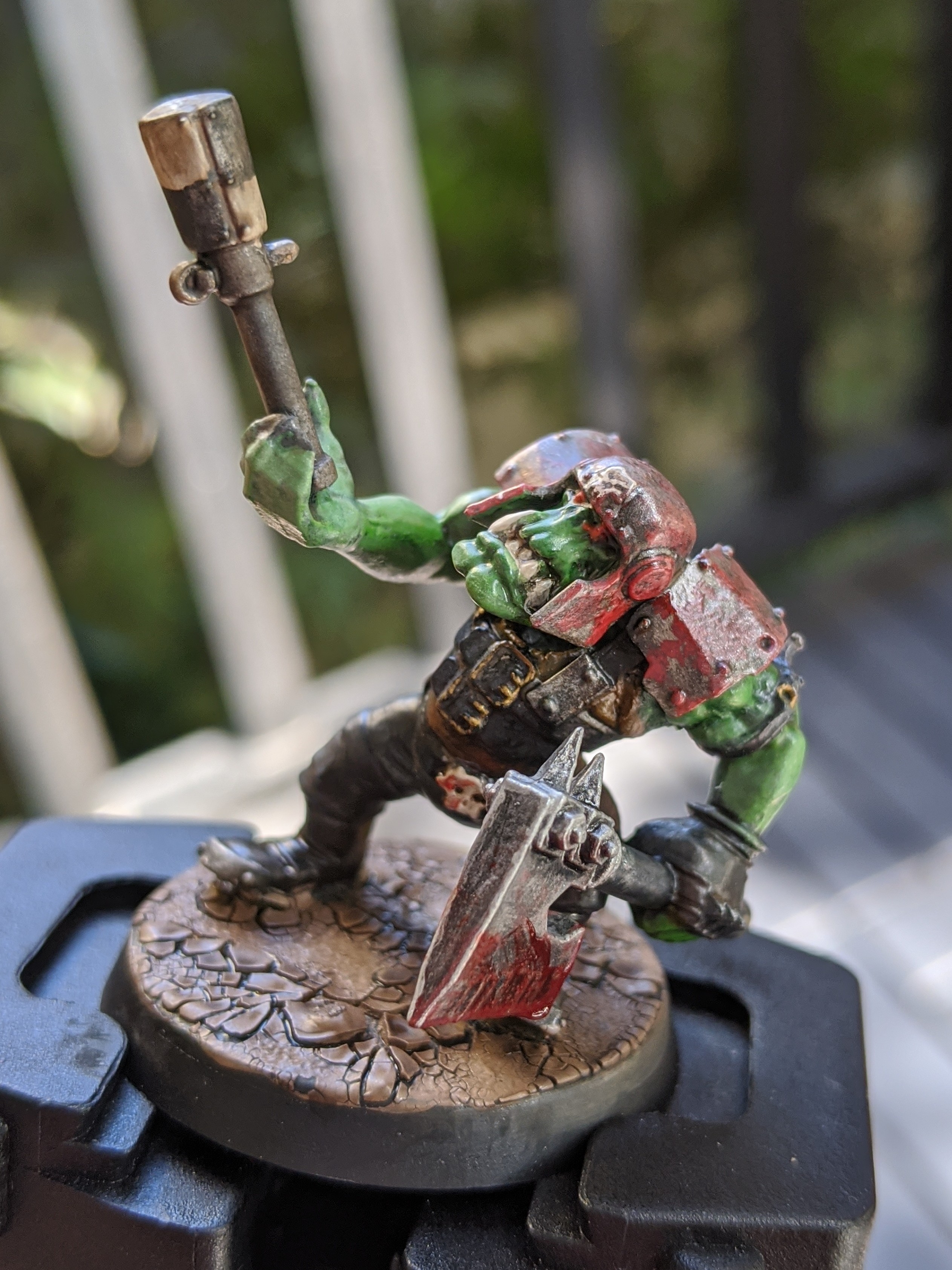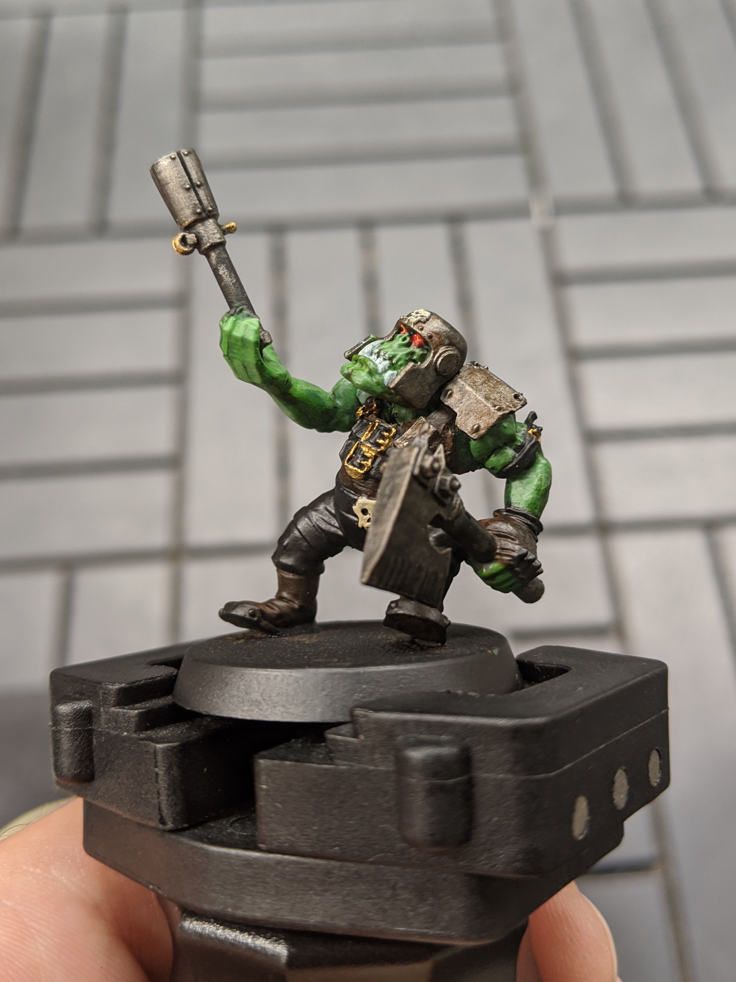 Lots more still to do on this little bugger, but I got a short window of time to paint yesterday! I got 4 other Nobz all set with their skin based (future me note: skin last next time), and started working on this Boy for future reference.