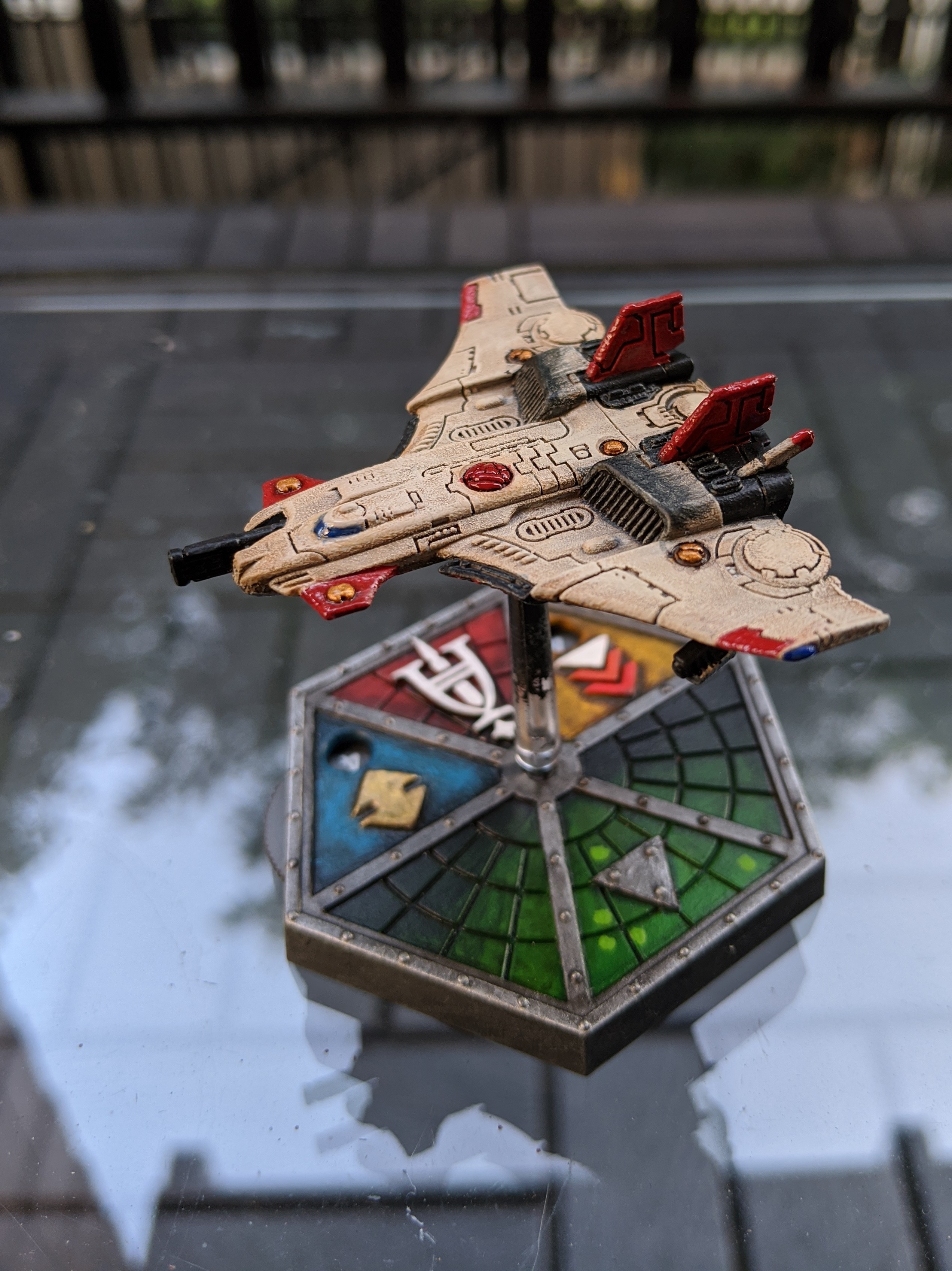 [EDIT] I’m going to wait until I have at least one plane painted and mounted before making a decision, but I think the base might be a little too noisy for my tastes with the gaudy motif. Certainly with a grey model on it, I’m not loving the effect.