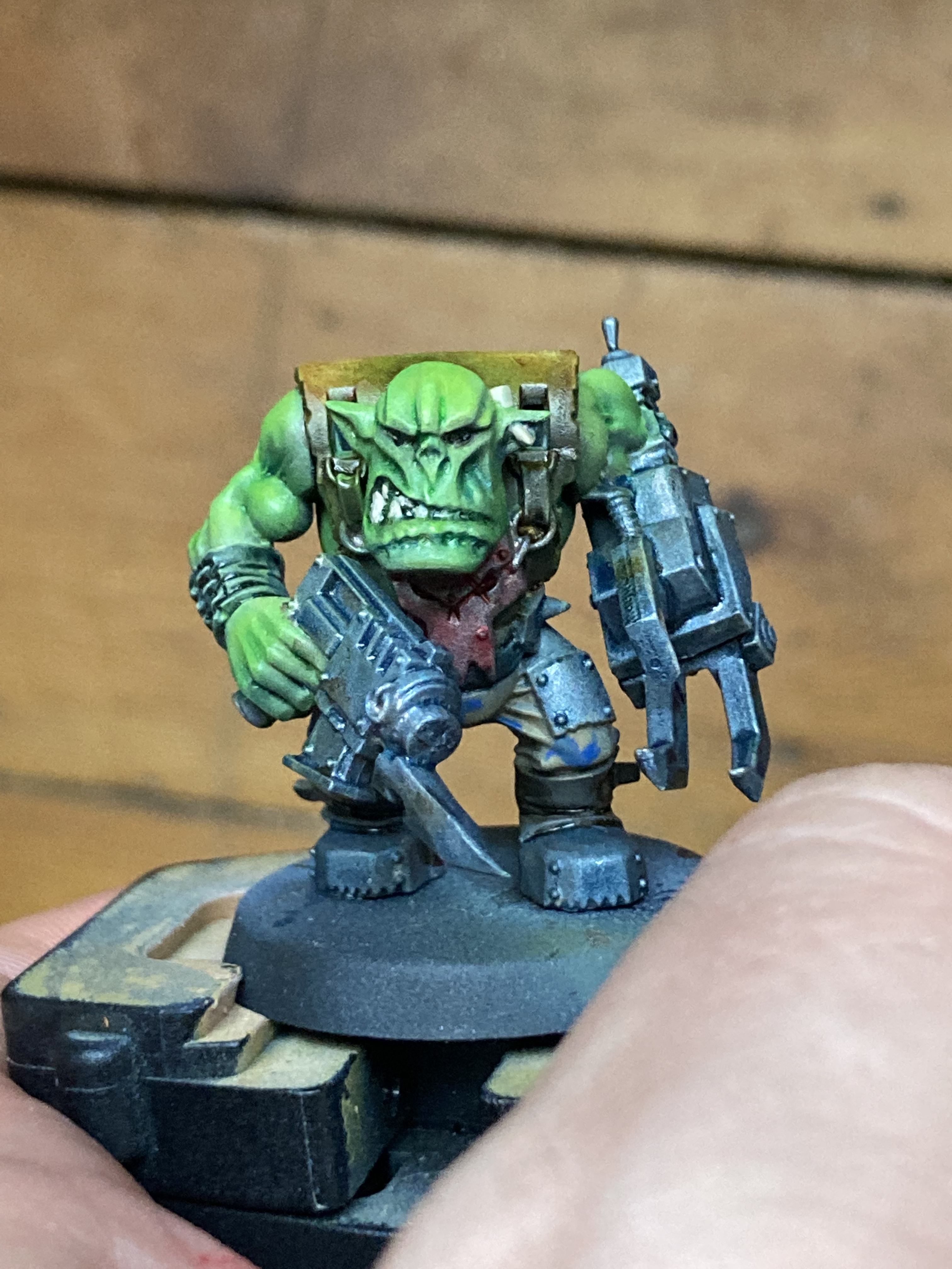 This green skin was done roughly around this video from NJM. Pleasingly what I’ve done so far was around 45 minutes with airbrush cleaning. So next up I will attempt some oil washes just to learn them. Orks really are the speed painters dream.
