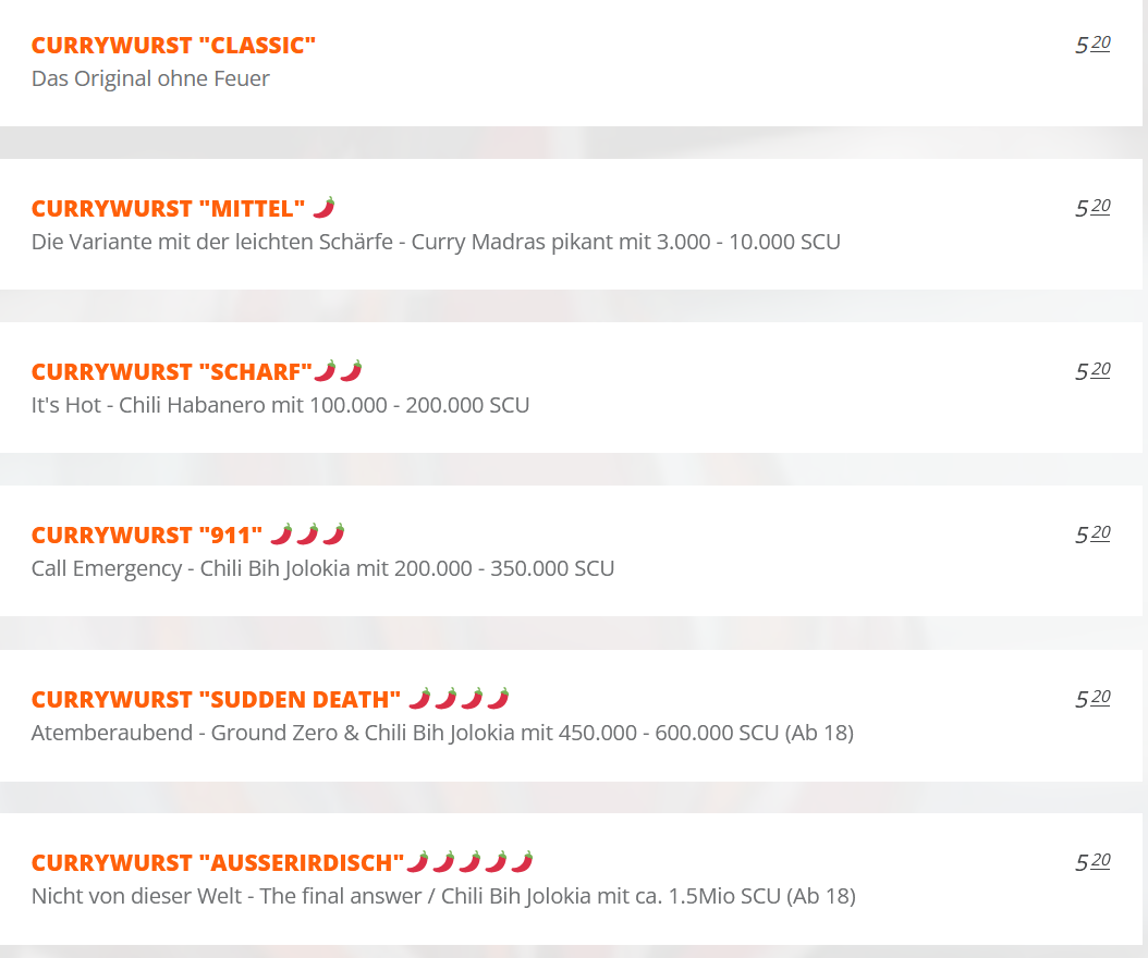 In any case the local currywurst shop has a list of heat levels on their menu and once upon a time I would go as high 911.