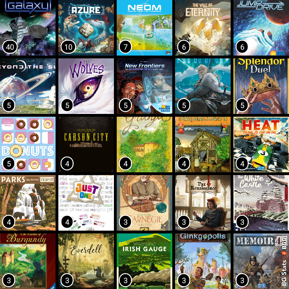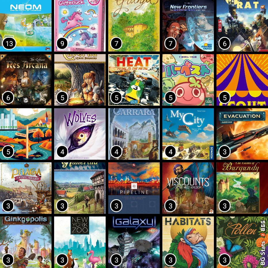 Notable were Carnegie, Carson City, Irish Gauge, Everdell, Grand Austria Hotel, and Feast for Odin. Here I’ll nod to Carnegie. My first run through was so-so - serviceable but I don’t need it. After cutting my teeth on New Frontiers and La Granja, which share some of the decision space, and coming back, this leapt up to top shelf material for me. It’s a dense session but you get out what you put in, and the exhilaration of your engine exploding is the real deal.
