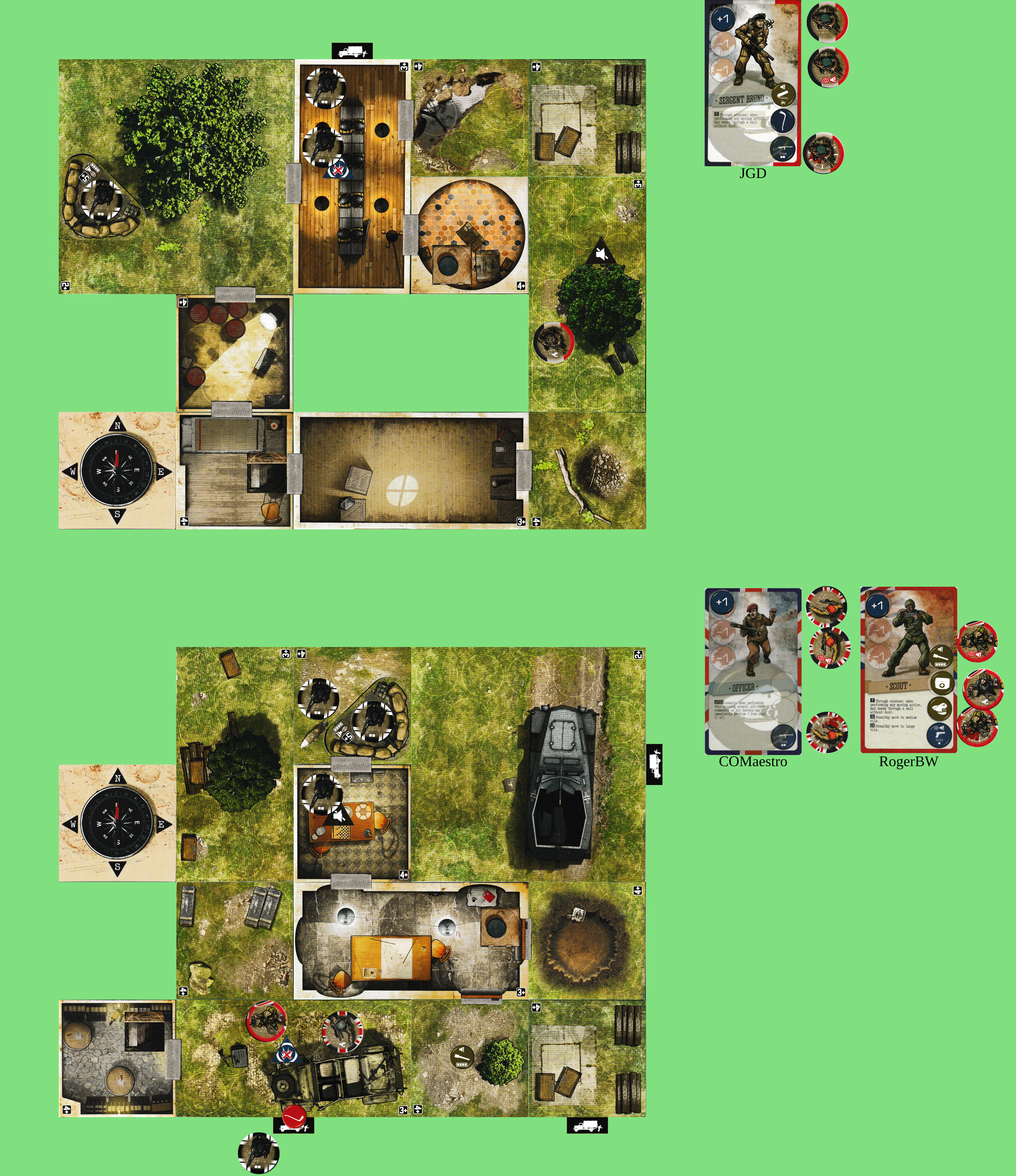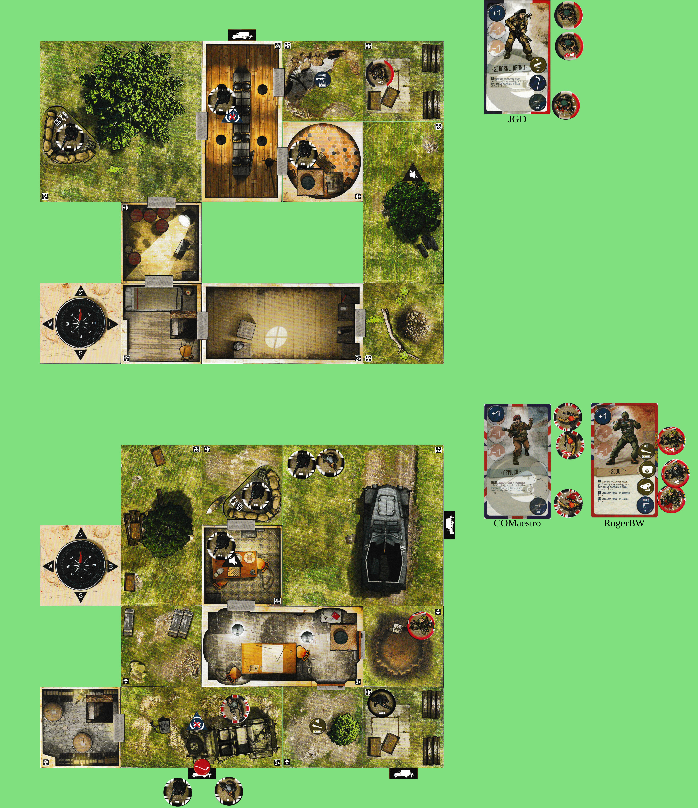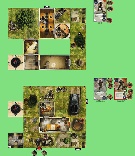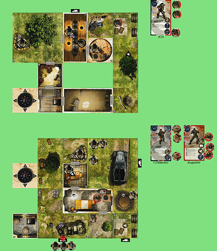 I think the best bet is for me to rejoin you, then wall-hop out of the central exit room when it’s time to do the thing. ([1] gets in blatantly, [2] does the objective, [1] gets out again becoming stealthy, then we have to survive one turn of reinforcements before we get out.) So I’ll set up for that now, moving S W N.