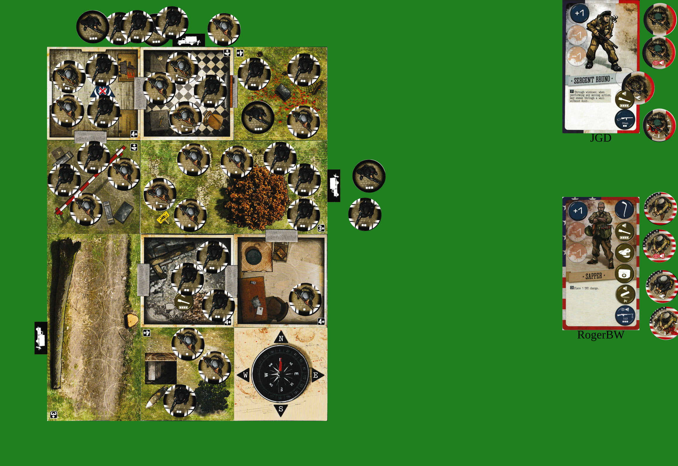 I think this is lots of stealthy shooting from Bruno to get us in; then over the next couple of turns I’ll try to get round into the southern small tiles and start shooting people to take the pressure off the enemy bag.