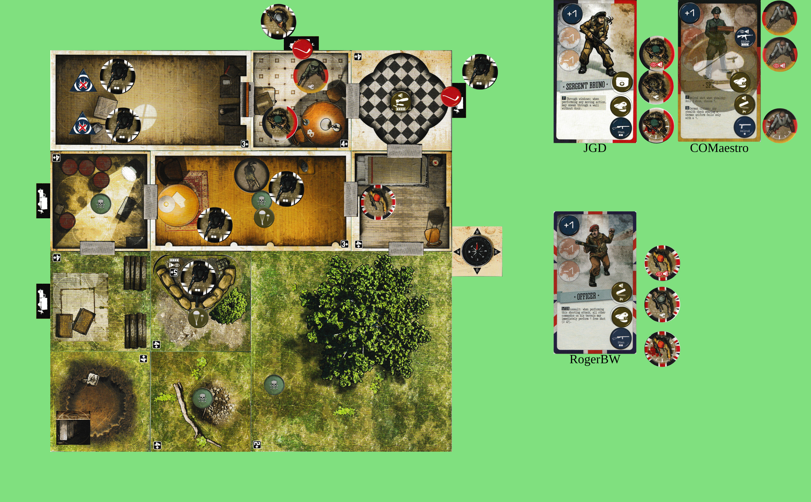 Bruno can hop N and then back S, but hasn’t the actions to do anything else. If he had a crowbar he could block the N entrance and stay there, but the Spy has it in the next room at present.