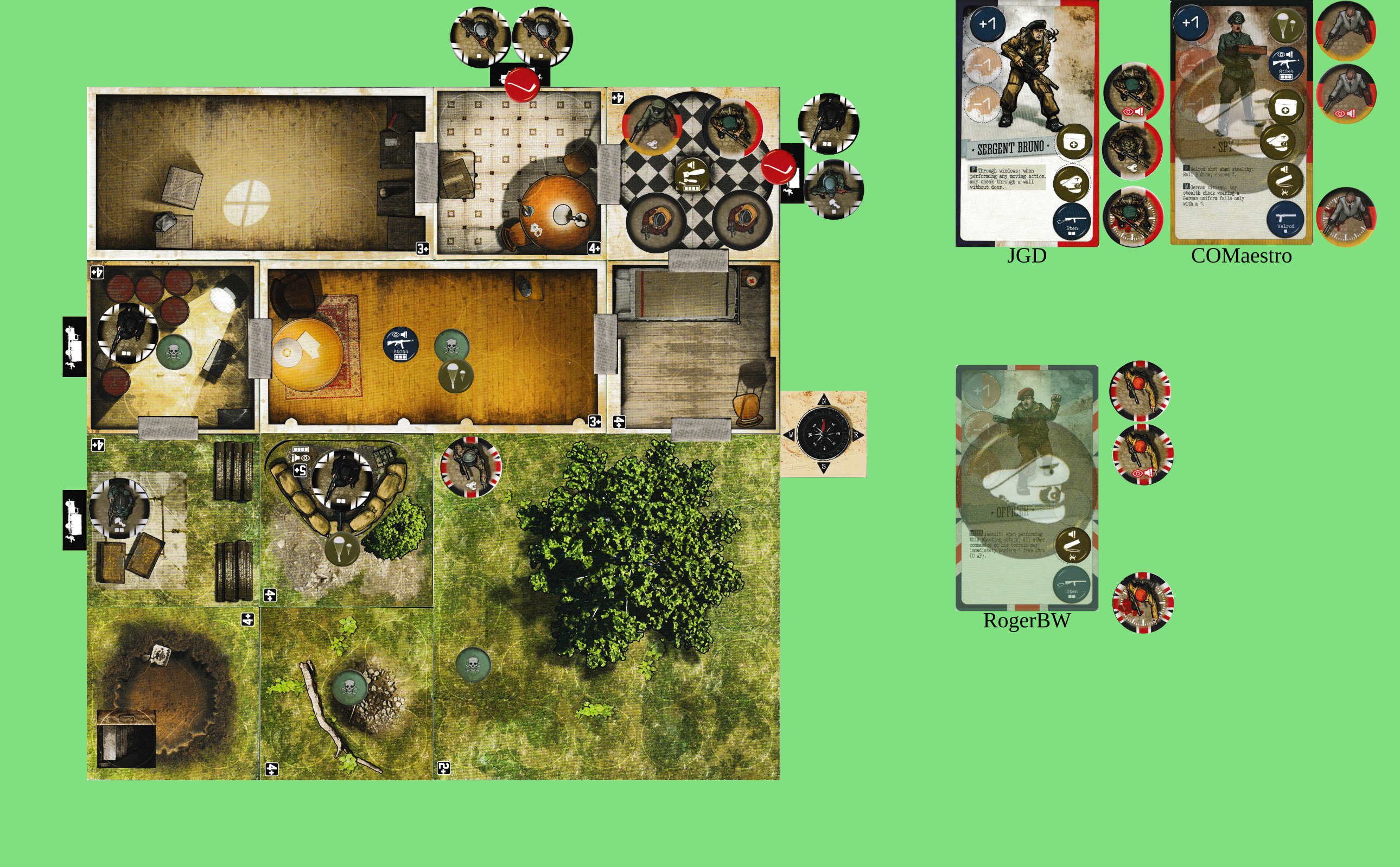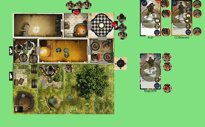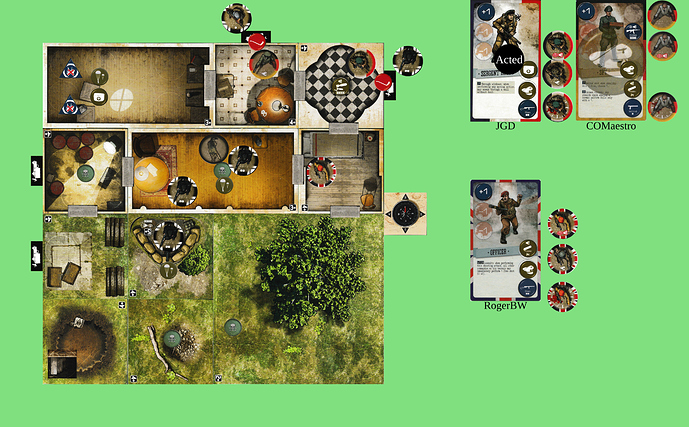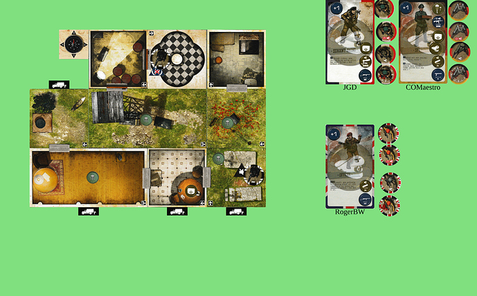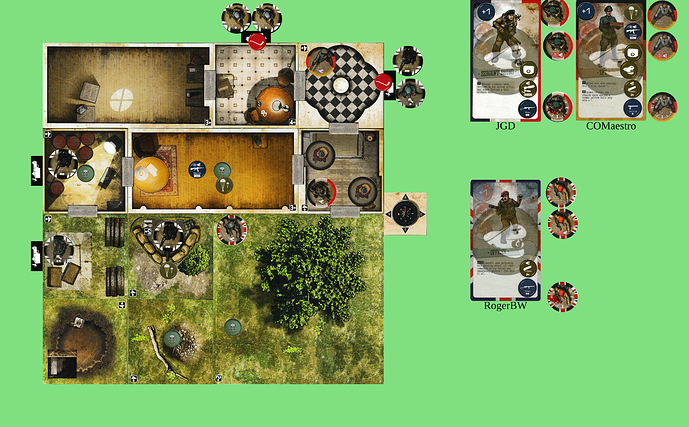 If so, we have to defend him instead. I believe there will be 4 enemies at the worst (current enemy in the SE tile, reinforcement from that same tile, reinforcement from N door, and one from the SW door), right? In which case, two of us go up, S, W and save our +1 to shoot at the enemies which will come from the W. The third shoots the poison barrel to the S, killing the existing enemy and the one who enters later.