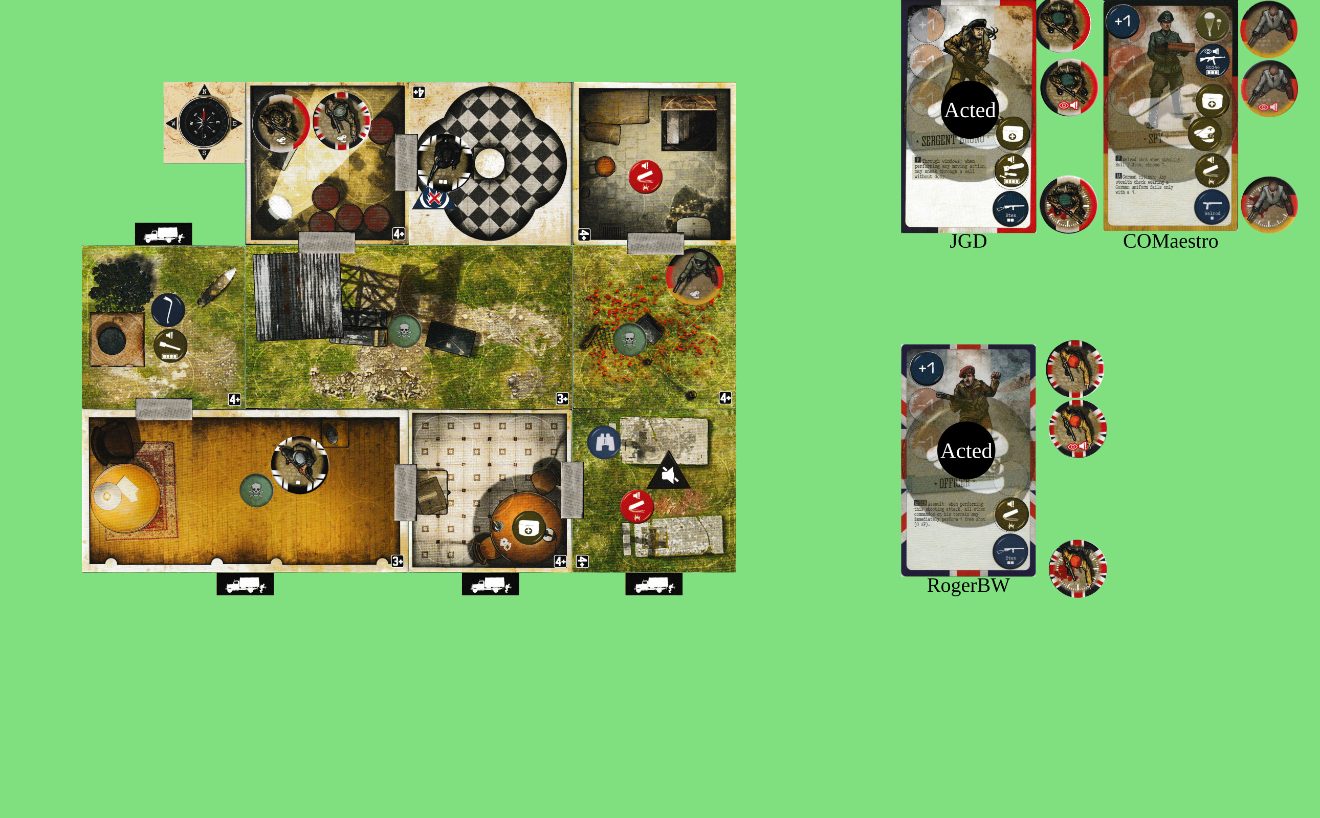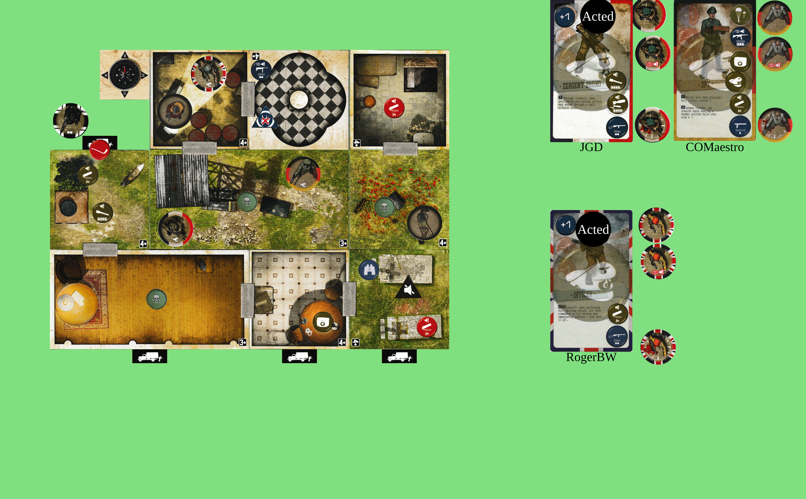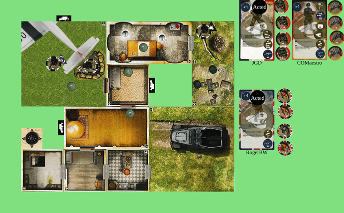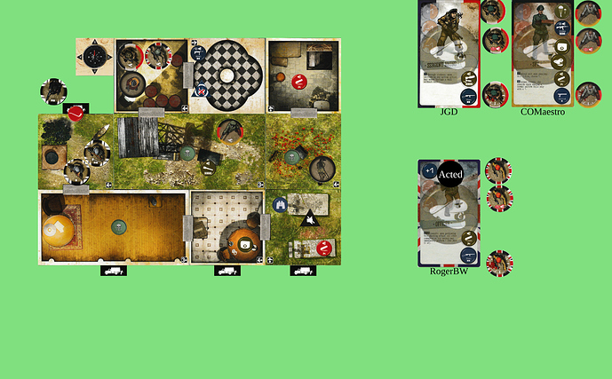 Hmm. Planning for future turns… If we were all in the NW spotlight room with +1AP and had a clear run, we could get out from our entry point. Alternatively, 3 AP each to get out to the W, +1 once to unblock the trapdoor, + whatever’s needed for shooting.