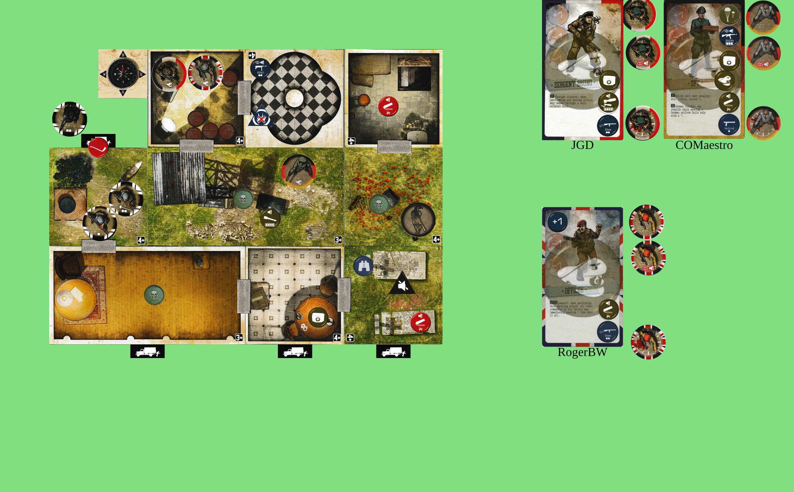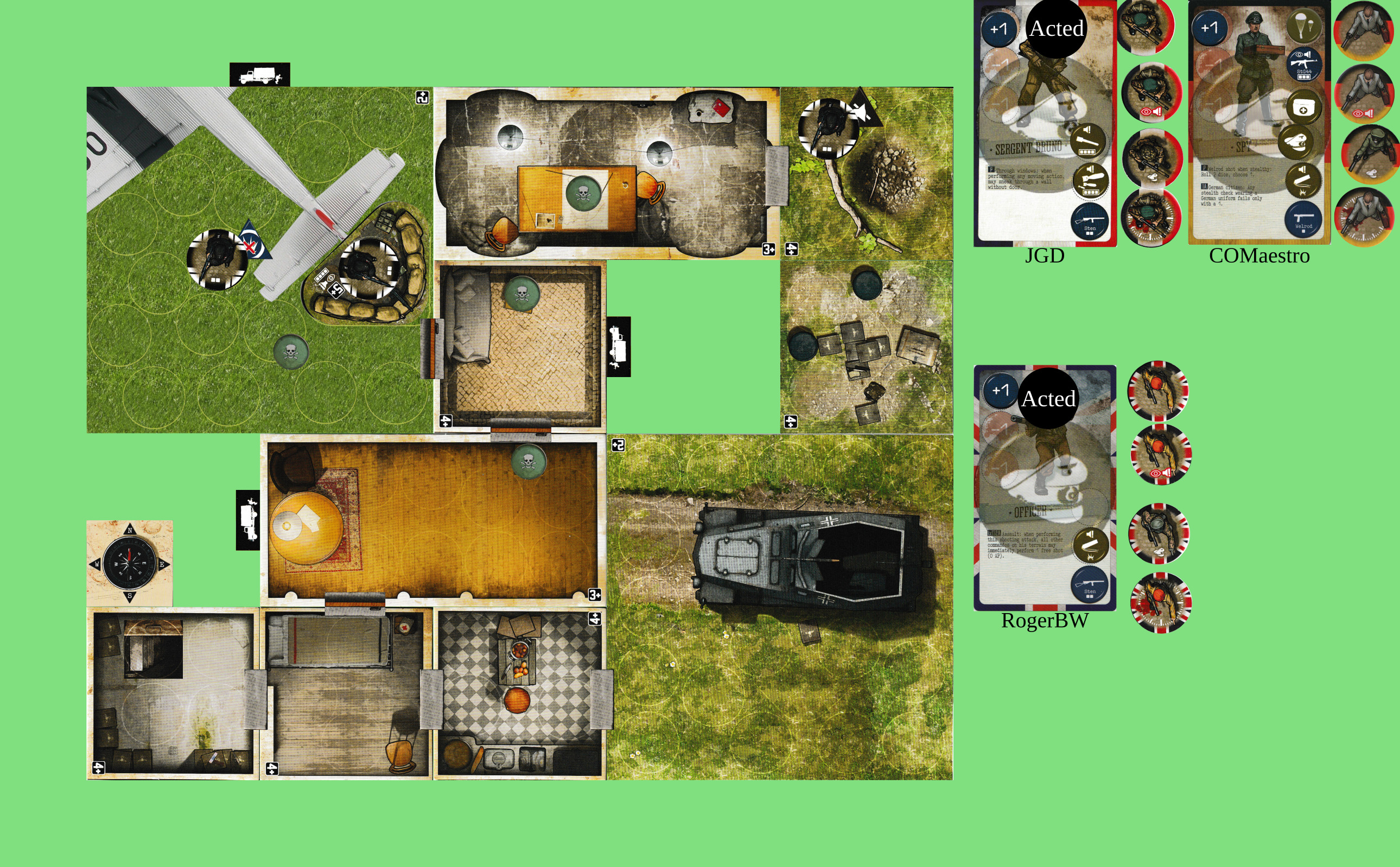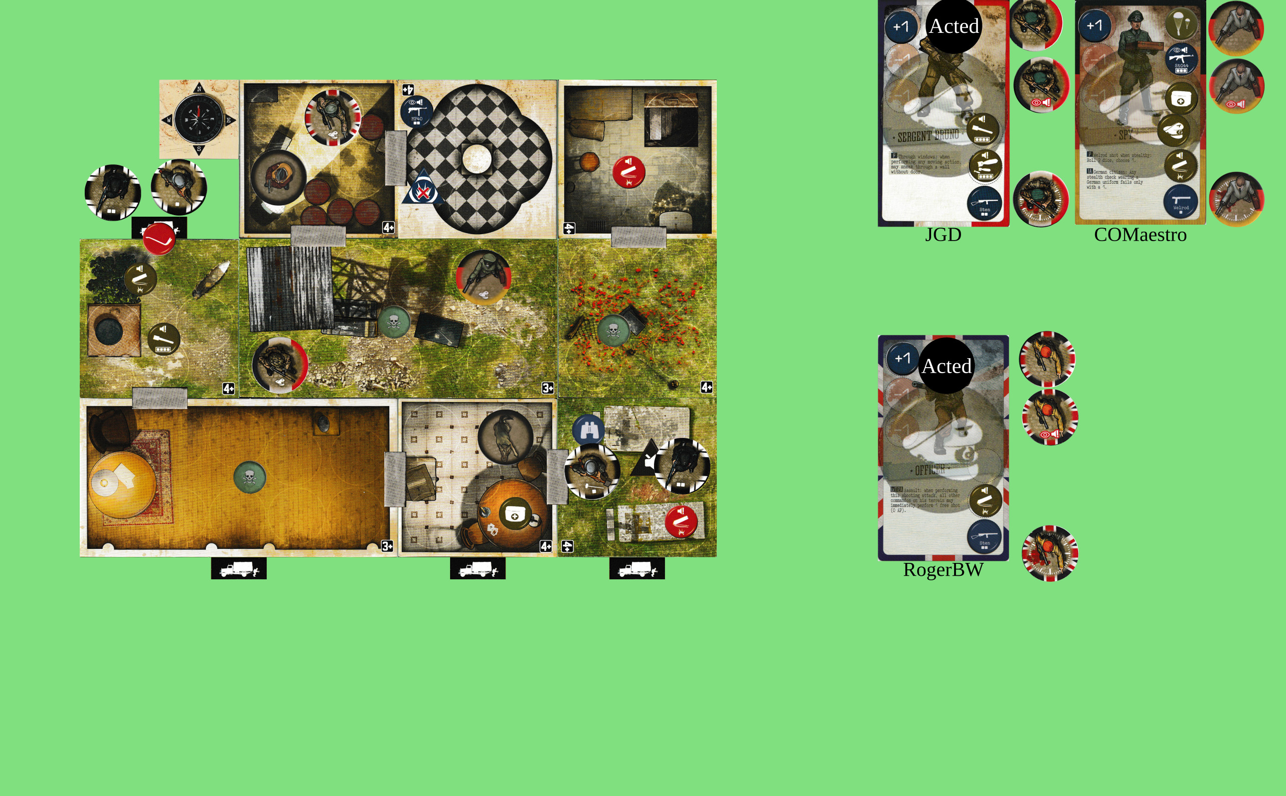 Hmm. Planning for future turns… If we were all in the NW spotlight room with +1AP and had a clear run, we could get out from our entry point. Alternatively, 3 AP each to get out to the W, +1 once to unblock the trapdoor, + whatever’s needed for shooting.