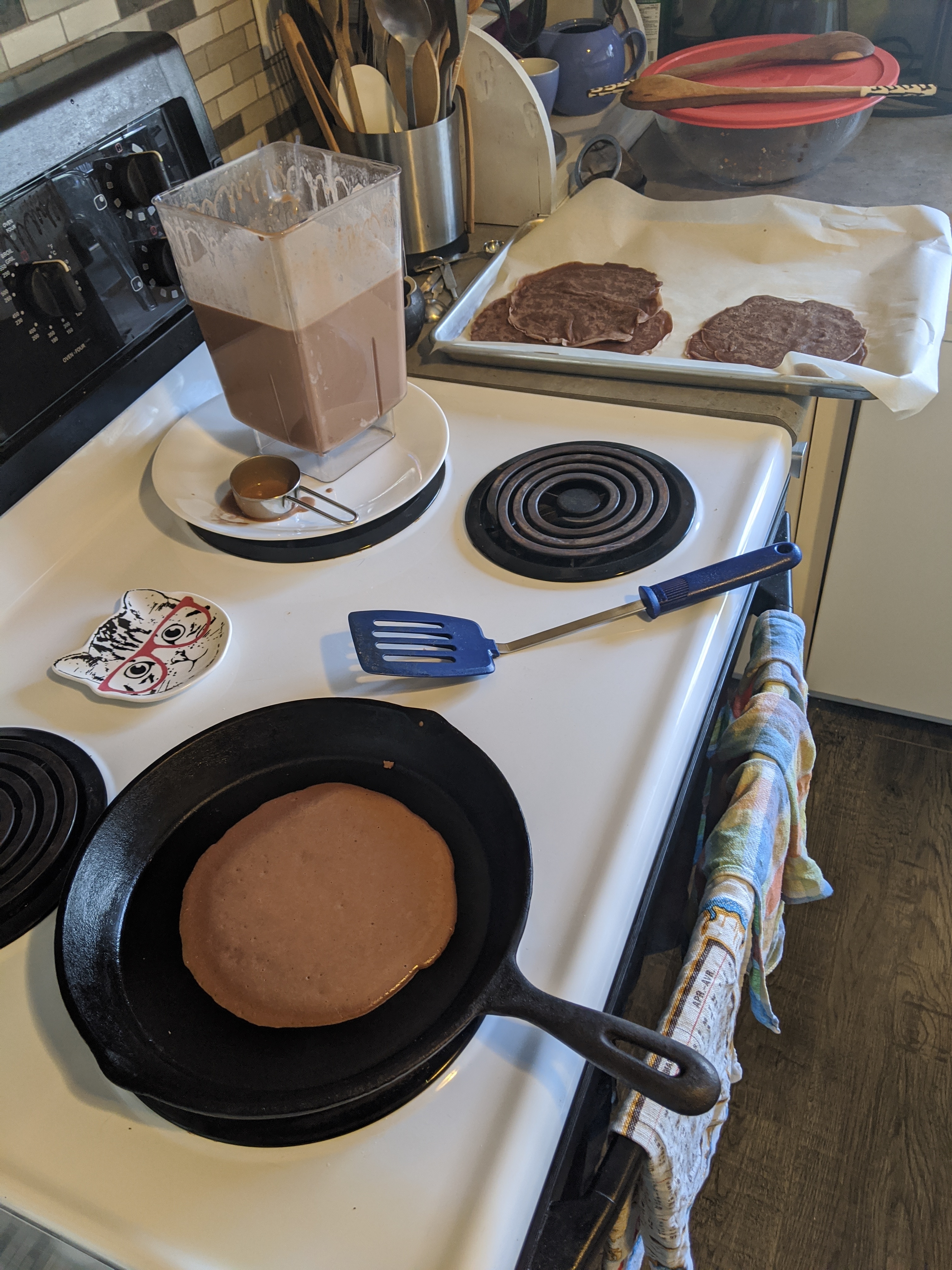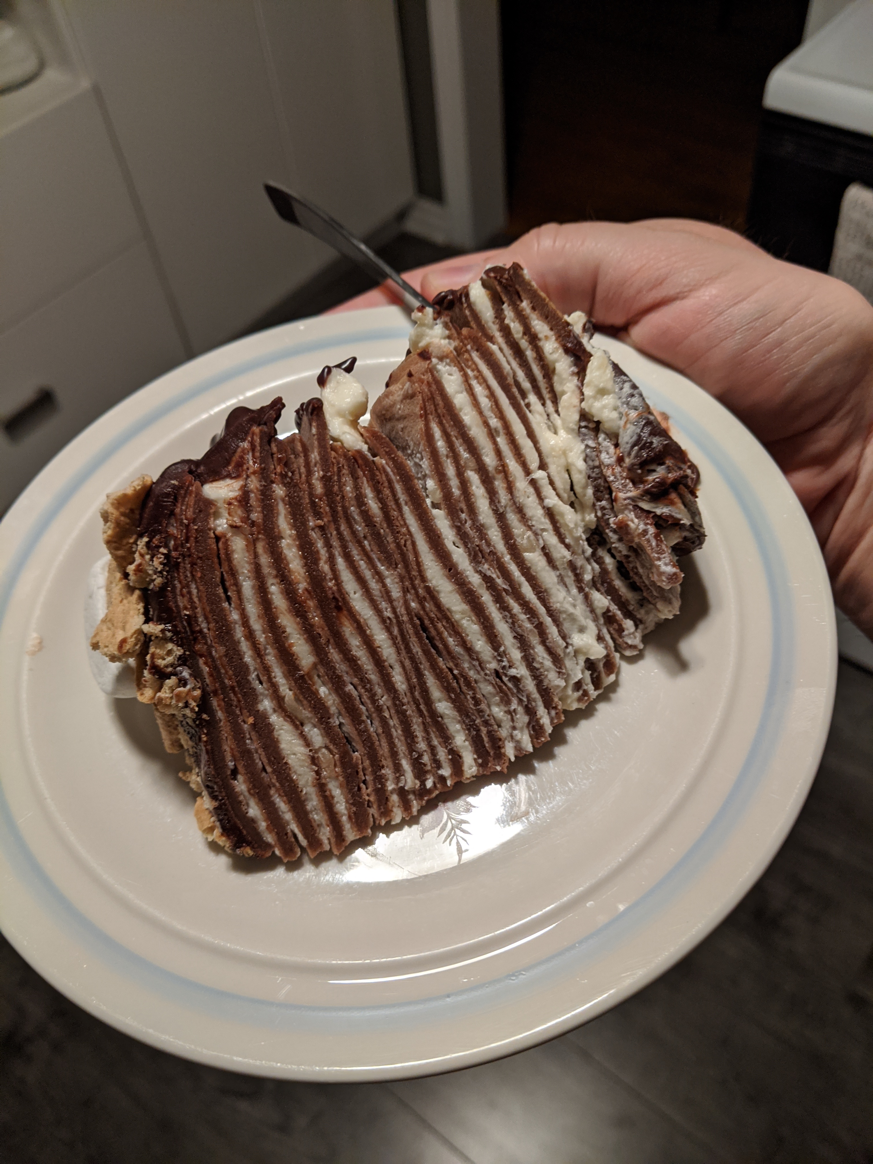 It’s tasty, but holy heck was it a lot of work. And a mess. Thankfully, I think I got most of the kinks out from last time, so the final crepe cake for her birthday (raspberry cream, I think) should go pretty well.