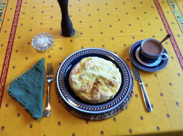 The omelet that I showed in my photograph was a soufflé omelet. I separated the eggs and beat the whites to firm-peaks stage, whisked the yolks until they went pale and beat in salt, pepper, and chopped parsley. Then I folded the yolk mixture into the beaten whites, poured the result into a medium-hot cast-iron frying pan with a bit of fried onion and ham in it, put a lid on, and returned it to a very low heat. When the force of the omelet rising lifted the lid of the pan I removed the lid, sprinkled grated cheese on top of the omelet, and slid it under a hot grill to set the top. The whole thing slipped out of the pan onto my plate.