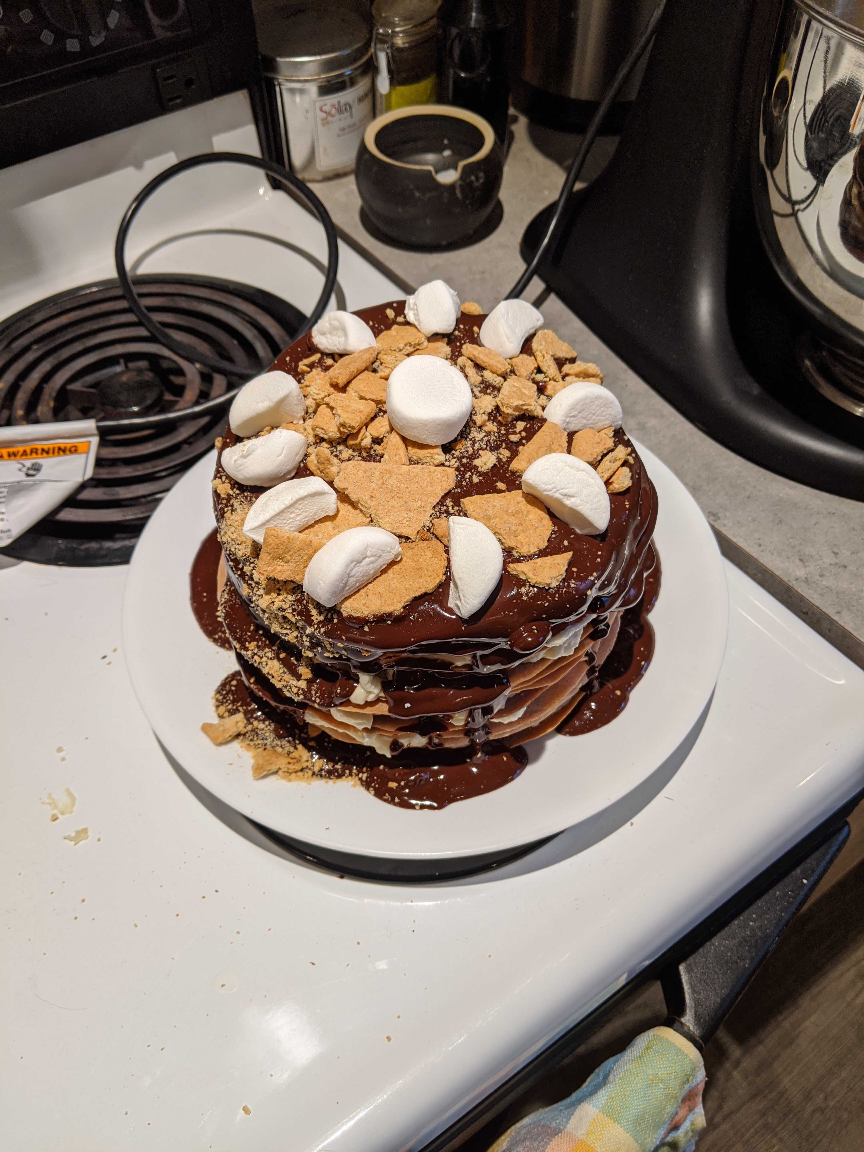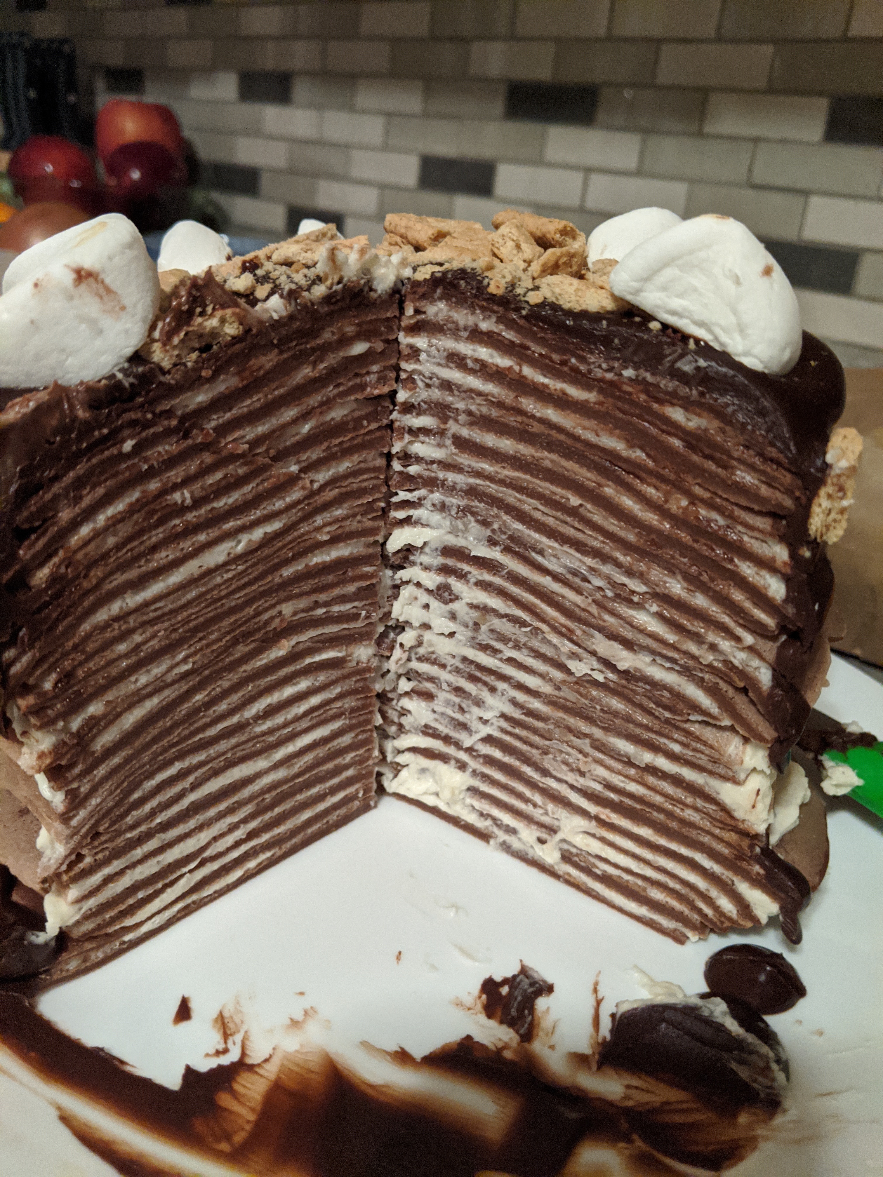 The entire assembly took me… 8 hours? More or less. 32 crepes for a total of 65 layers (32 crepes, 32 “marshmallow buttercream”, top crepe) and then covered in chocolate ganache, crumbled graham crakers, and a few marshmallows (a few of which I toasted with matches because why not, but after I took the picture).